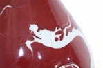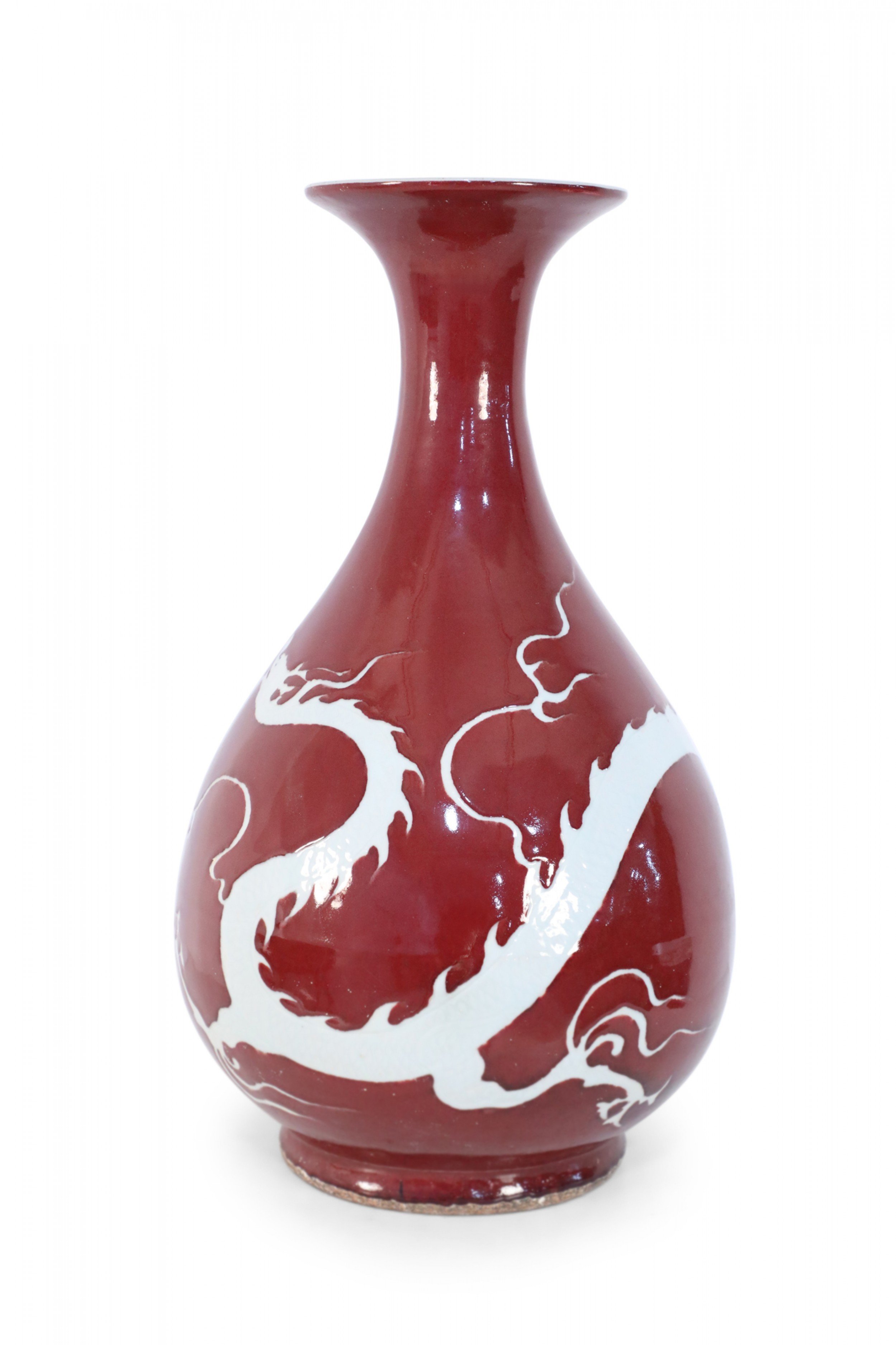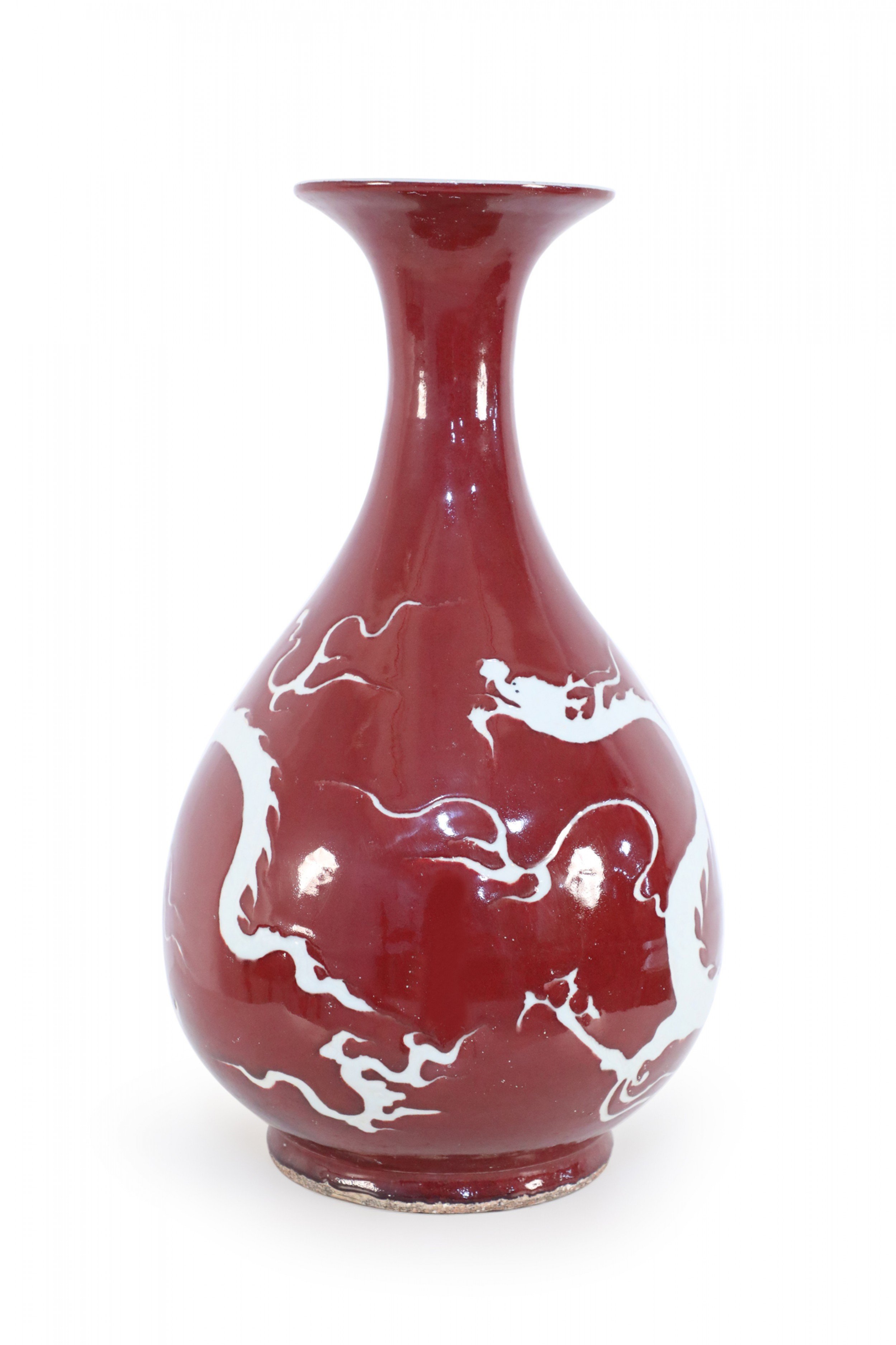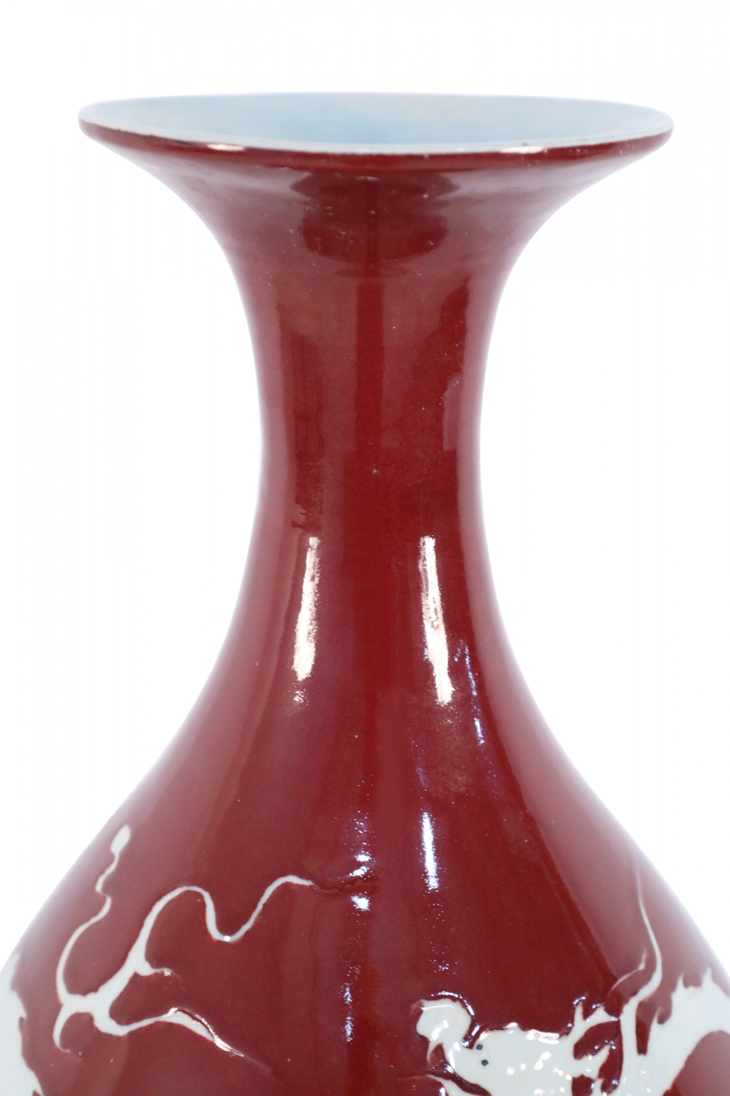 PAIR of Chinese ceramic burgundy vases decorated with the white silhouettes of dragons wrapping around their pear-shaped forms (PRICED AS PAIR).