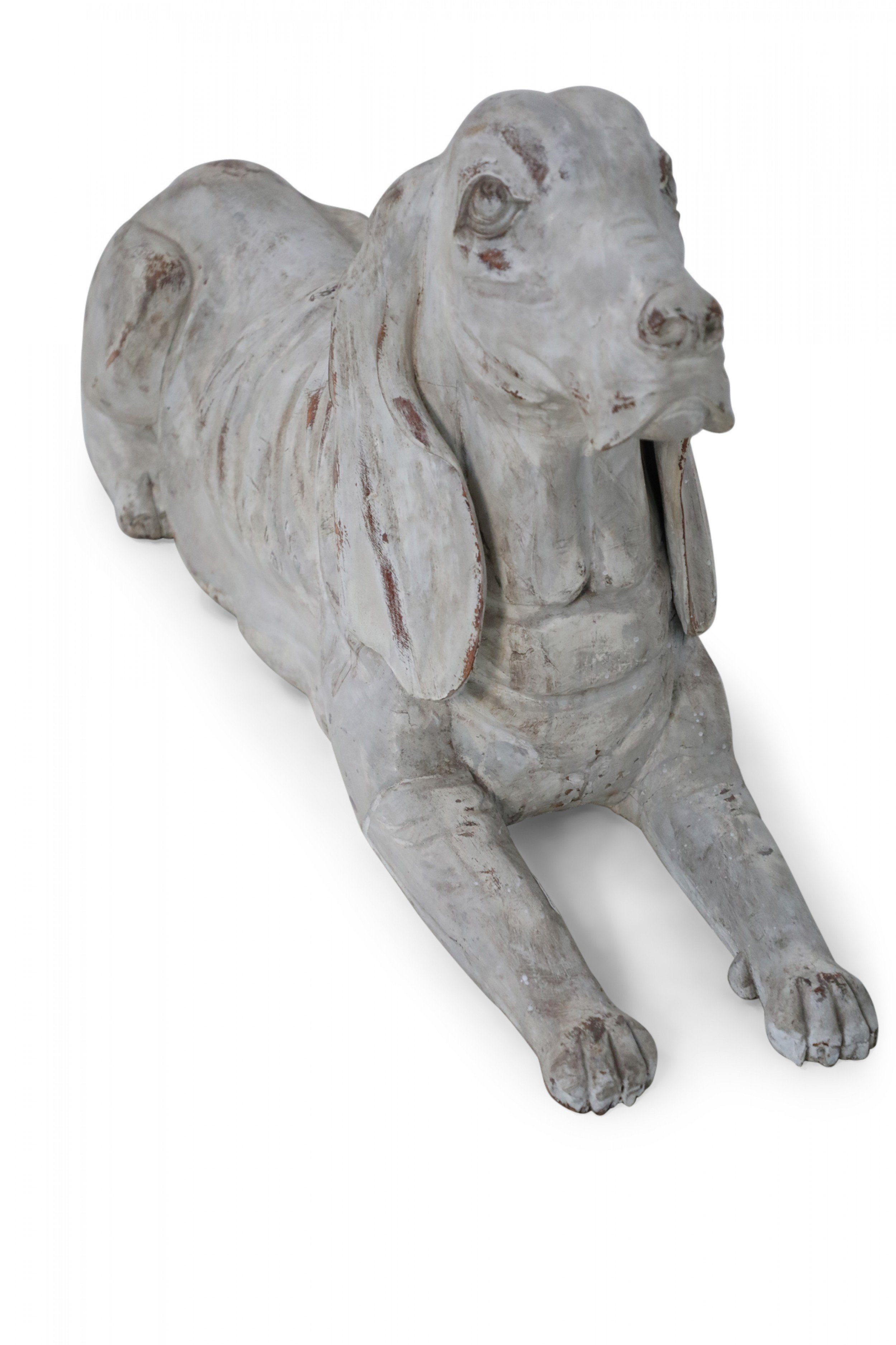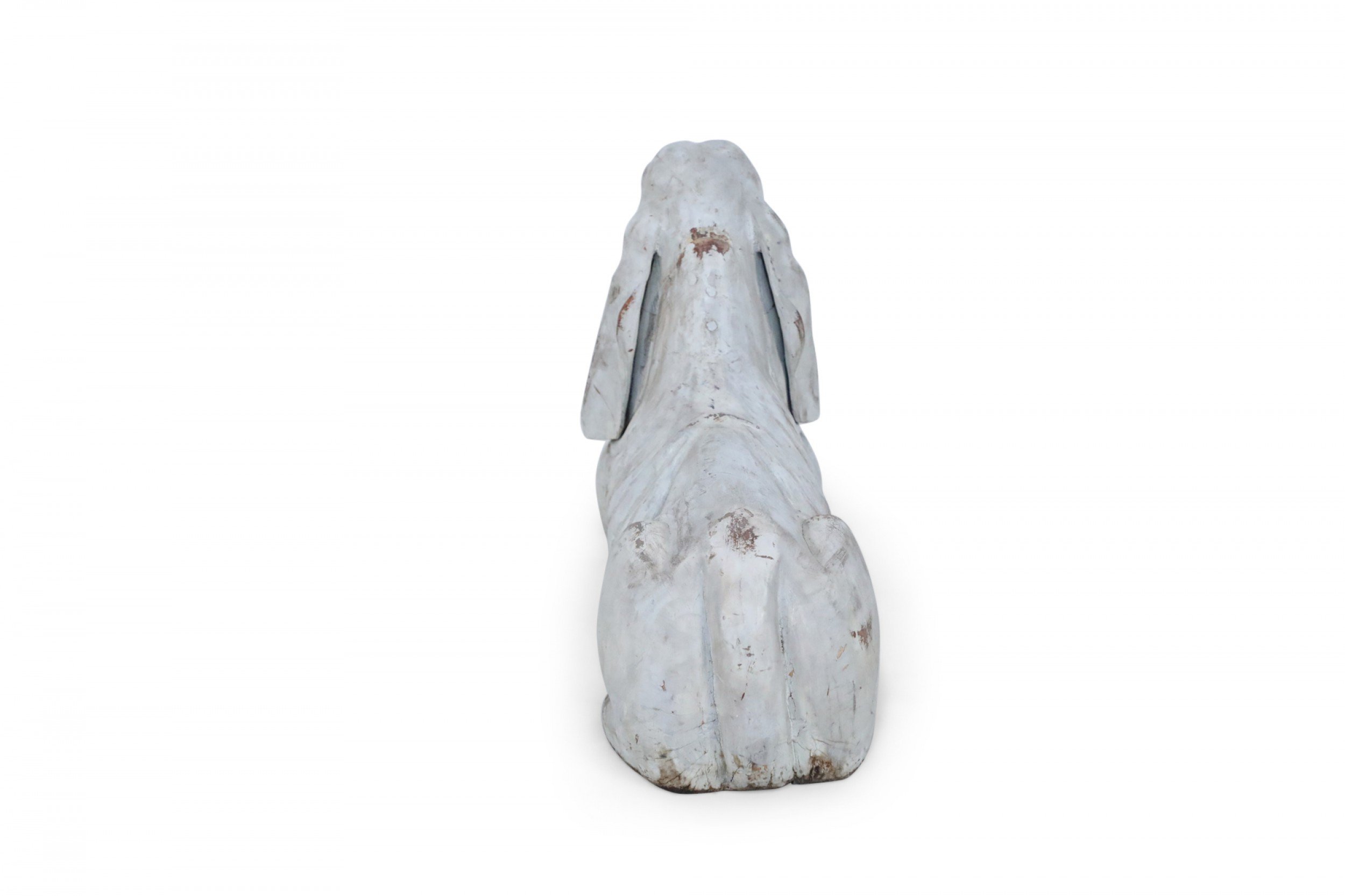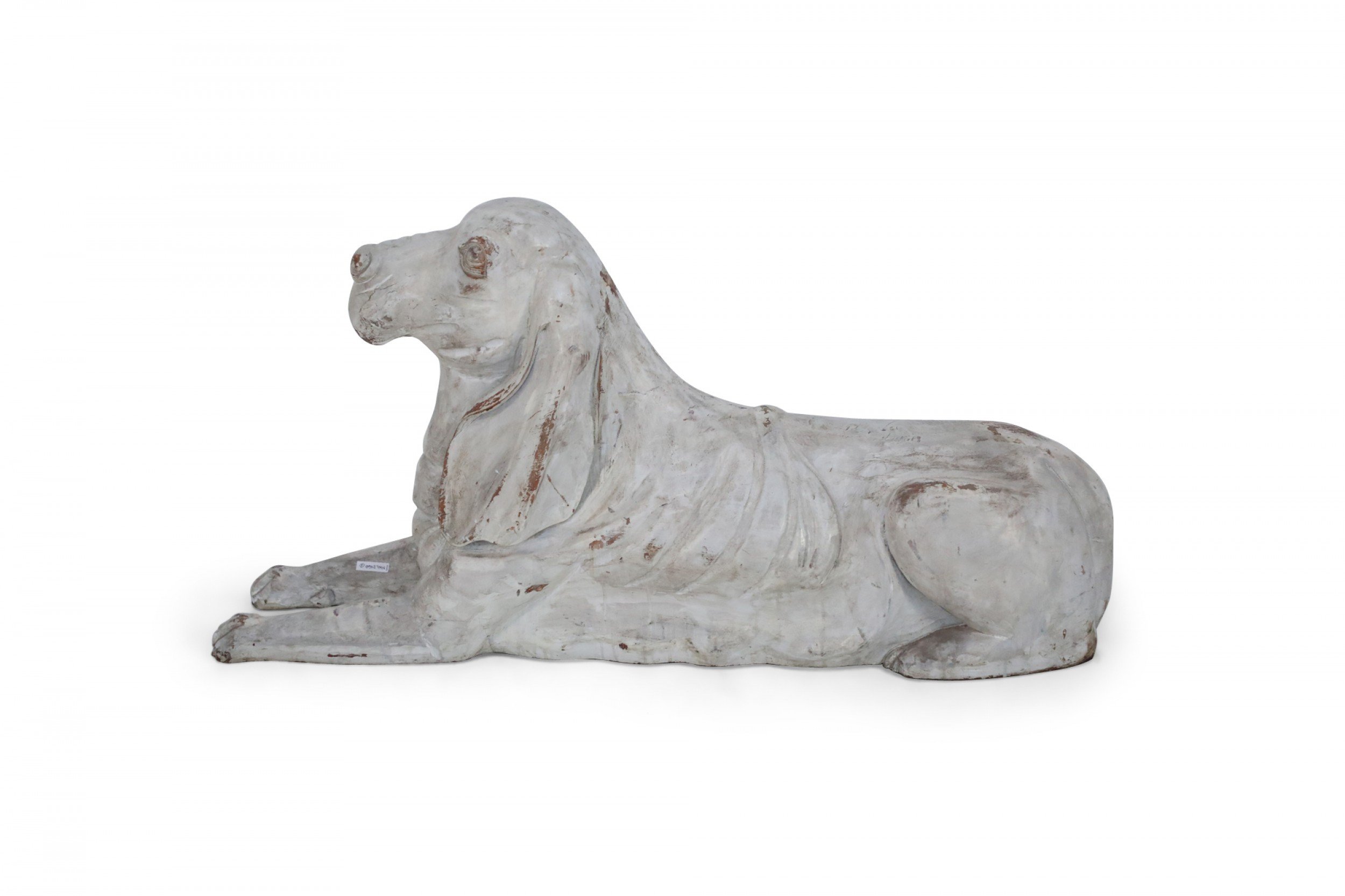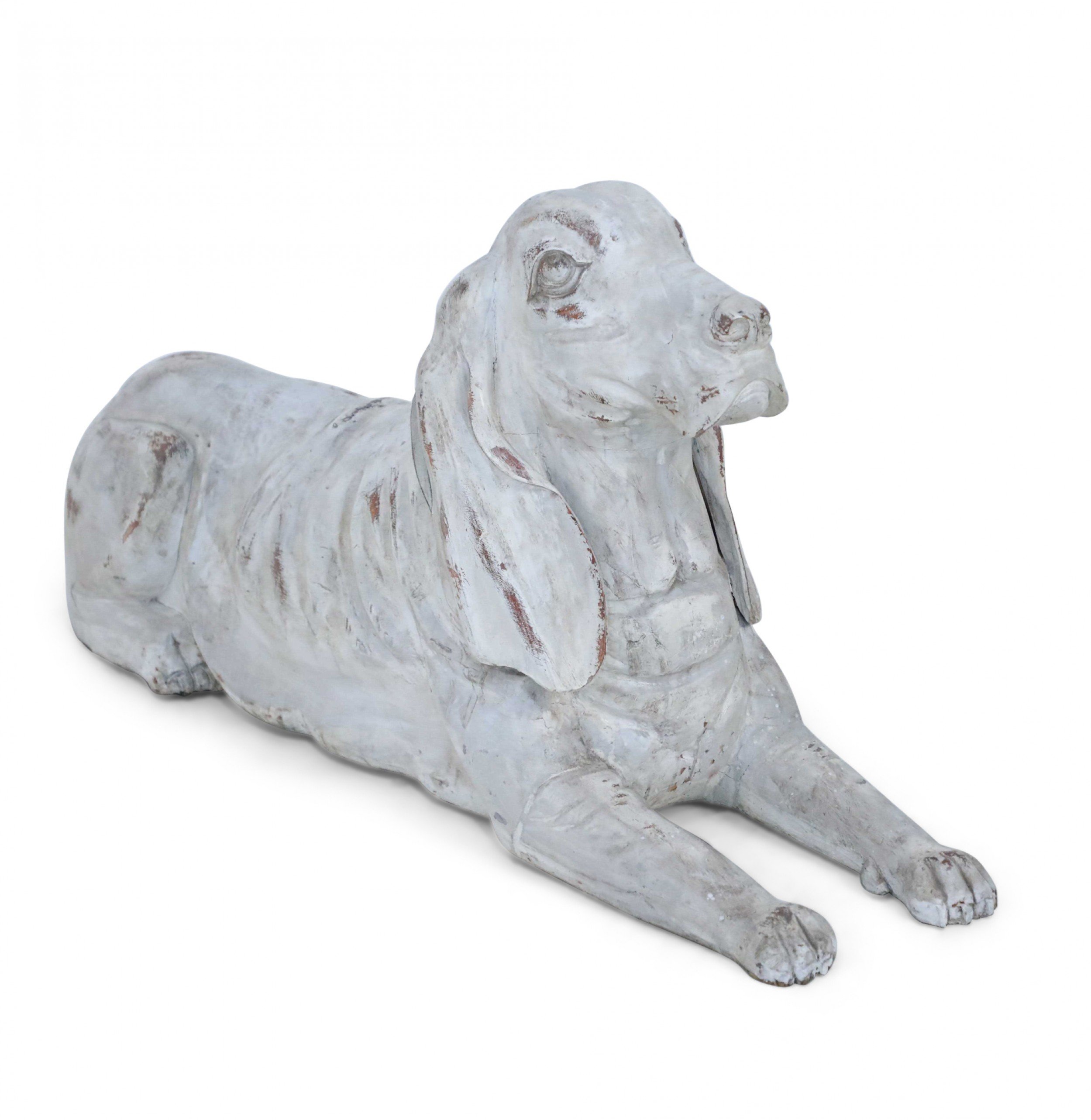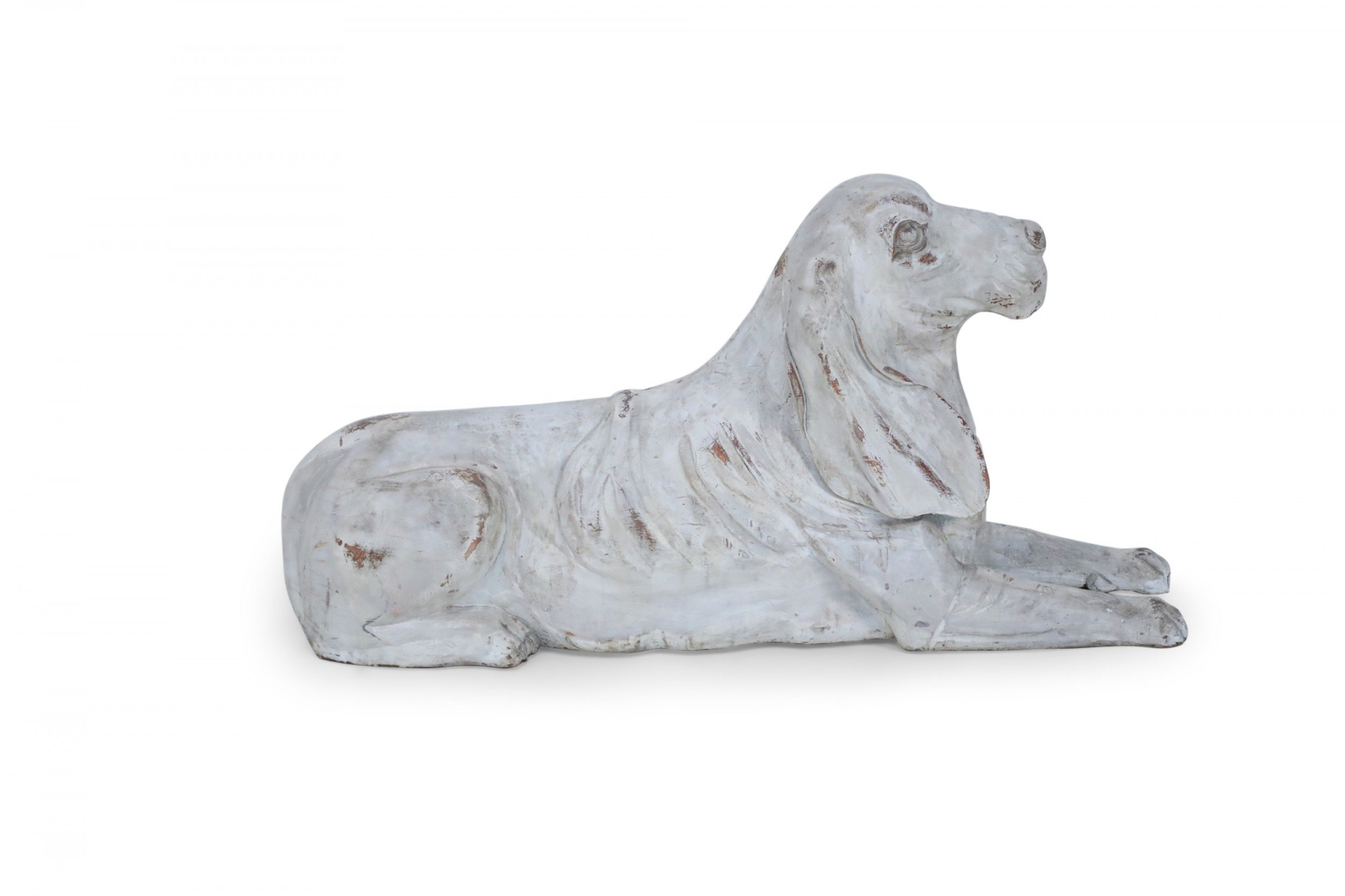 PAIR of Chinese carved wooden reclining dogs painted with whitewash finishes (PRICED AS PAIR)(Similar statues: NWL2458, NWL2459)