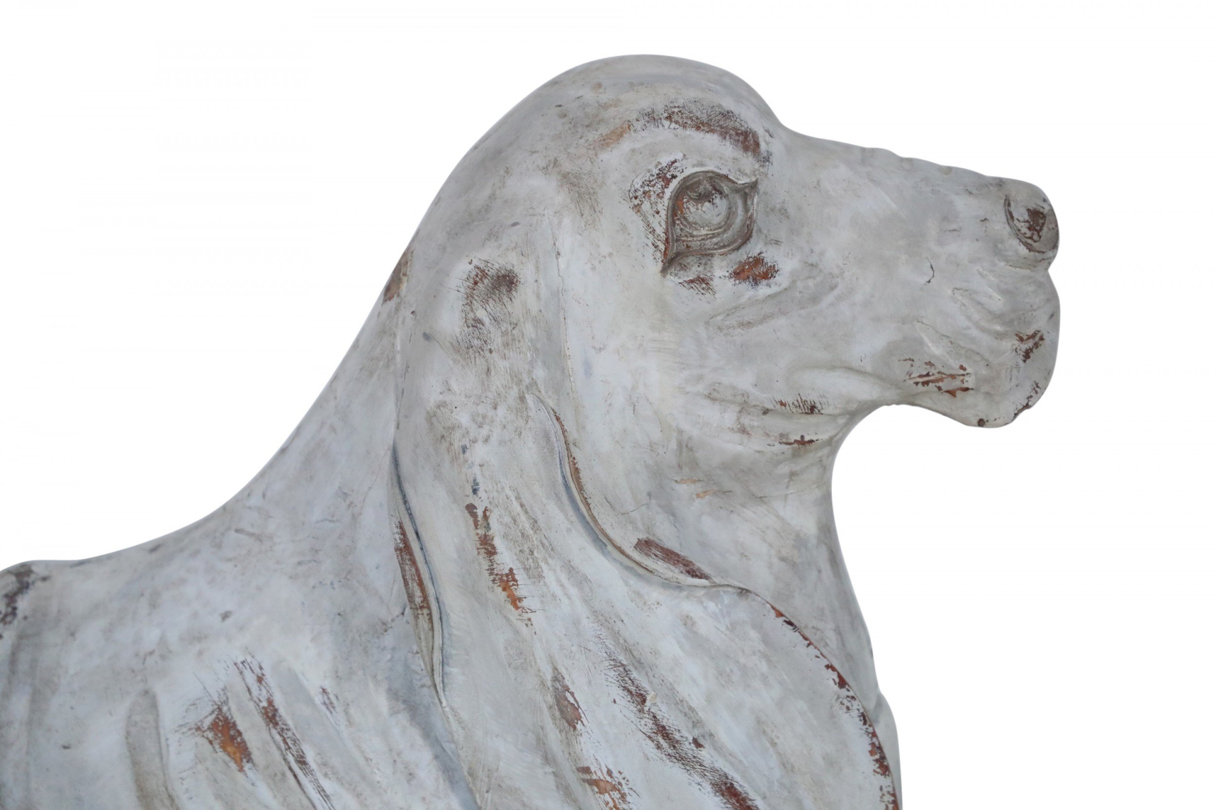 PAIR of Chinese carved wooden reclining dogs painted with whitewash finishes (PRICED AS PAIR)(Similar statues: NWL2458, NWL2459).