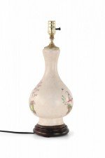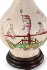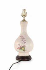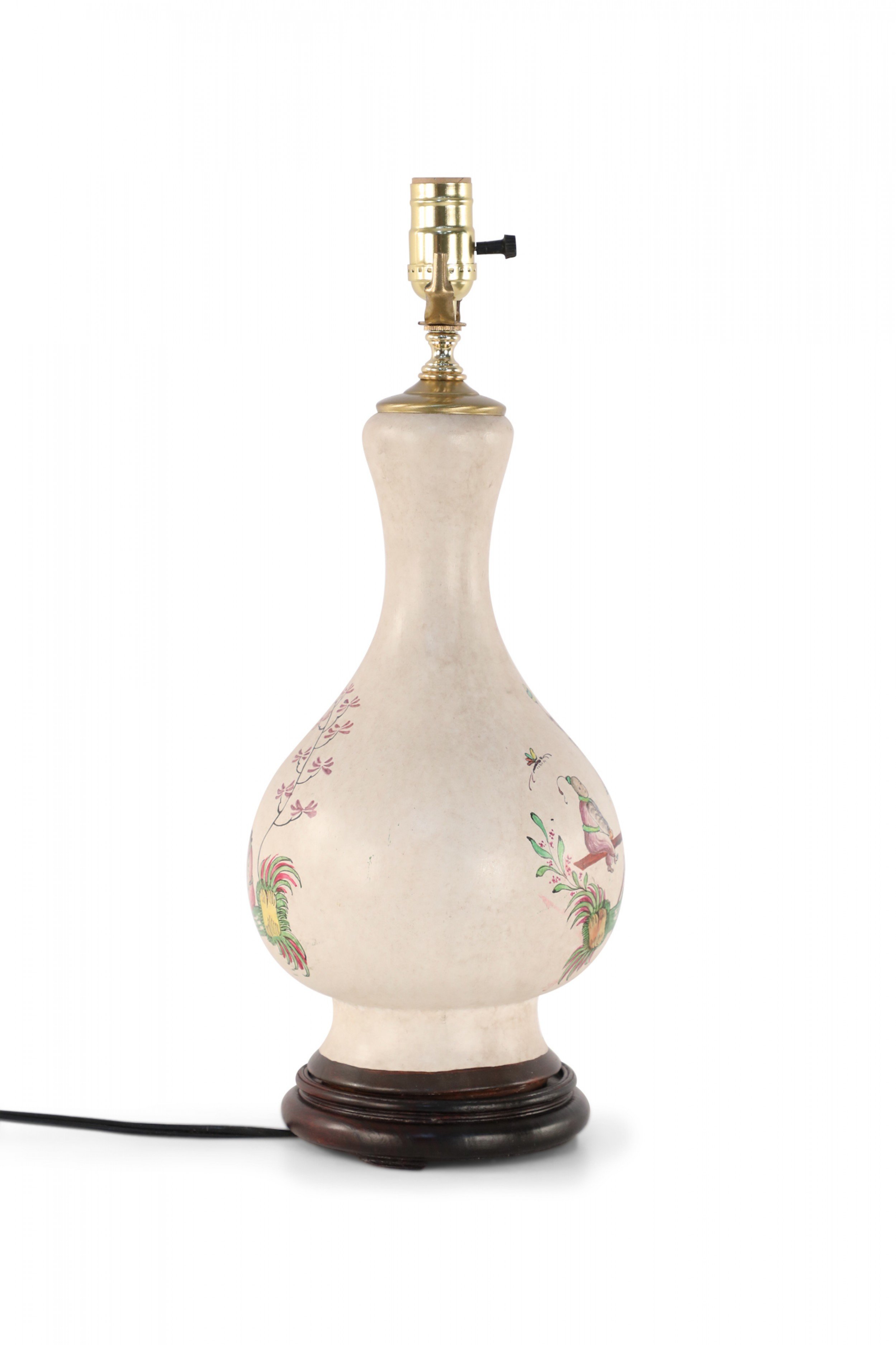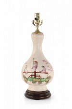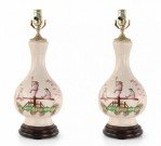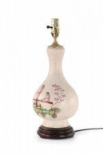 PAIR of Chinese table lamps made from cream, gourd-shaped vases hand-painted with figures on a balance beam and wooden bases with brass hardware. (PRICED AS PAIR) (Lamps with similar design: NWL2019).