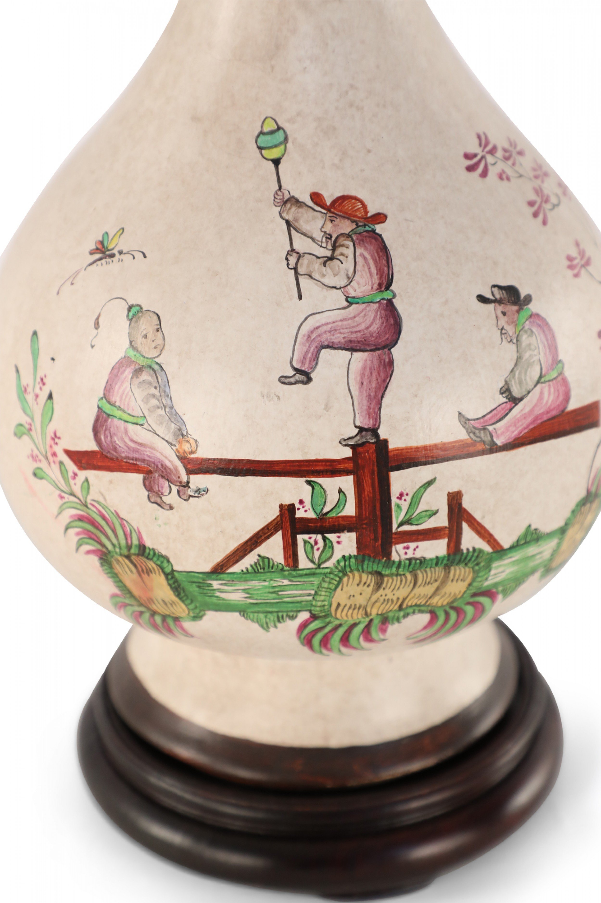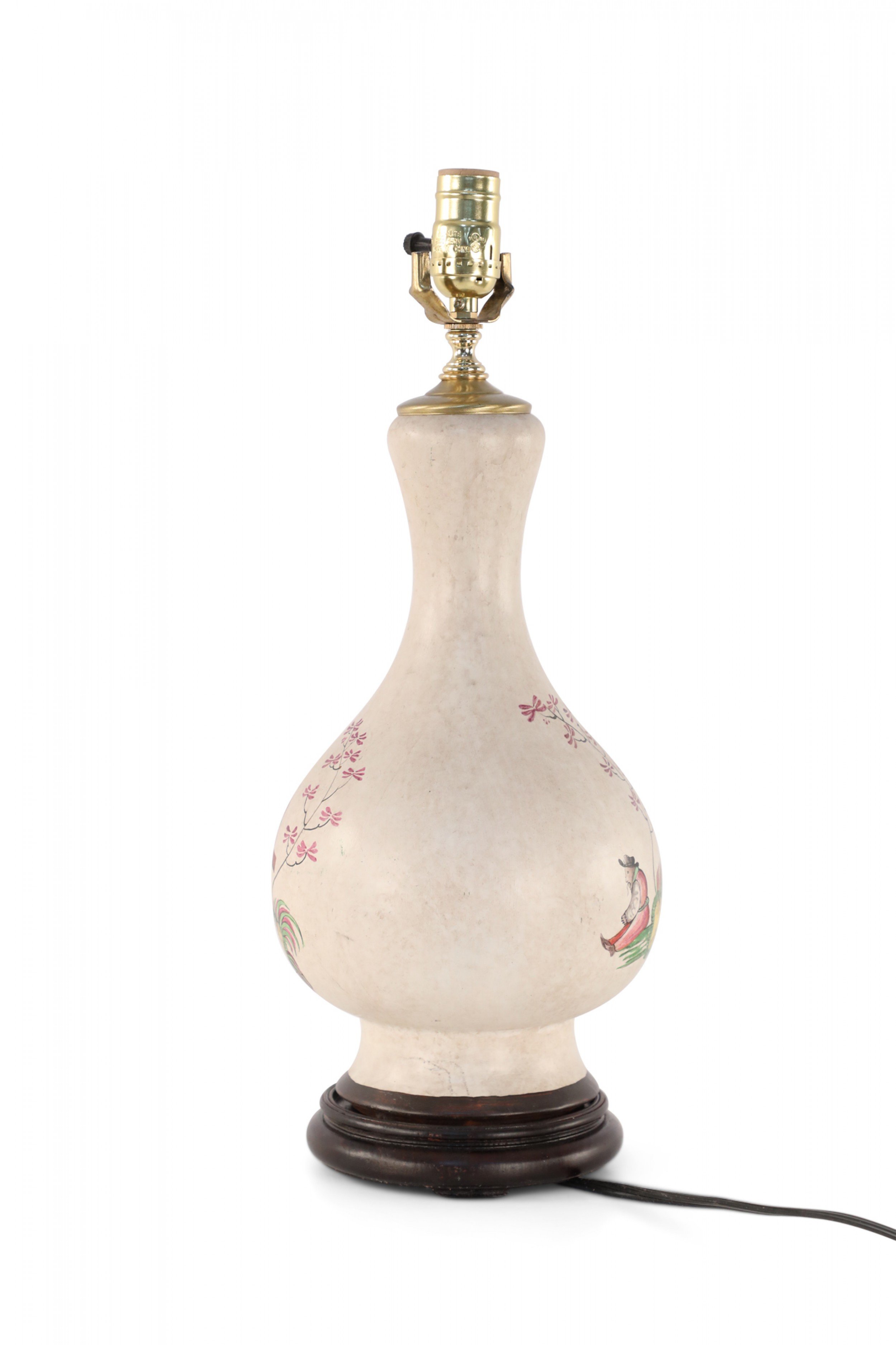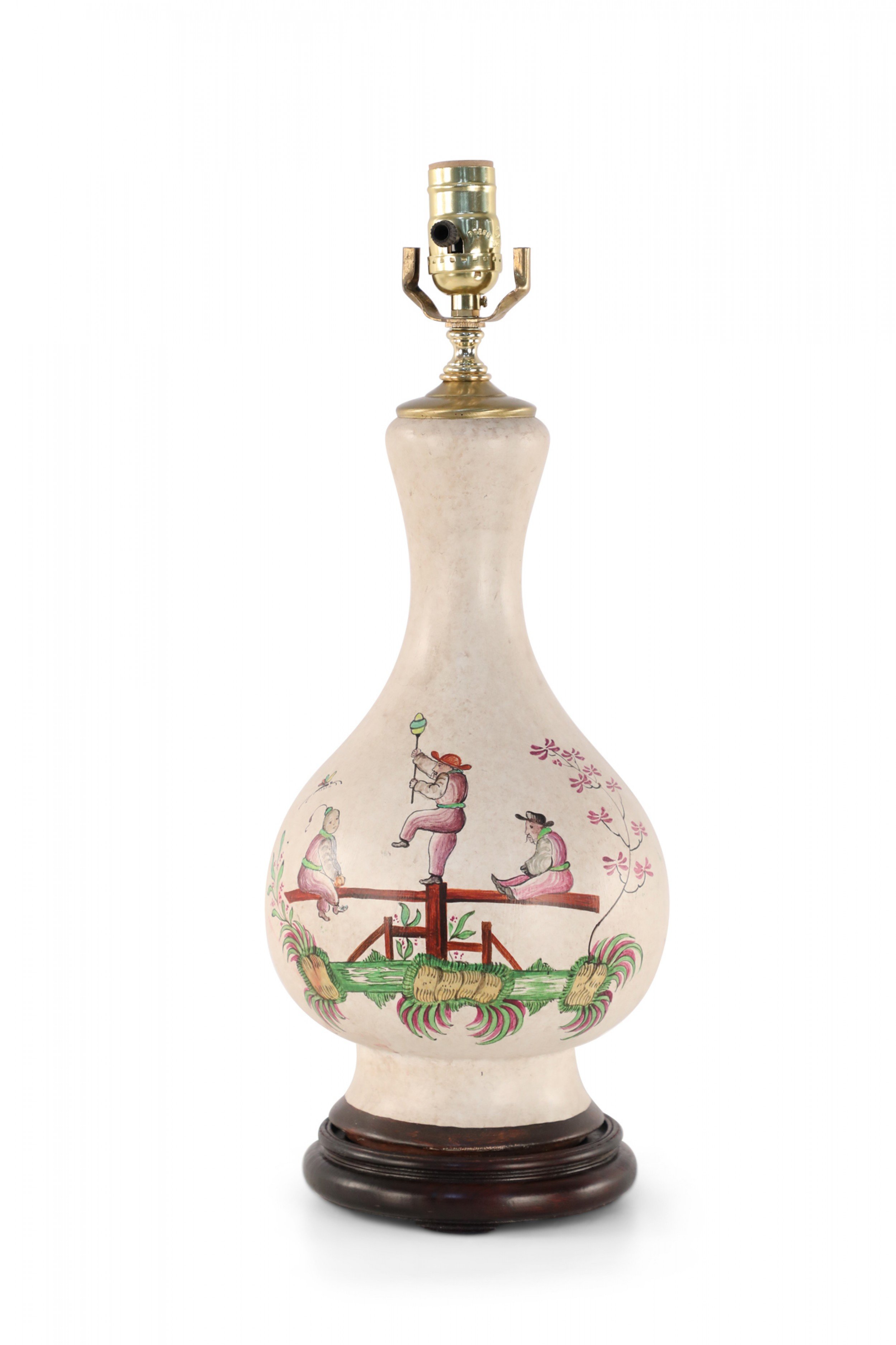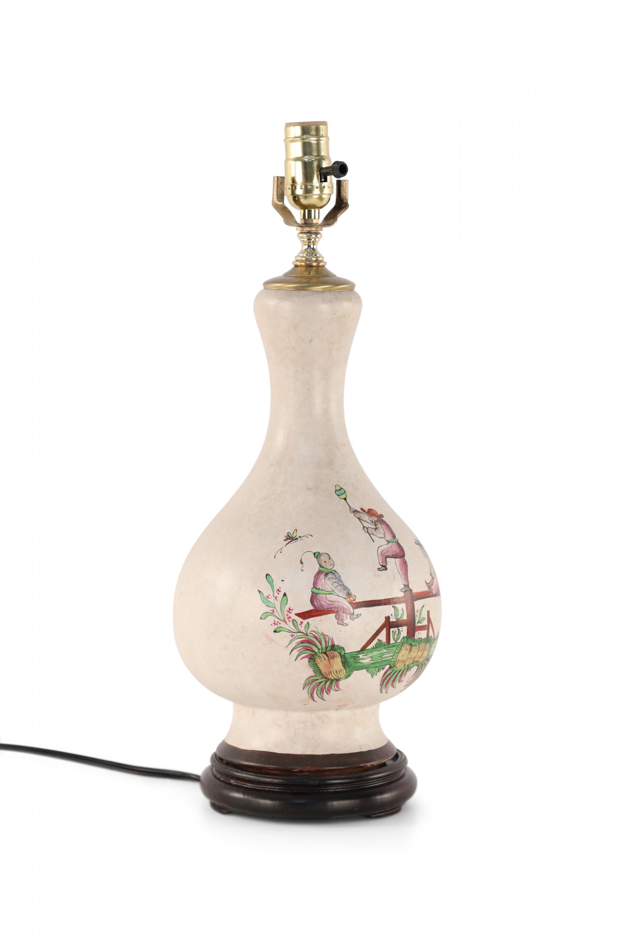 PAIR of Chinese table lamps made from cream, gourd-shaped vases hand-painted with figures on a balance beam and wooden bases with brass hardware. (PRICED AS PAIR) (Lamps with similar design: NWL2019)