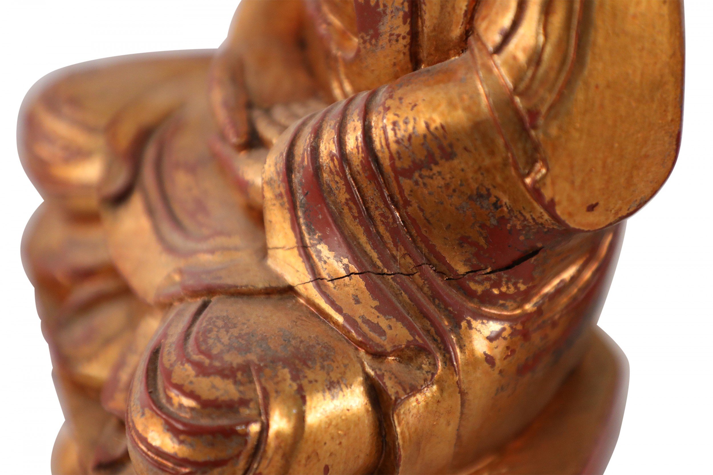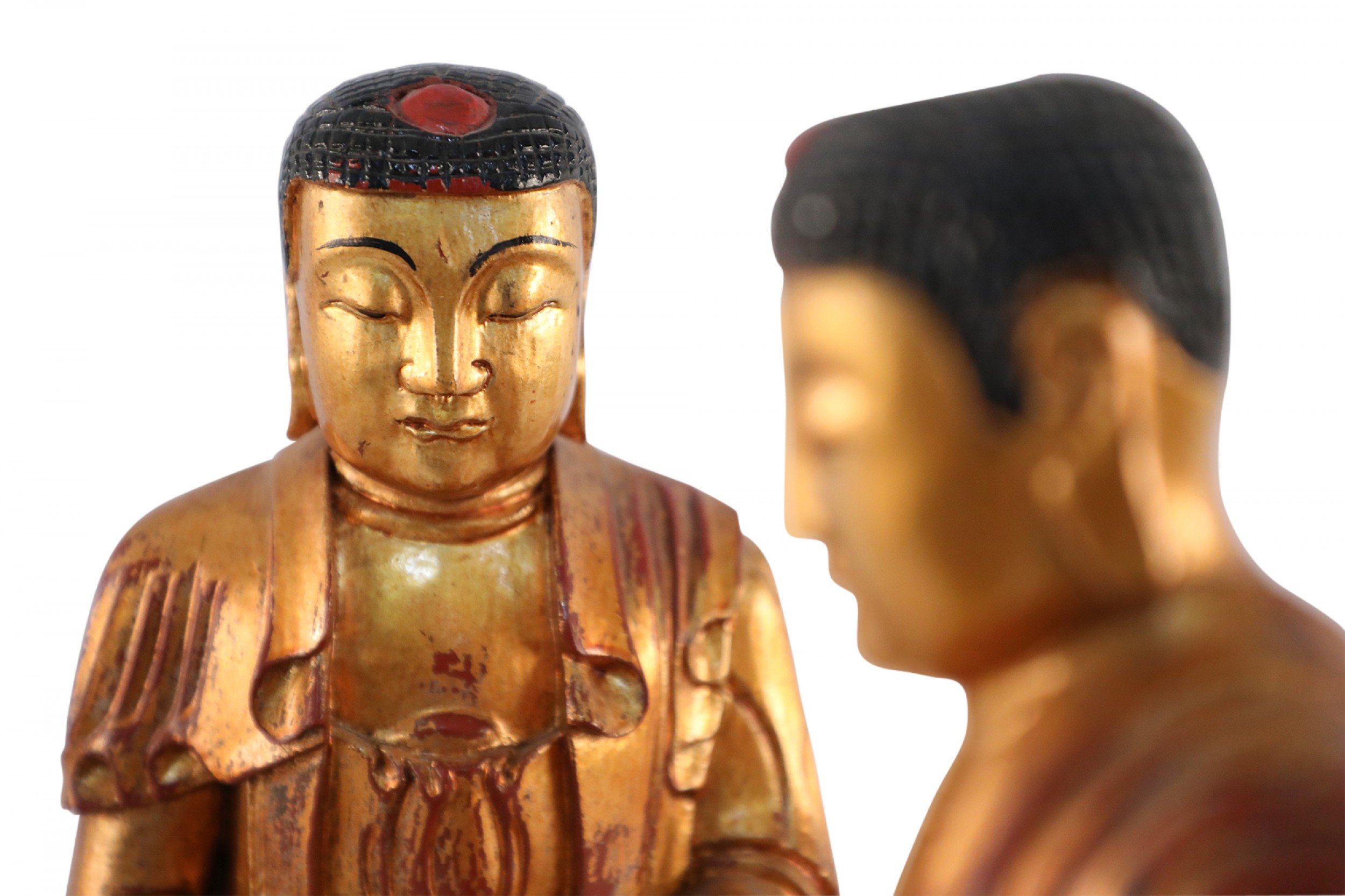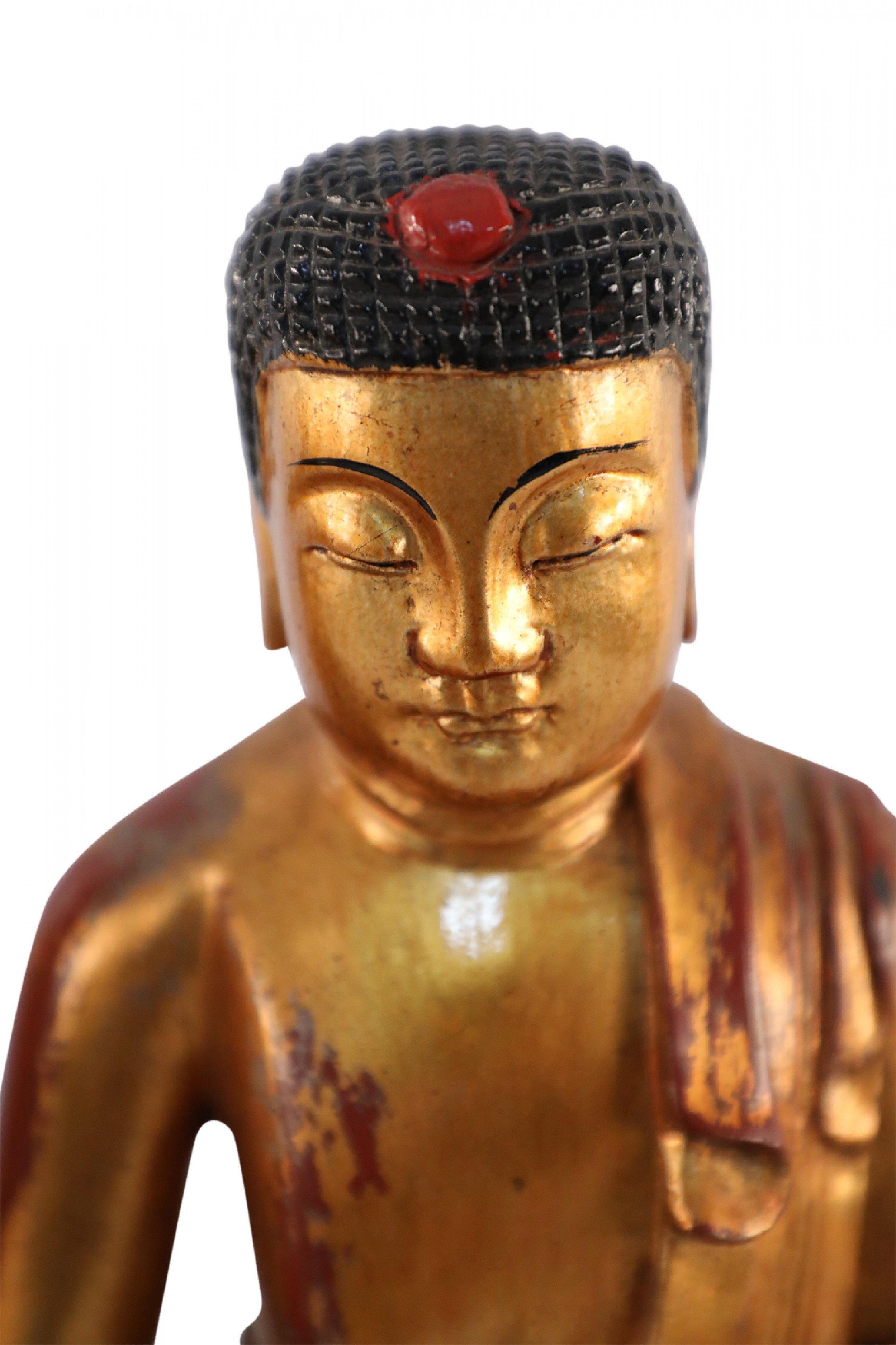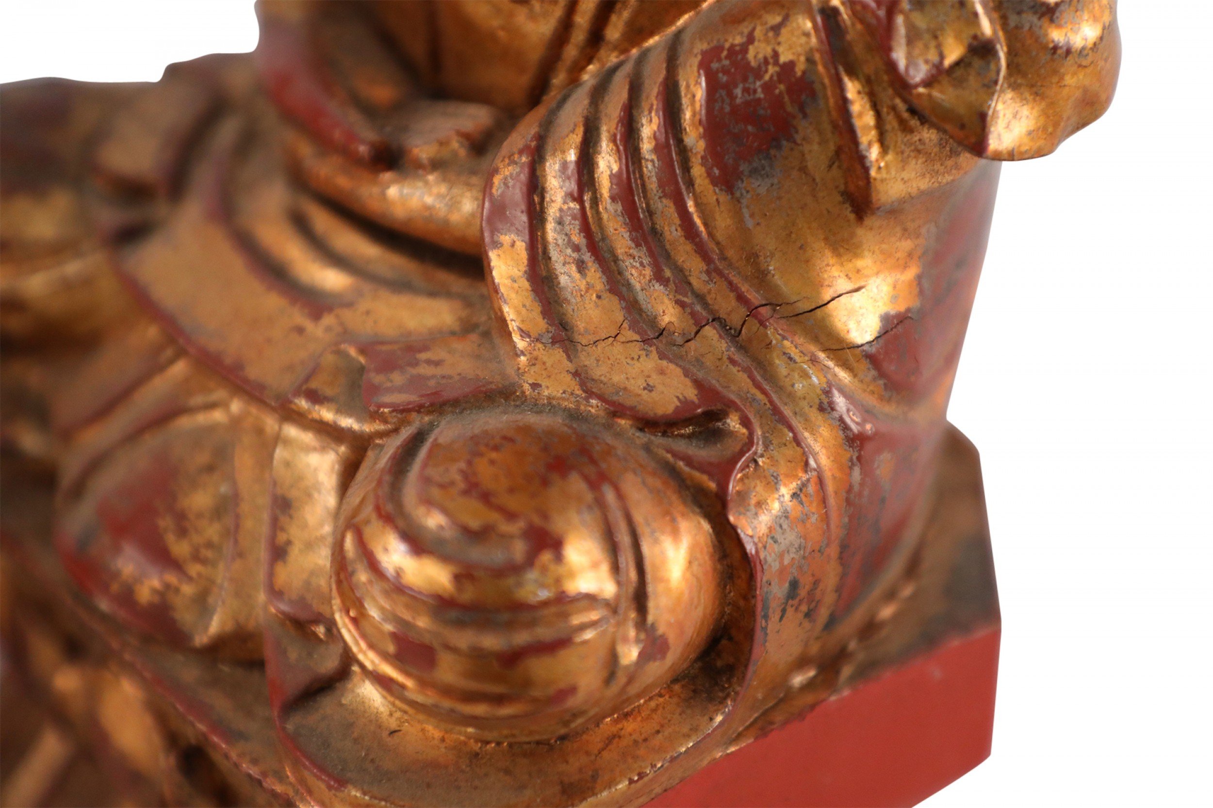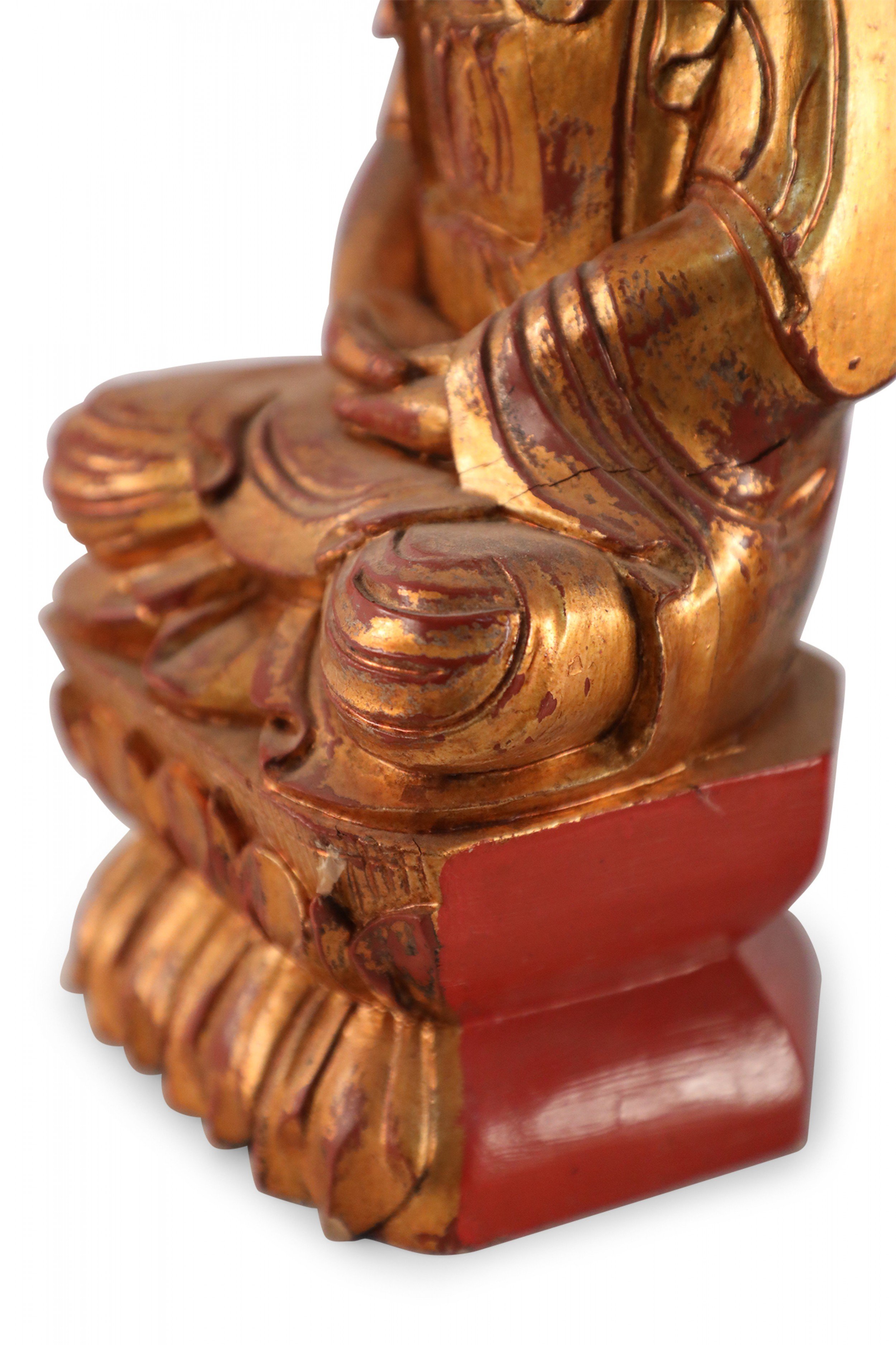 PAIR of Chinese gold, carved wooden Buddha figures seated atop floral and red platform bases (PRICED AS PAIR).