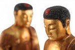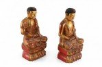 PAIR of Chinese gold, carved wooden Buddha figures seated atop floral and red platform bases (PRICED AS PAIR)