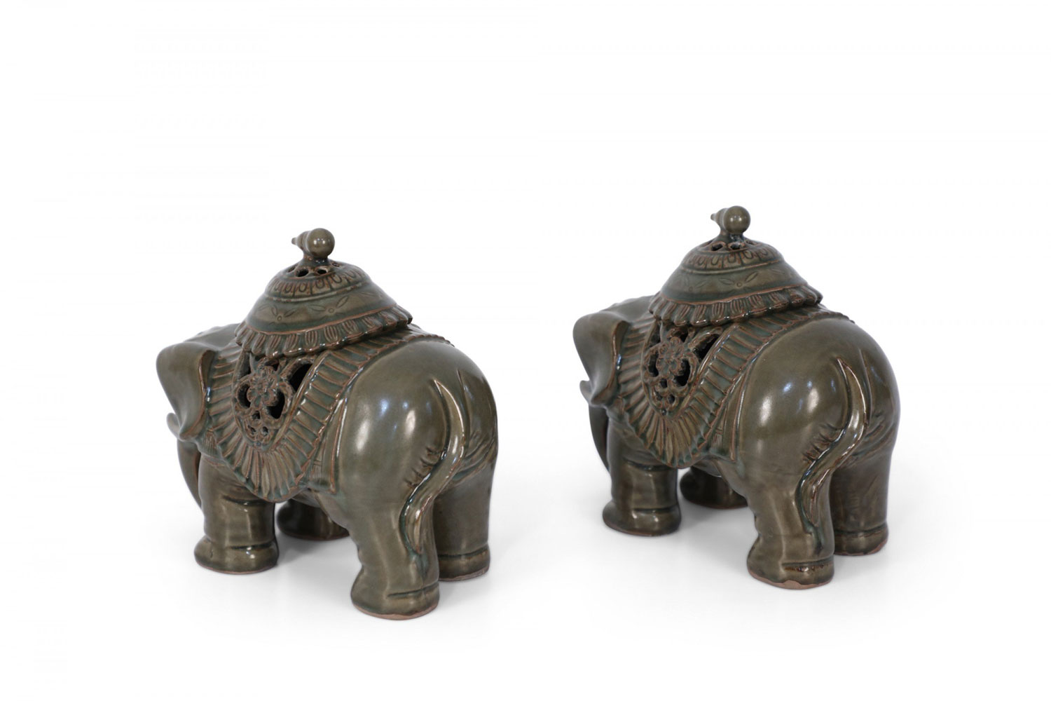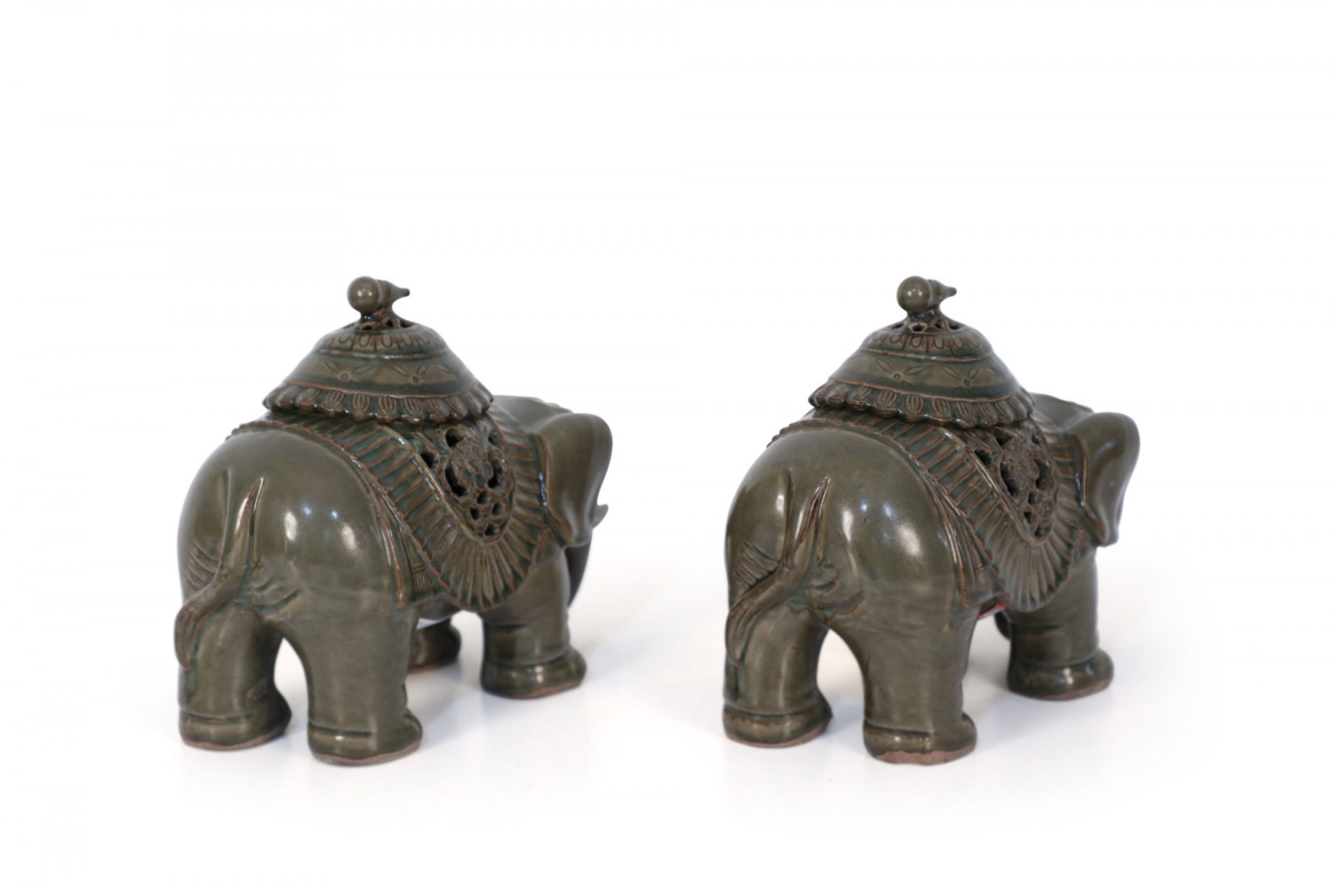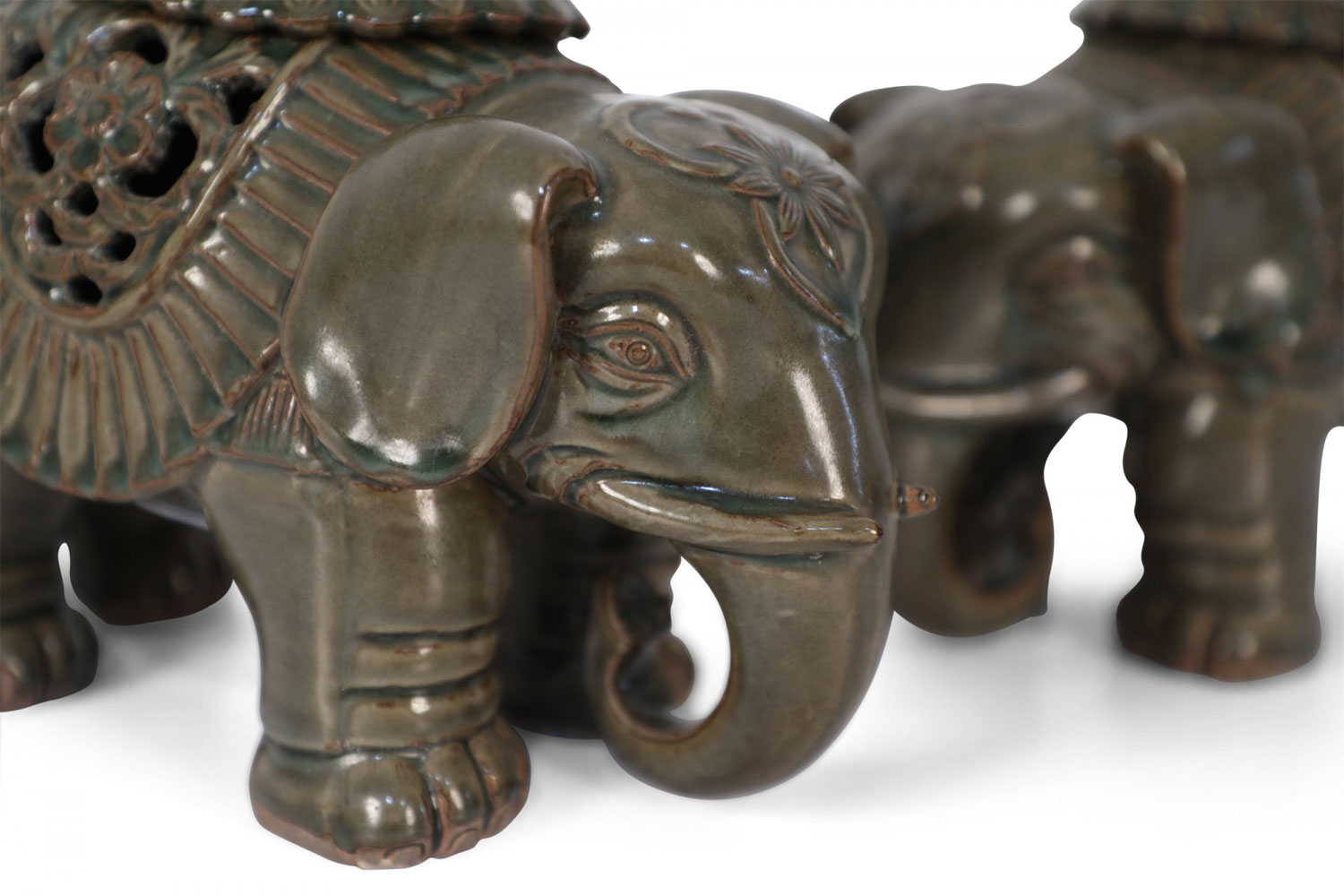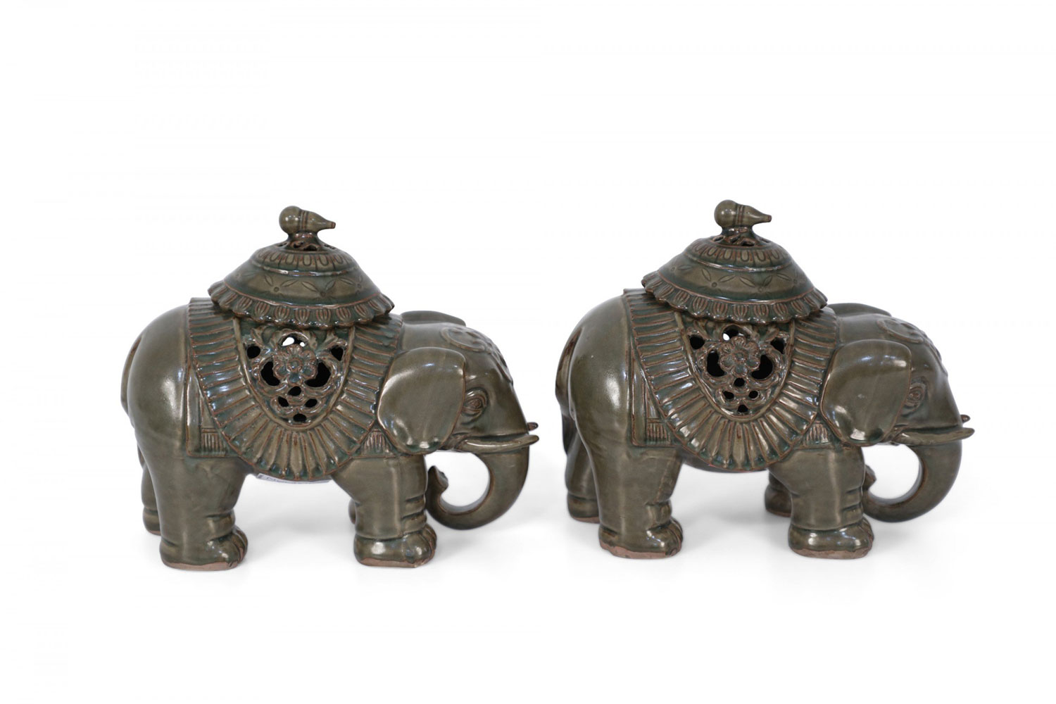 PAIR of Antique Chinese olive green elephant figurines, decorated with carved detailing and pierced sides, and fitted with lids (PRICED AS PAIR).