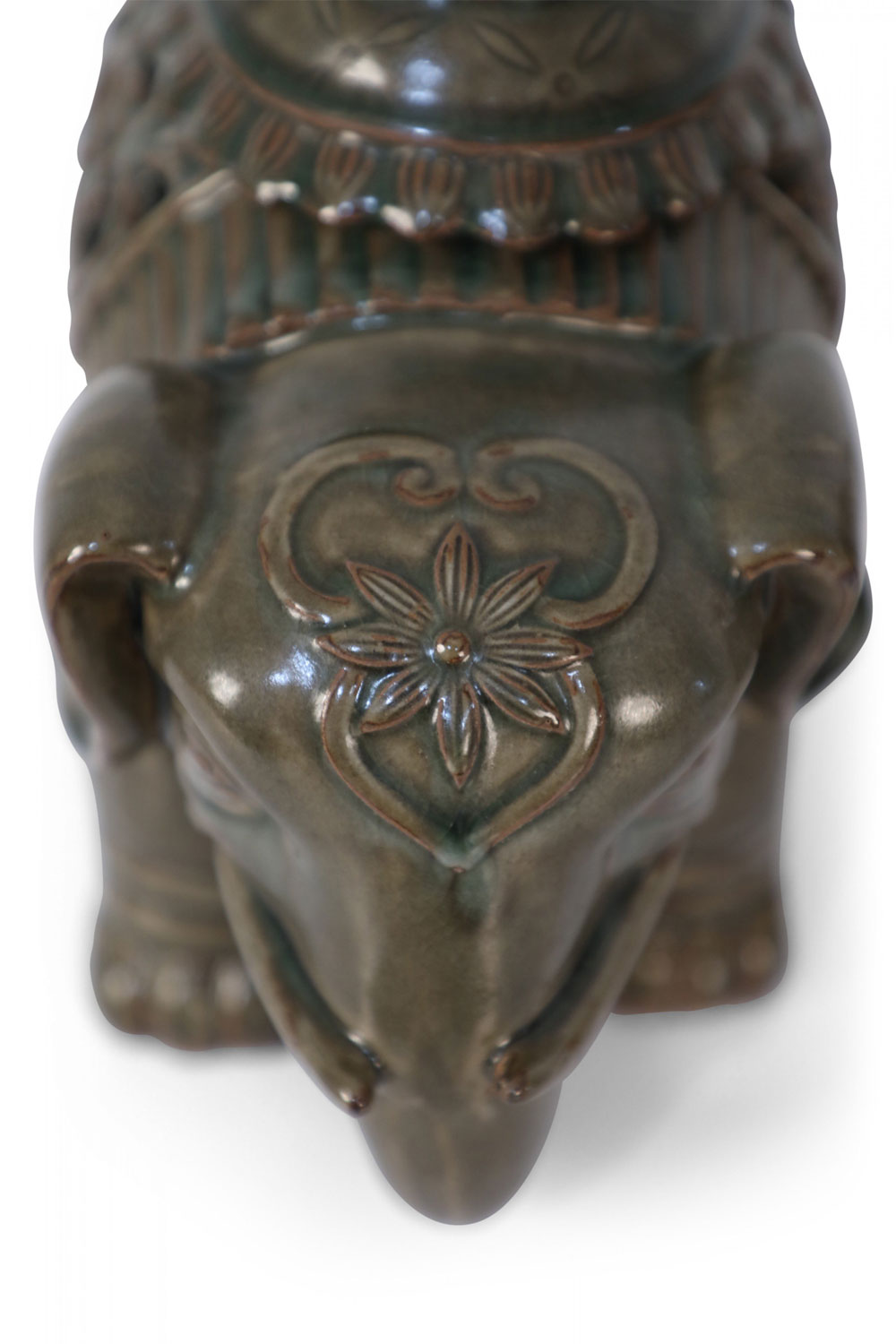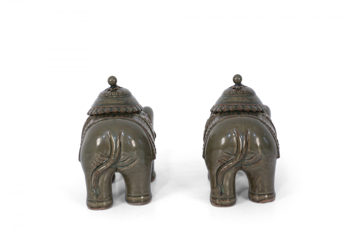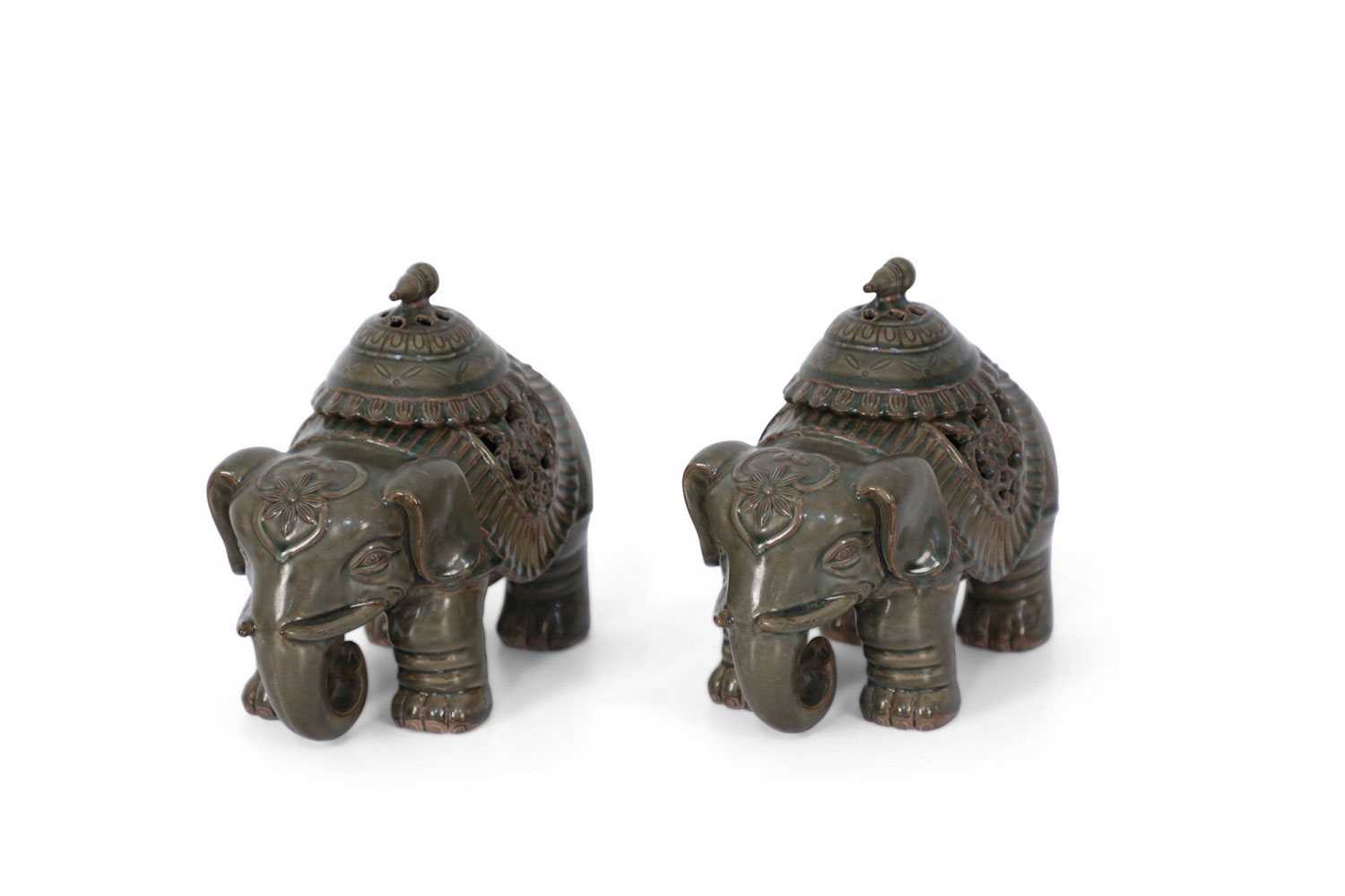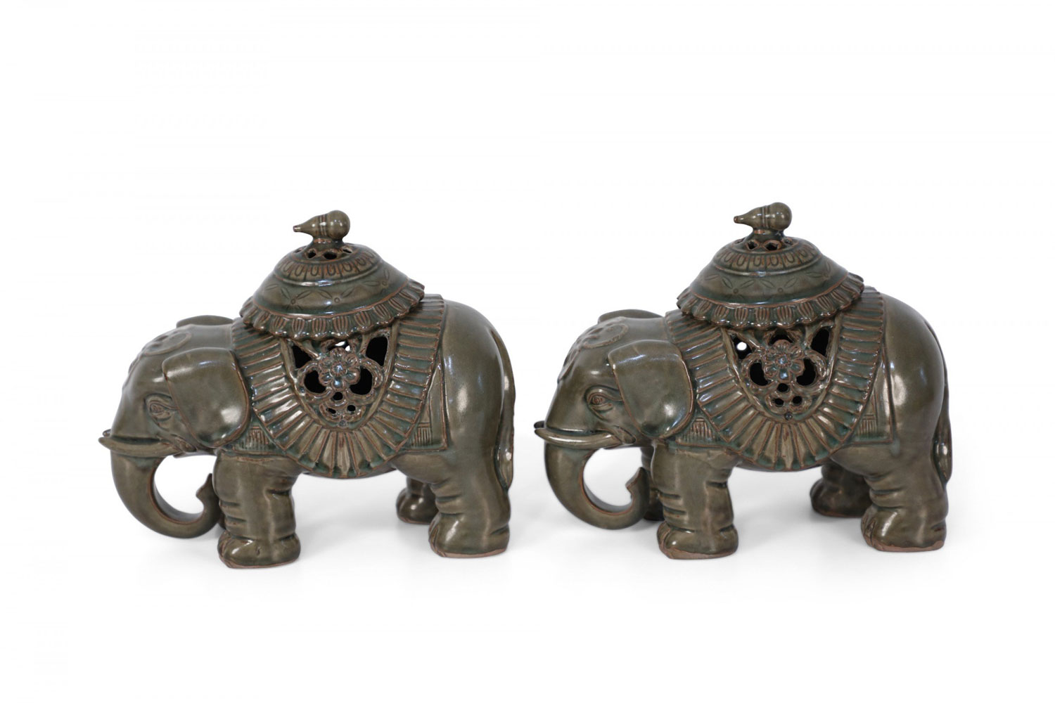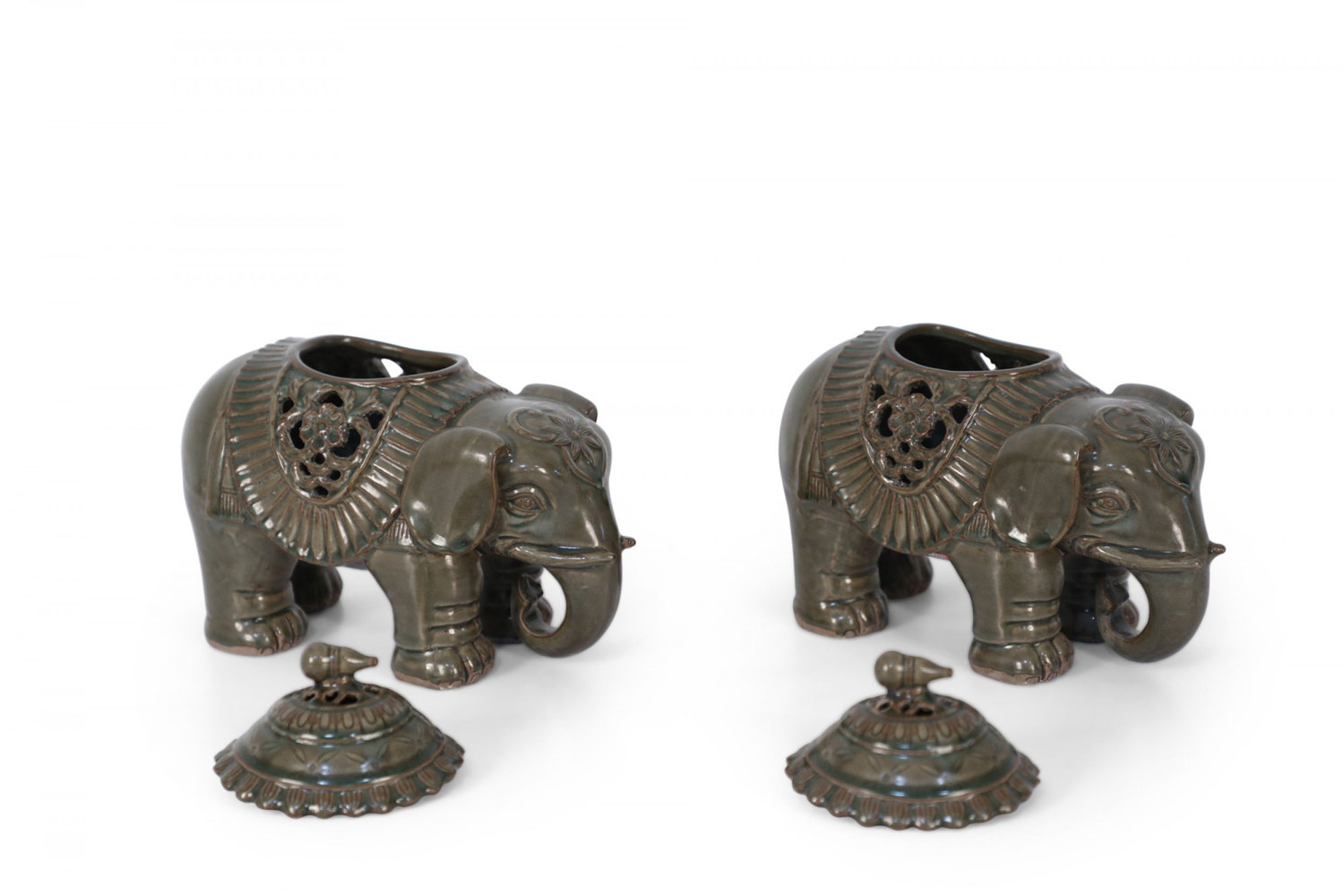 PAIR of Antique Chinese olive green elephant figurines, decorated with carved detailing and pierced sides, and fitted with lids (PRICED AS PAIR).
