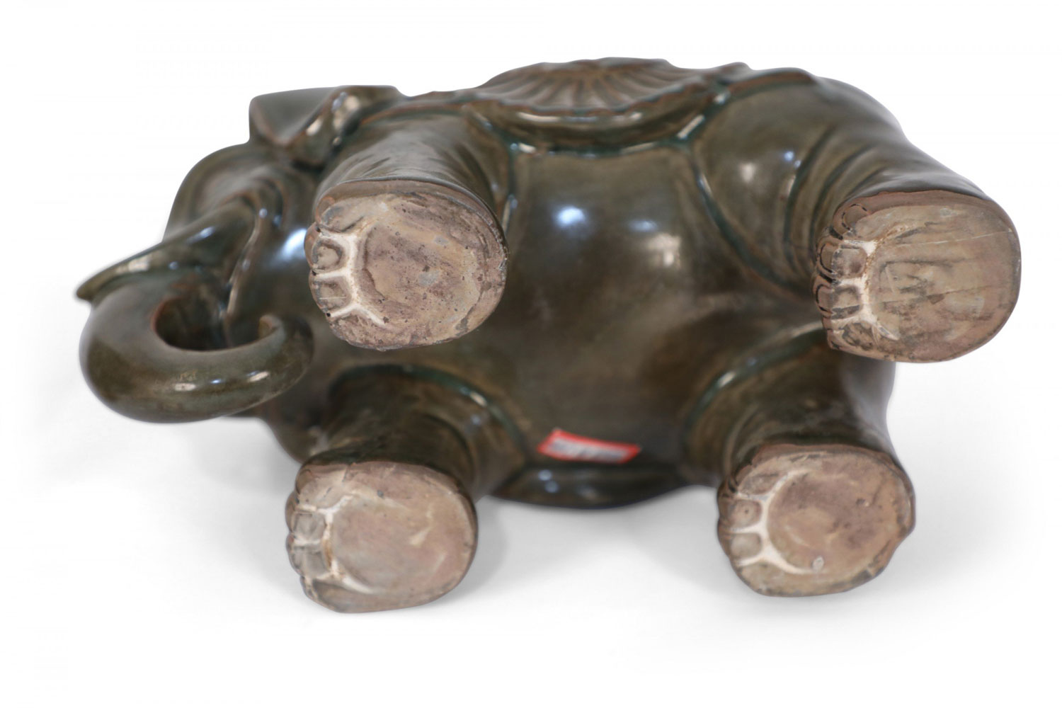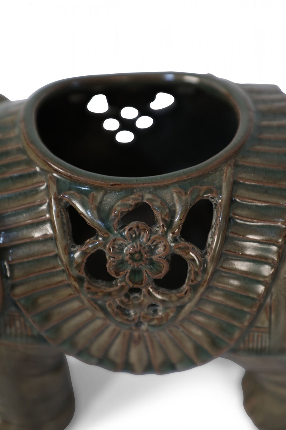 PAIR of Antique Chinese olive green elephant figurines, decorated with carved detailing and pierced sides, and fitted with lids (PRICED AS PAIR)..