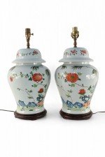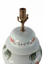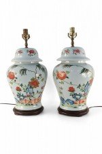 Pair of Chinese Off-White Floral and Bamboo Design Table Lamps