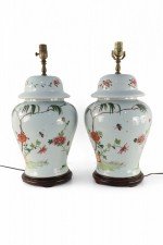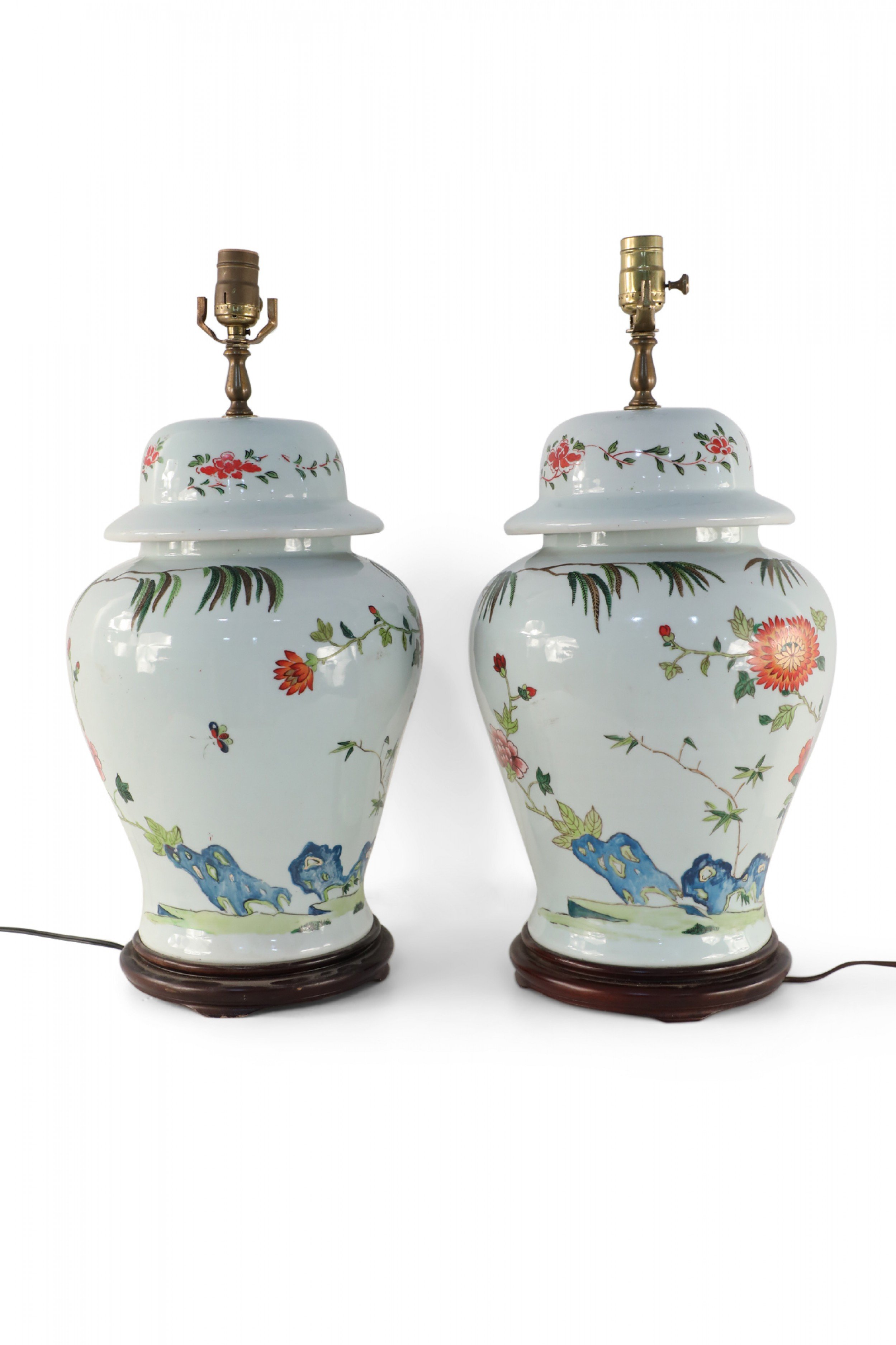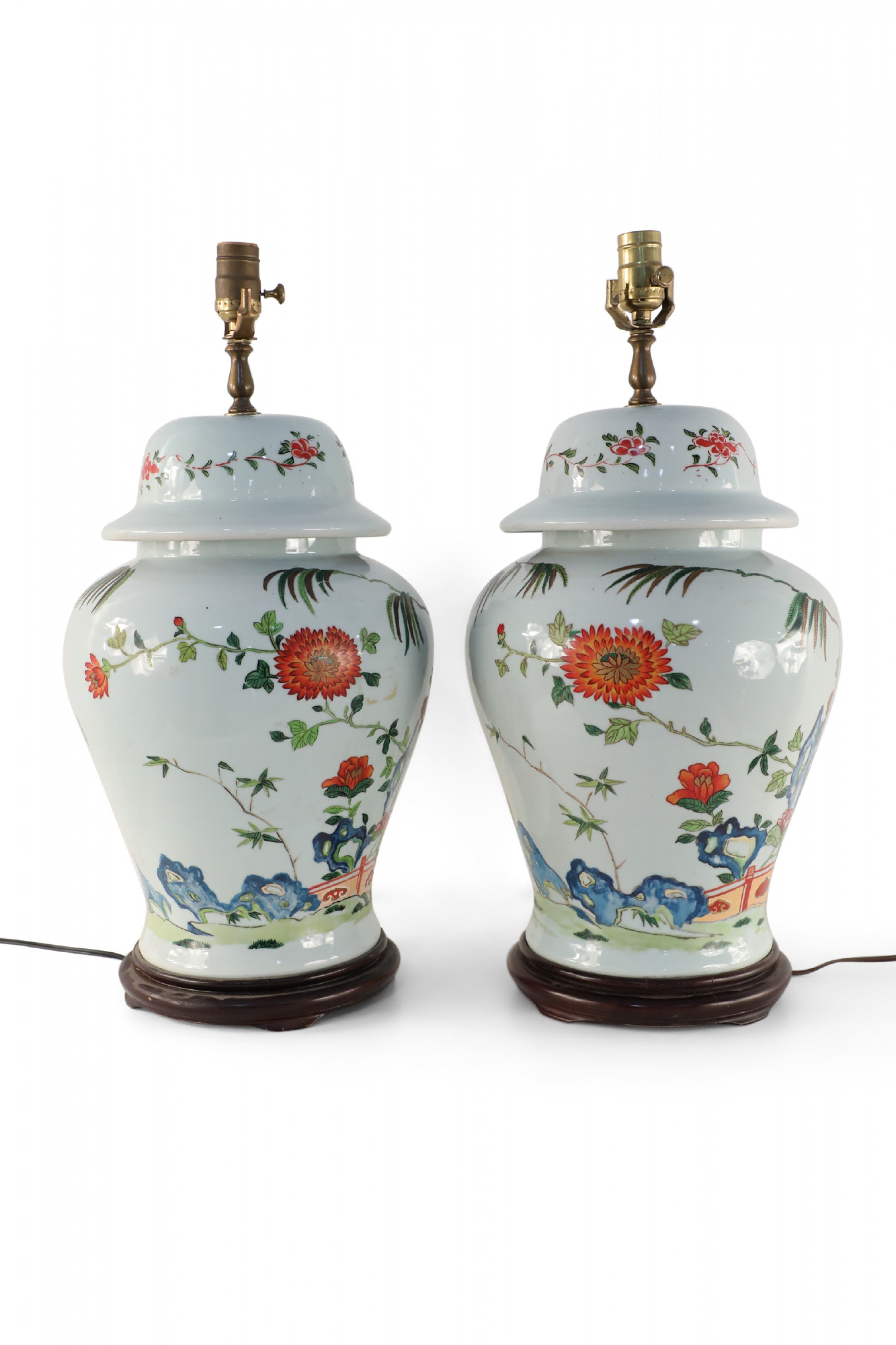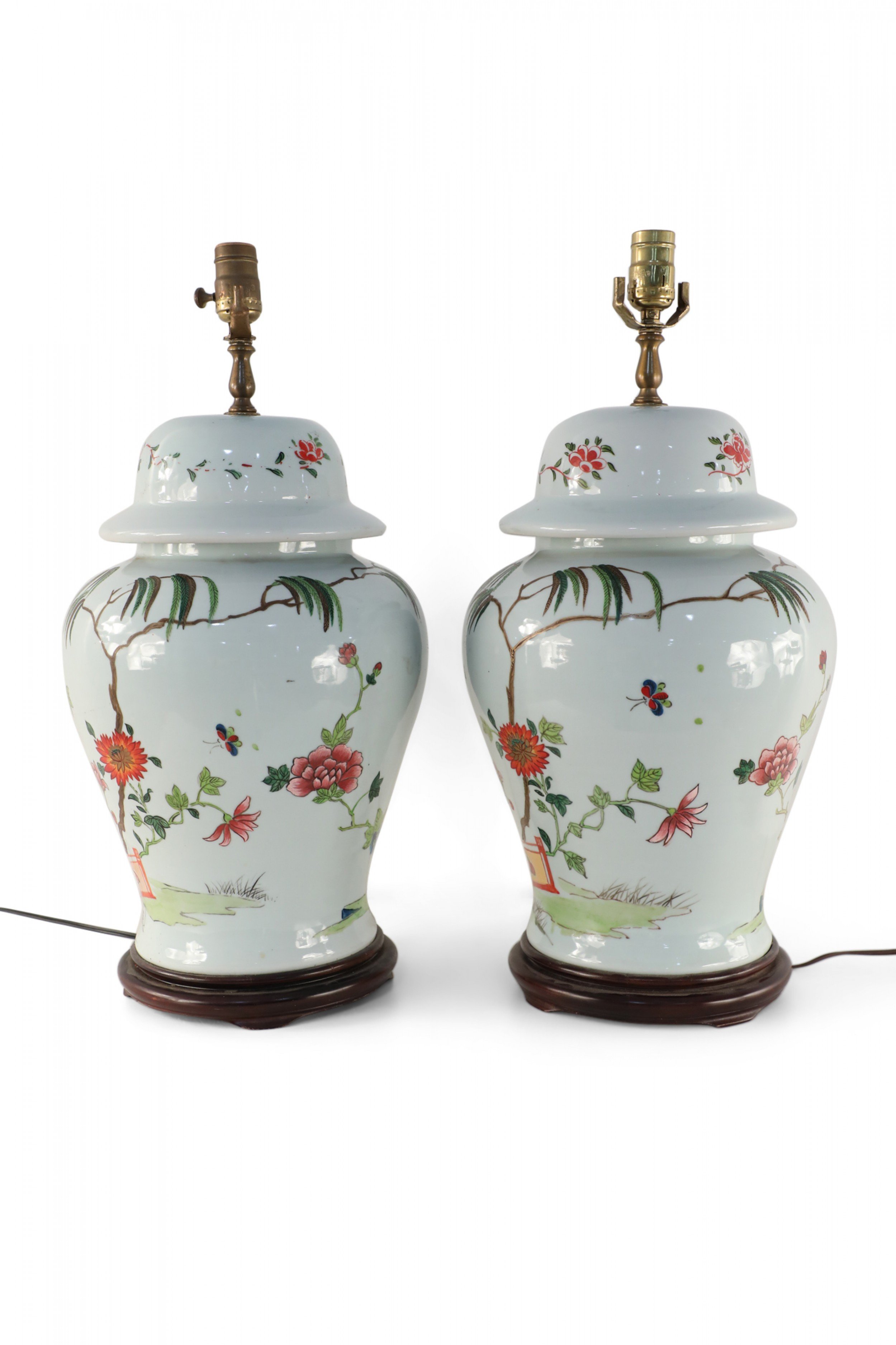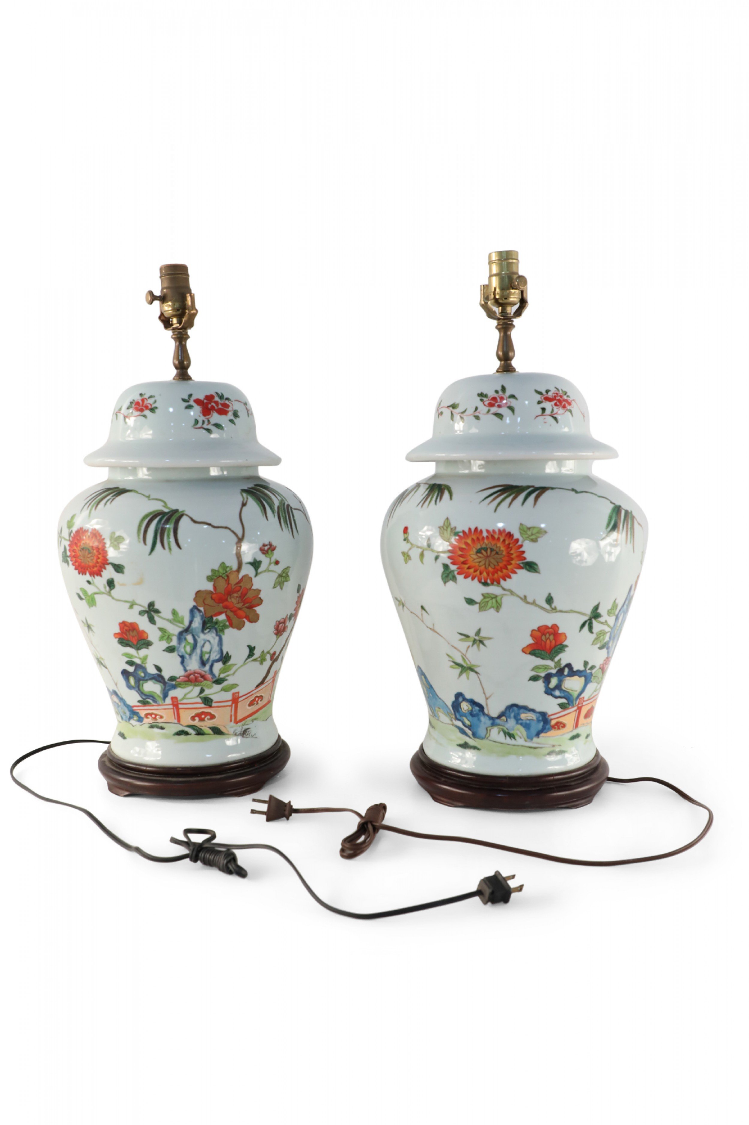 PAIR of Chinese porcelain table lamps made from off-white, urn-shaped vases decorated with a winding natural scene of flowers and bamboo growing from behind a decorative gate mounted on wooden bases with brass hardware. (PRICED AS PAIR).