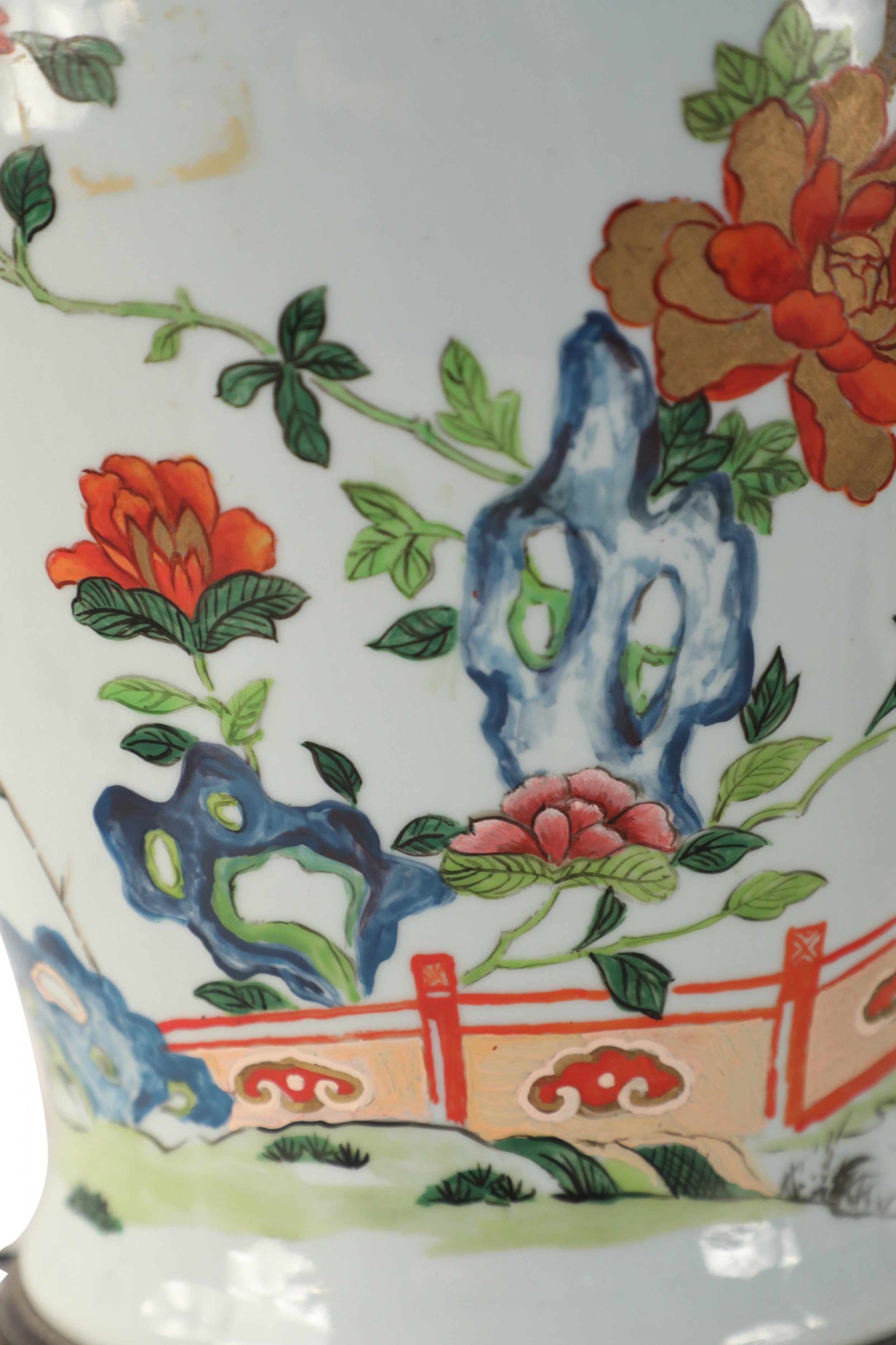 PAIR of Chinese porcelain table lamps made from off-white, urn-shaped vases decorated with a winding natural scene of flowers and bamboo growing from behind a decorative gate mounted on wooden bases with brass hardware. (PRICED AS PAIR)..