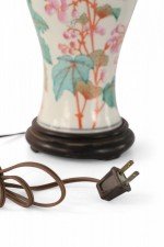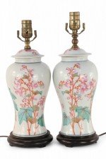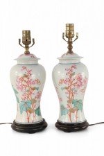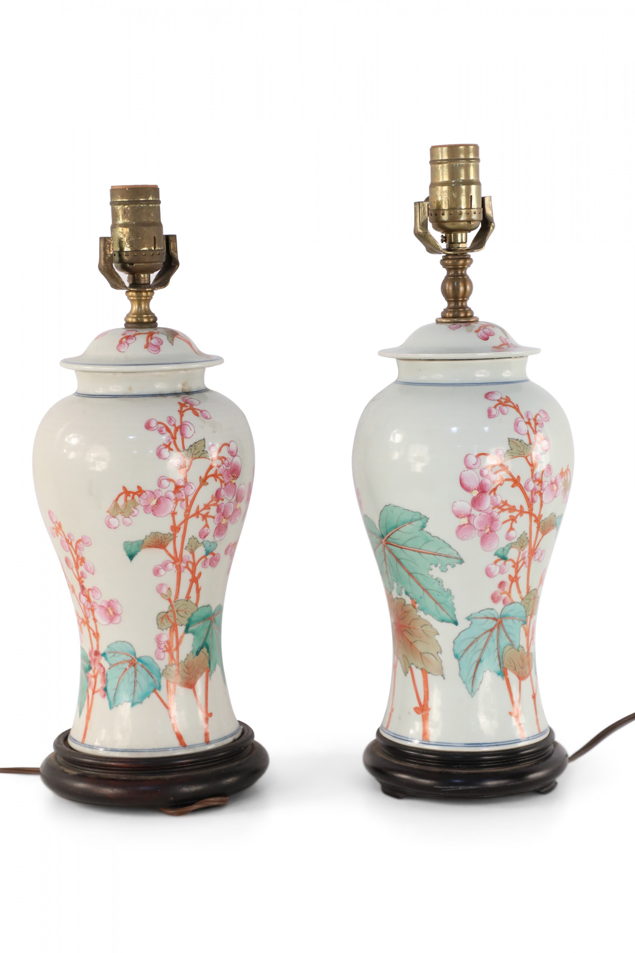 PAIR of similar Chinese porcelain table lamps made from off-white, urn-shaped vases with pink, orange and green florals, berries, leaves and snap dragons with wooden bases and brass hardware (lamps vary slightly in height and pattern) (PRICED AS PAIR)