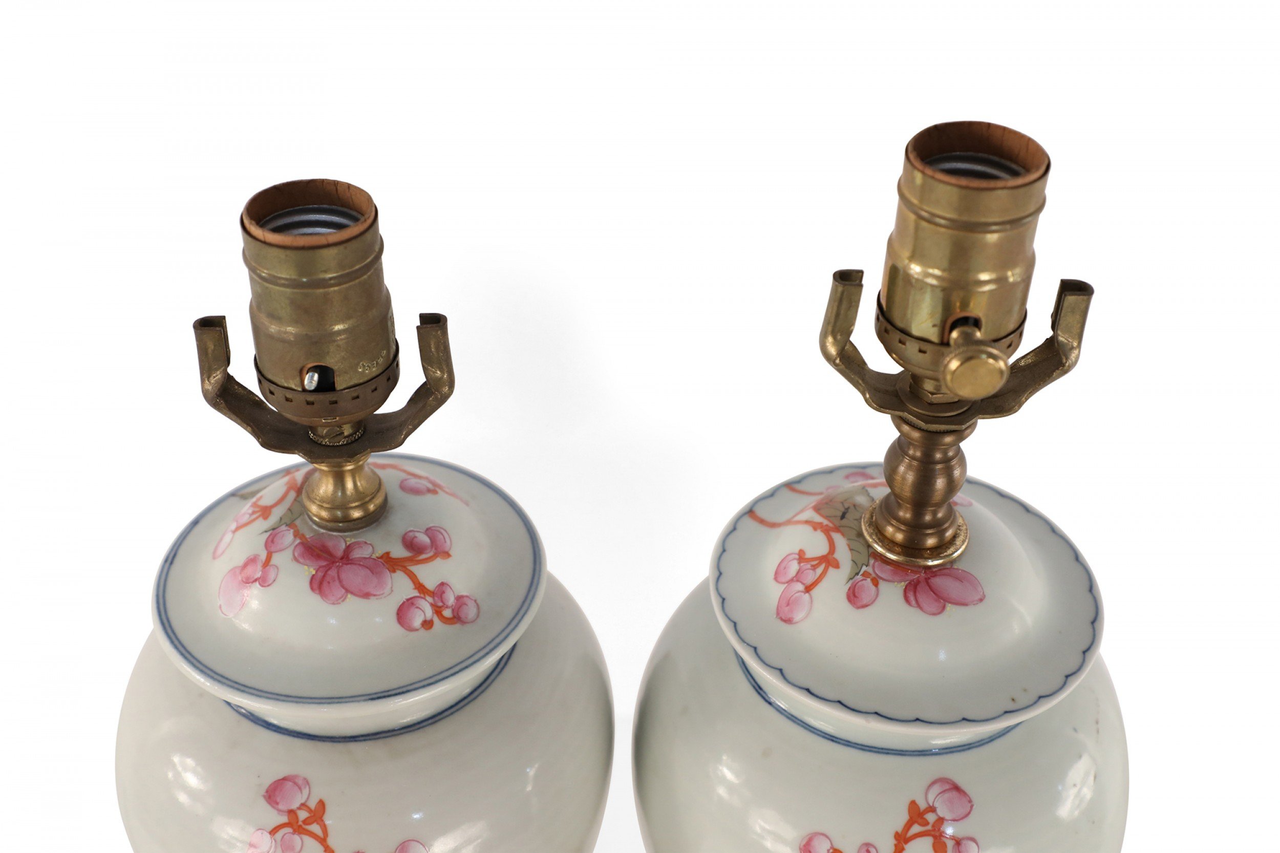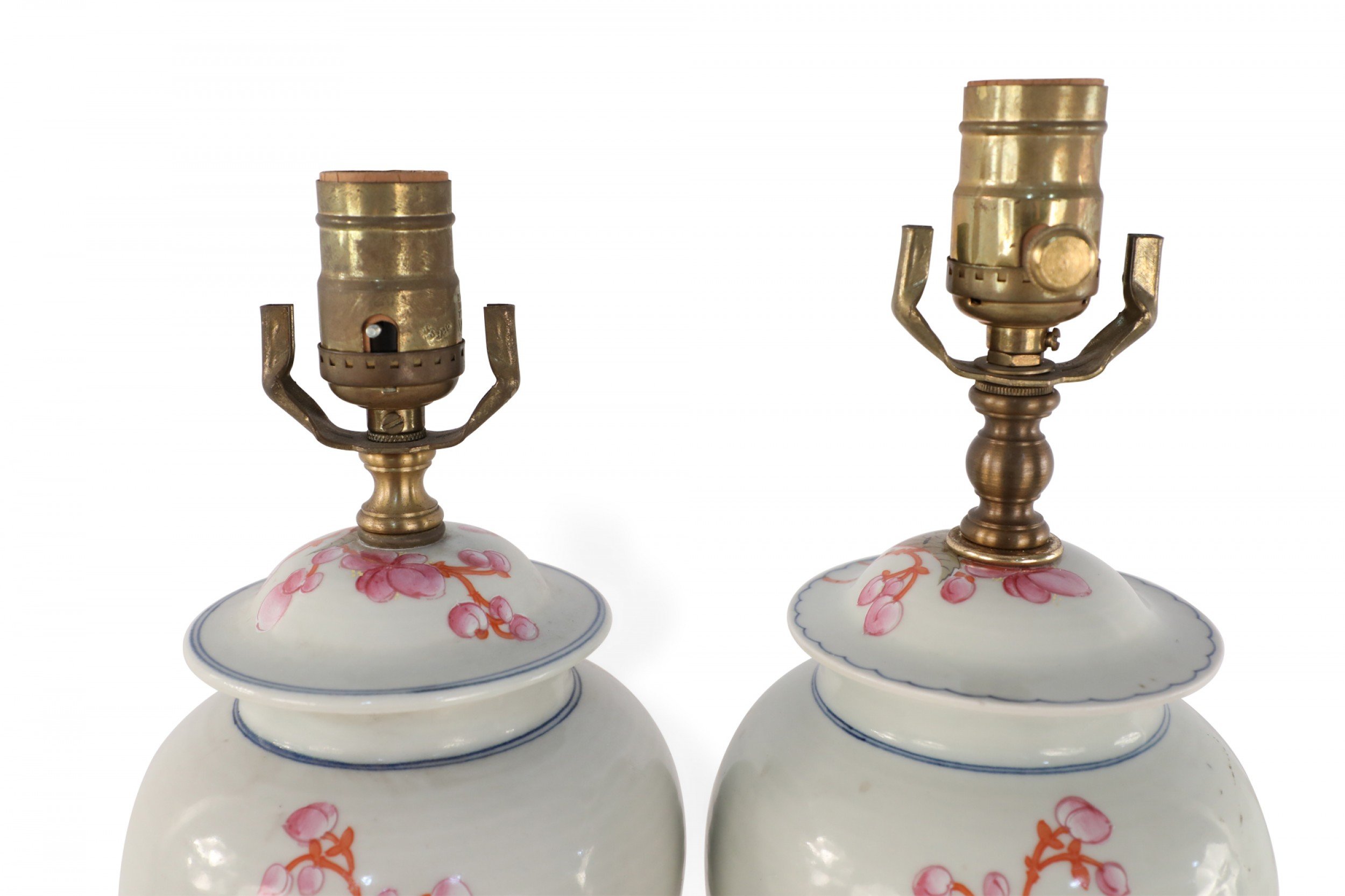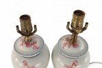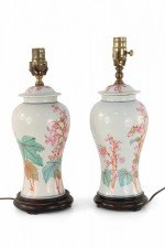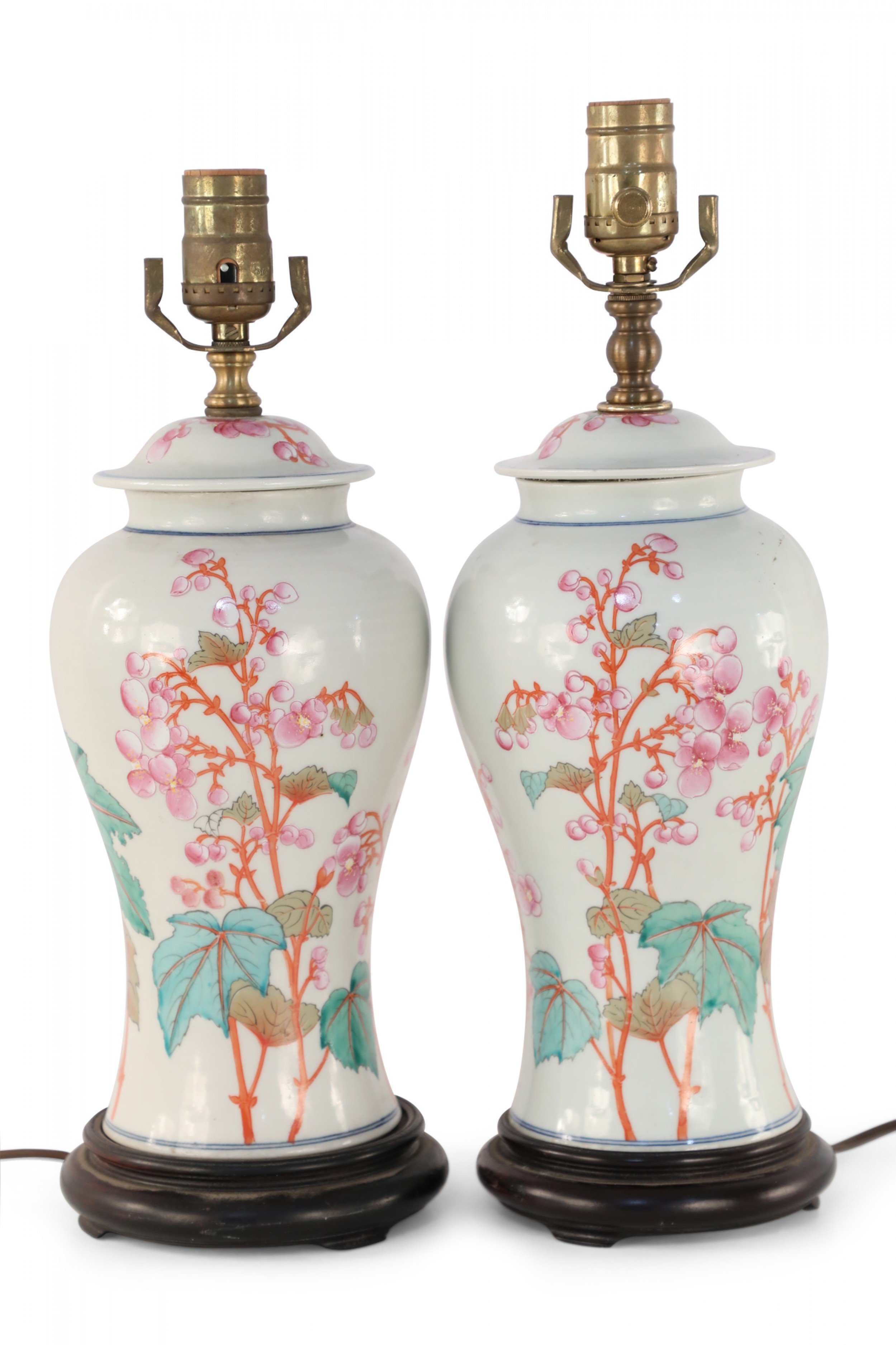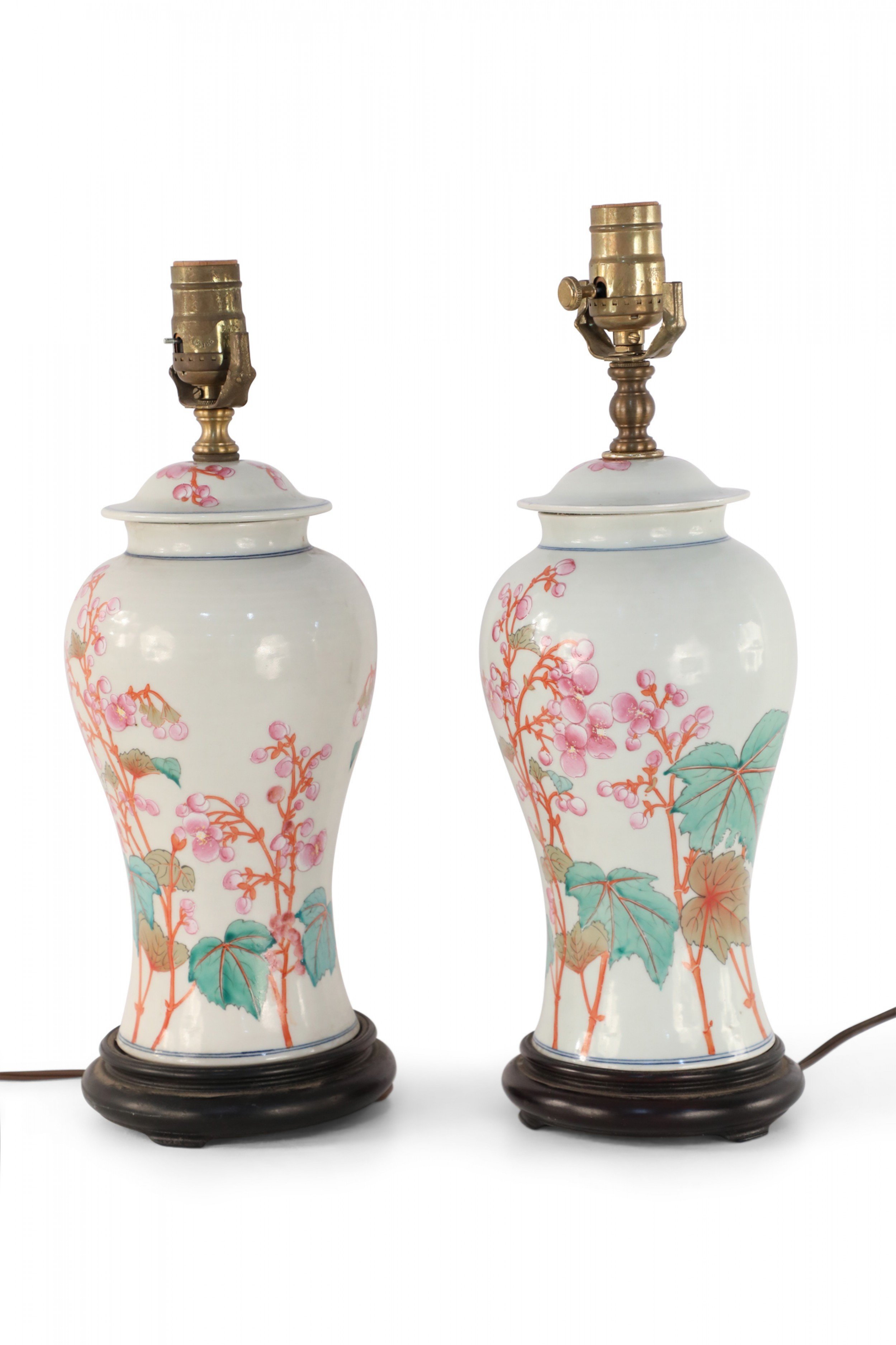 PAIR of similar Chinese porcelain table lamps made from off-white, urn-shaped vases with pink, orange and green florals, berries, leaves and snap dragons with wooden bases and brass hardware (lamps vary slightly in height and pattern) (PRICED AS PAIR).