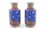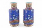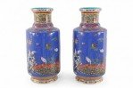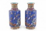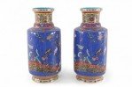 PAIR of Chinese Qing Dynasty Qianlong Period-style (Mid-20th Century) blue porcelain mallet bottles with famille floral patterns and birds consisting of nine, painted layers in homage to the positive symbolism of the number 9 in Chinese culture. (PRICED AS PAIR)