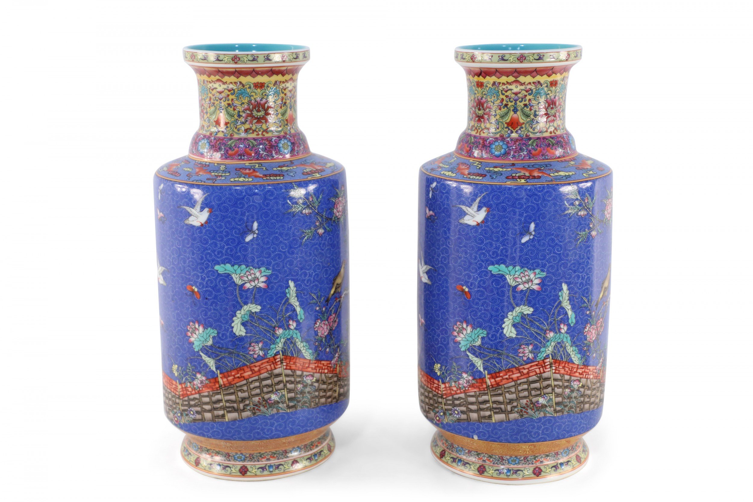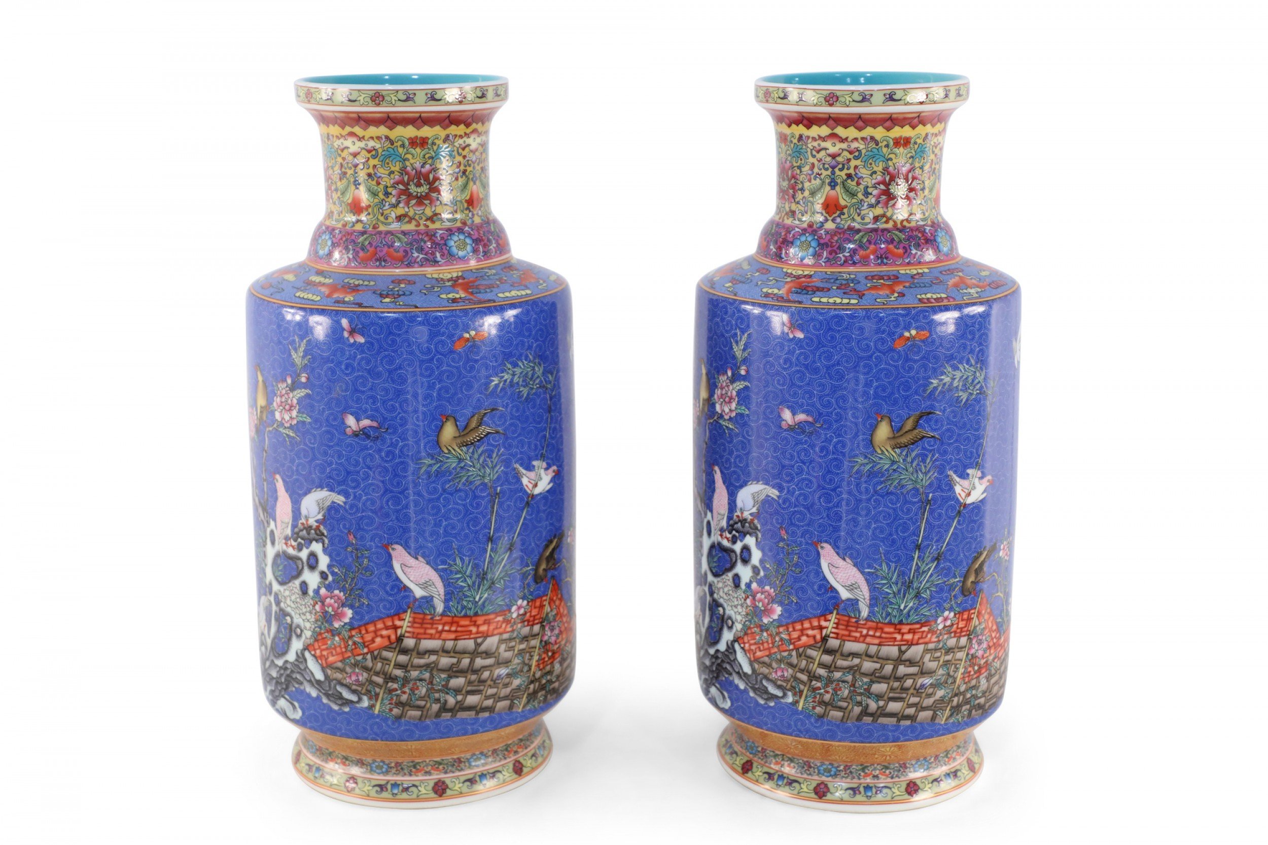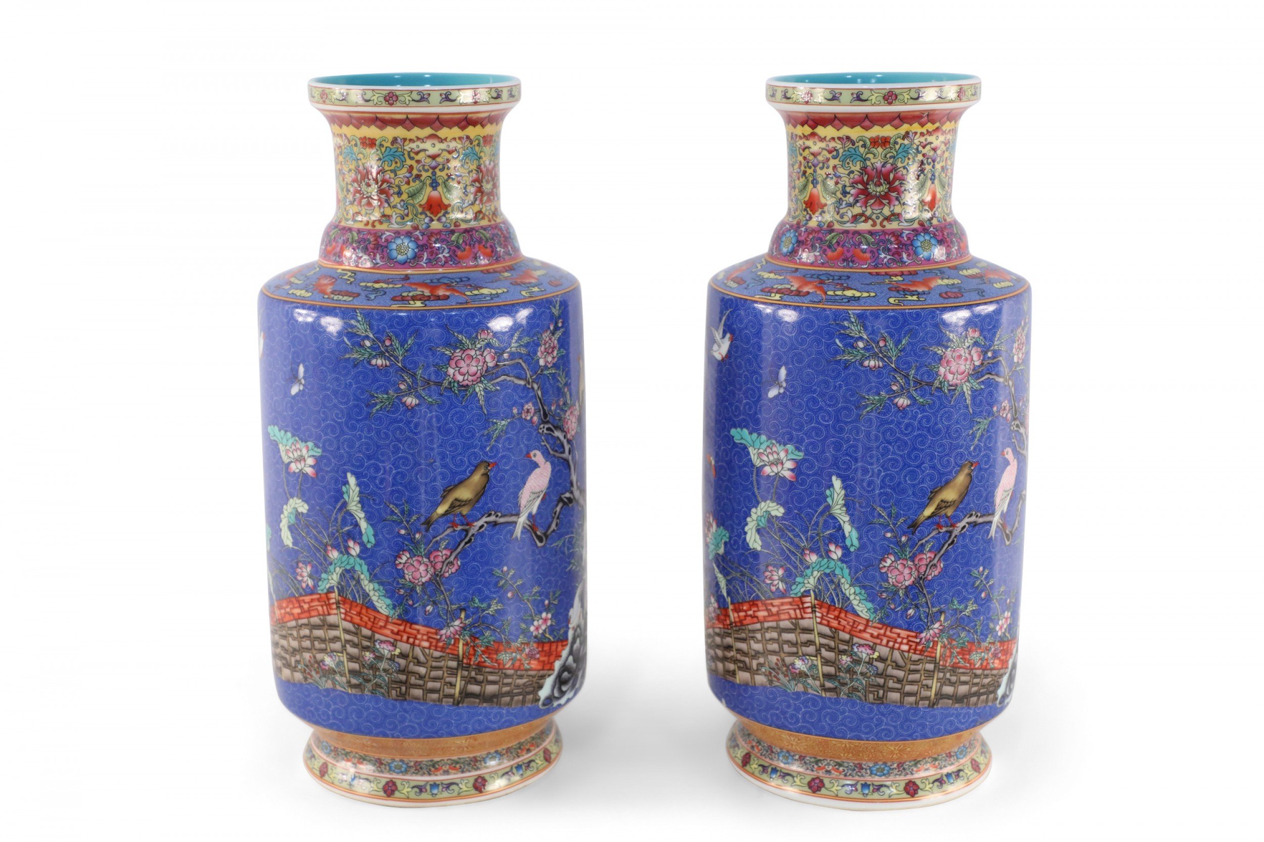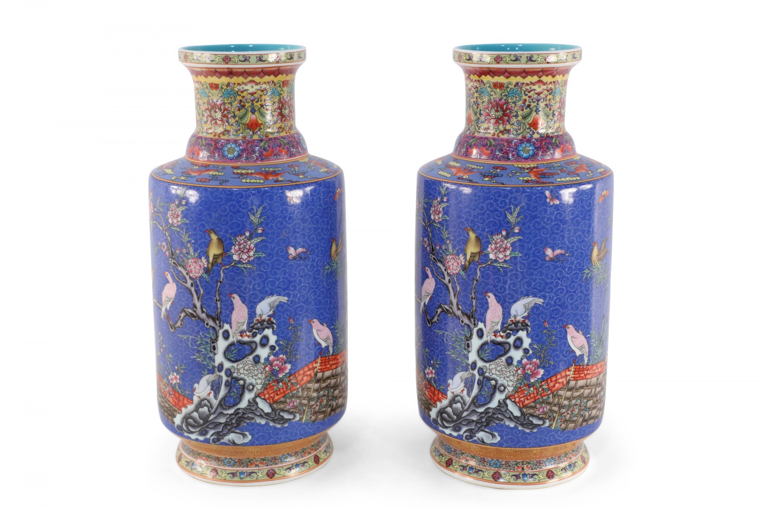 PAIR of Chinese Qing Dynasty Qianlong Period-style (Mid-20th Century) blue porcelain mallet bottles with famille floral patterns and birds consisting of nine, painted layers in homage to the positive symbolism of the number 9 in Chinese culture. (PRICED AS PAIR).