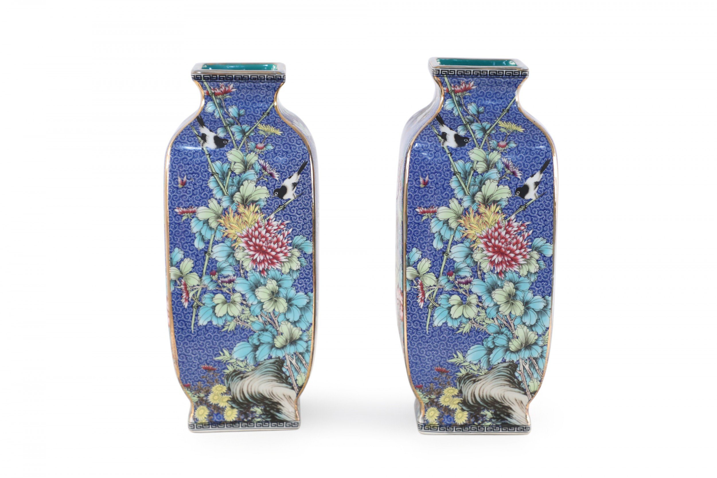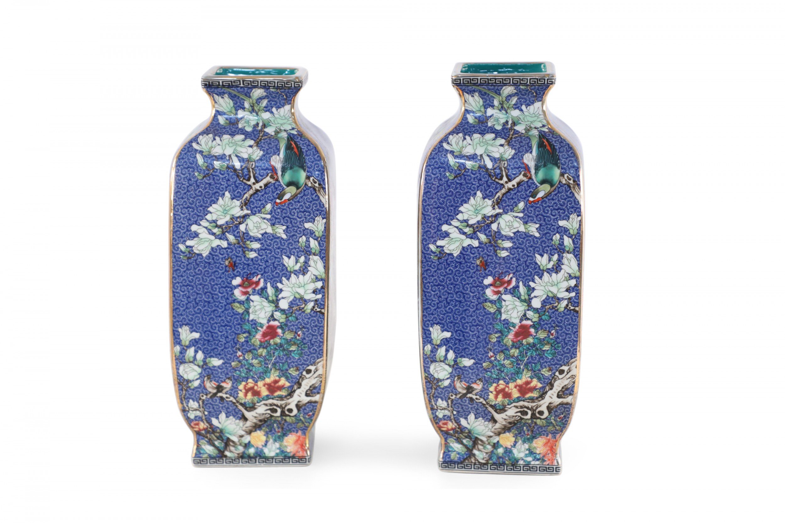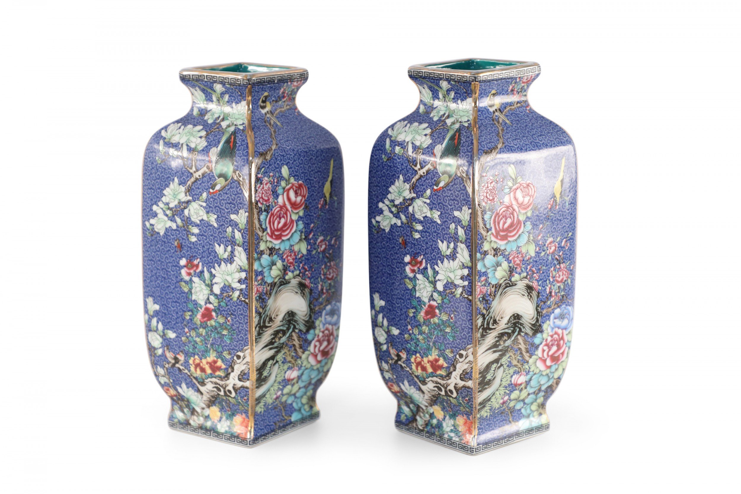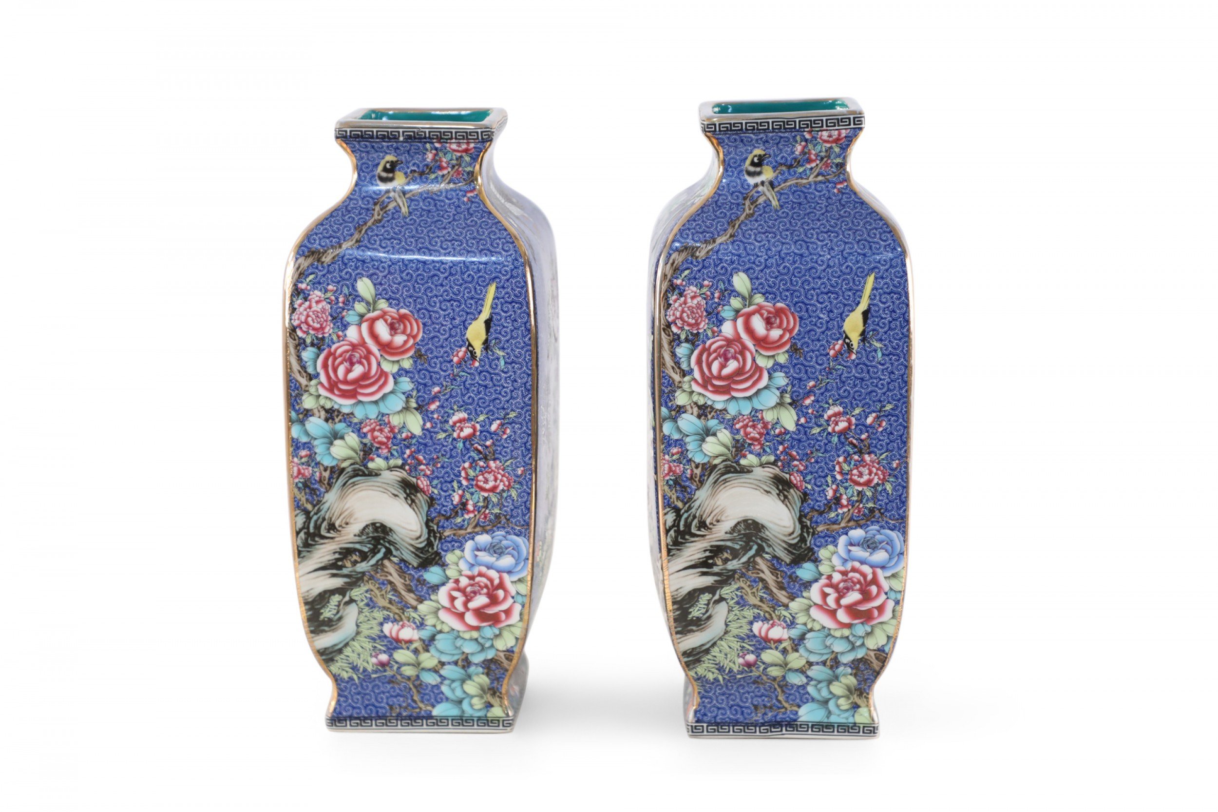 PAIR of Chinese Qing Dynasty Qianlong Period-style blue porcelain sleeve vases, decorated with birds and butterflies amid colorful florals and a Greek key pattern along the tops and bases (mark on bottom) (PRICED AS PAIR)..