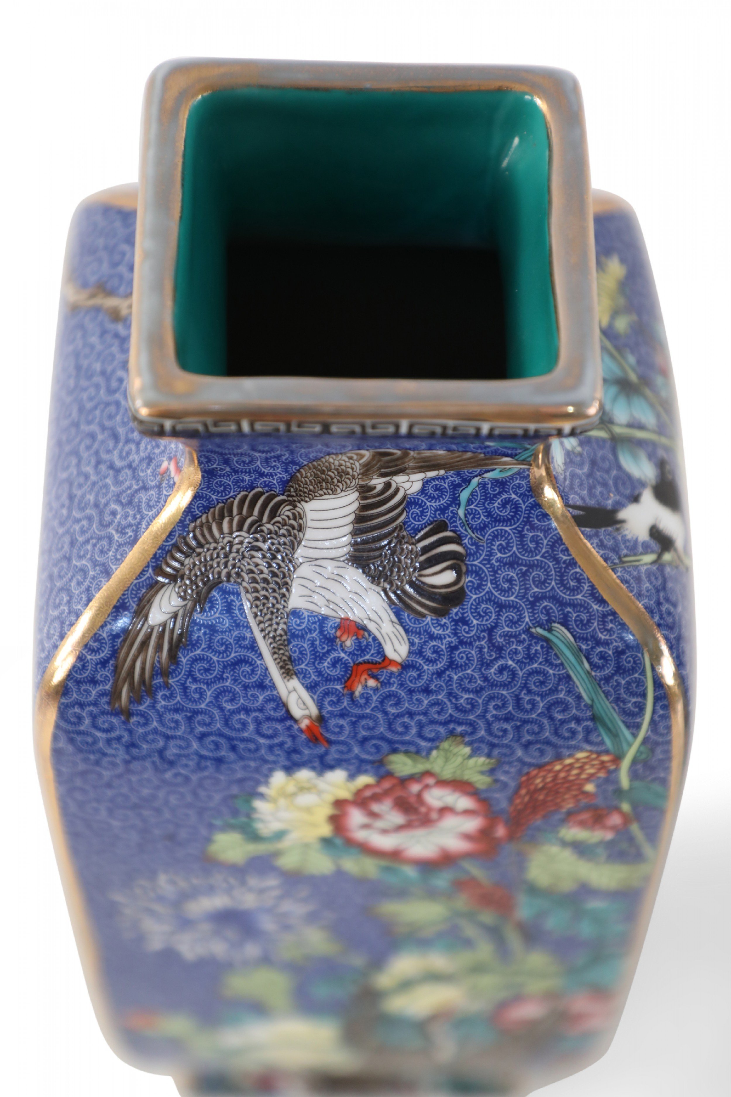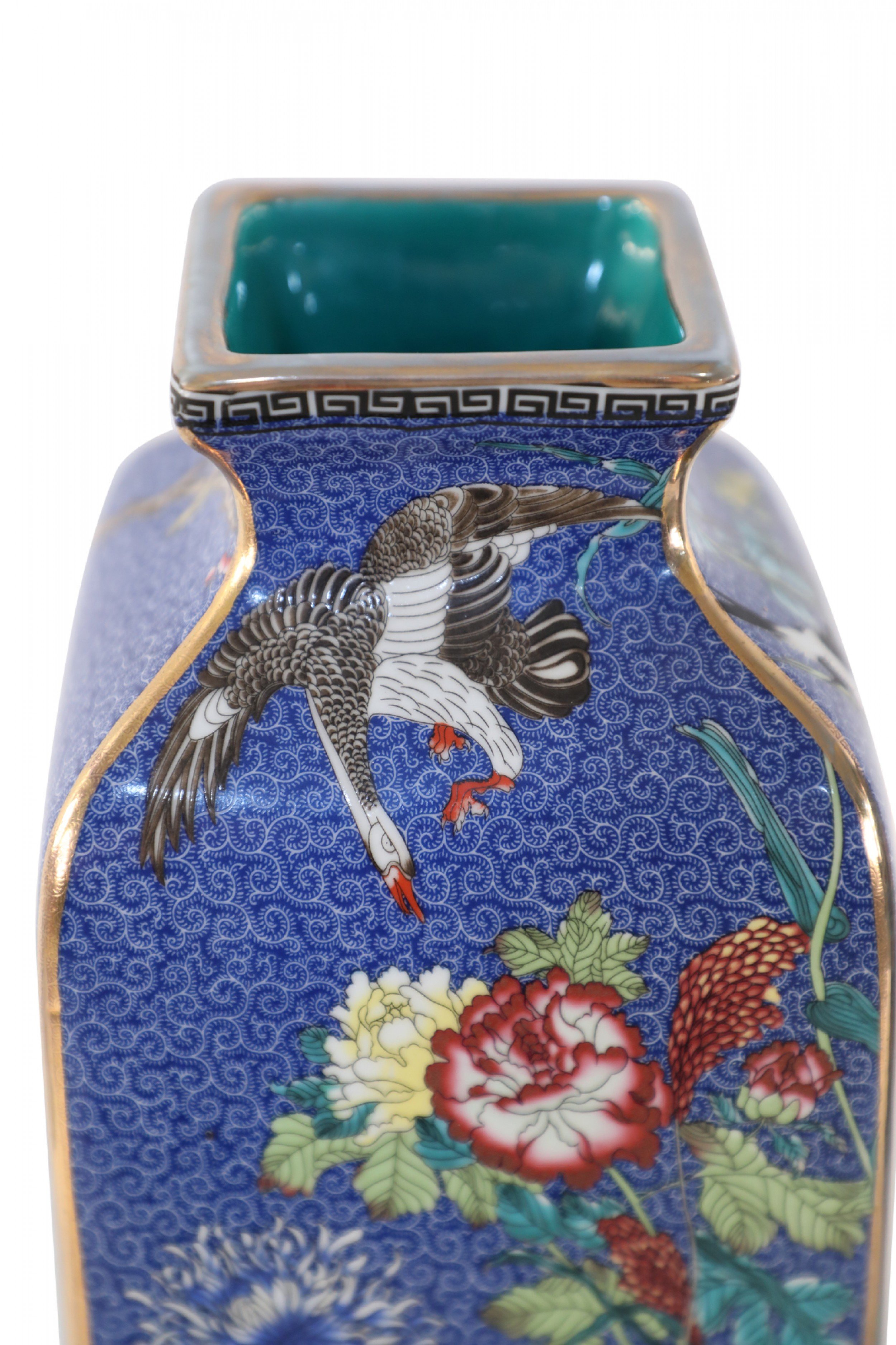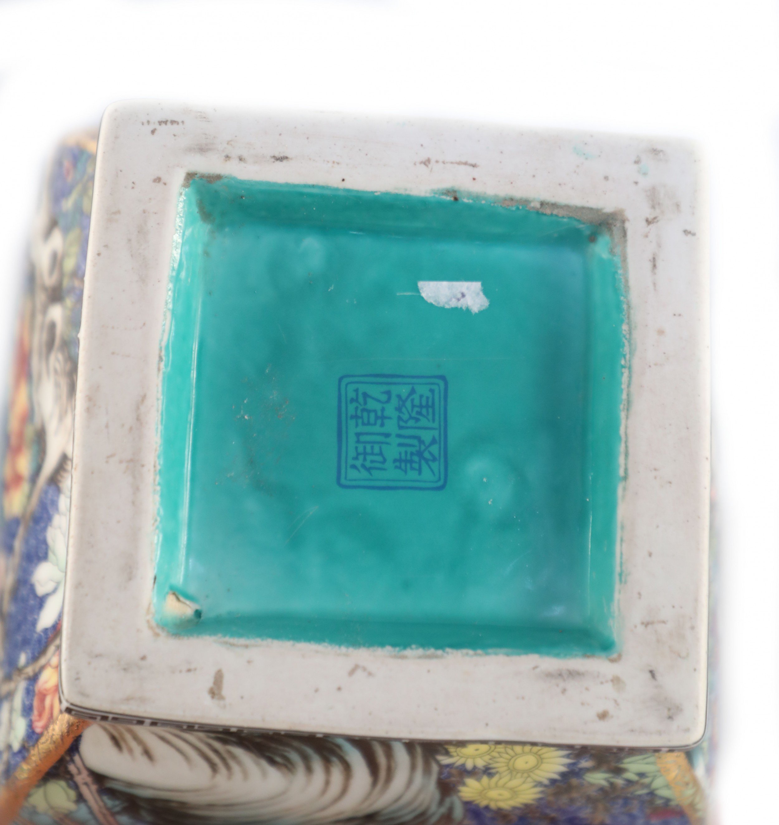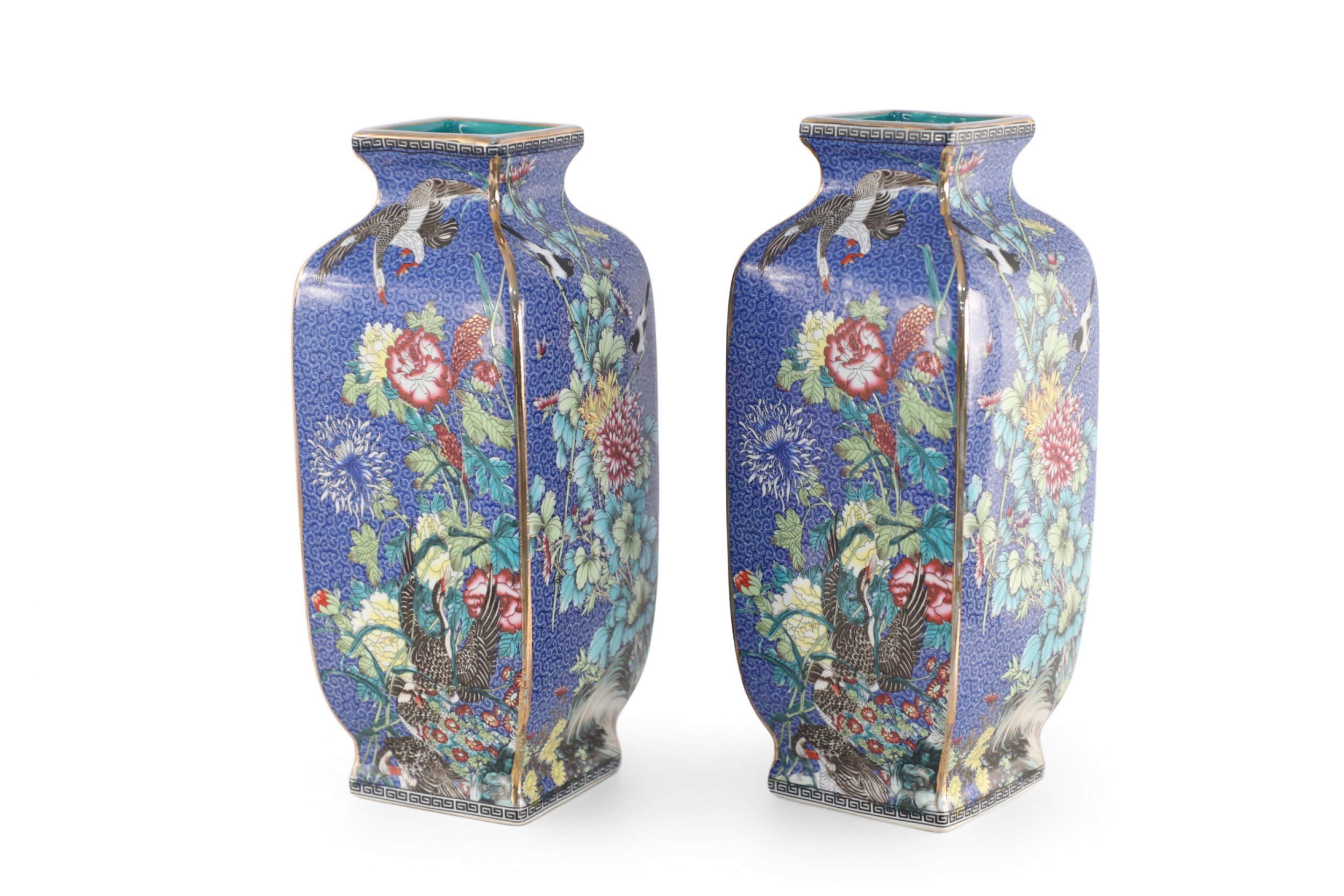PAIR of Chinese Qing Dynasty Qianlong Period-style blue porcelain sleeve vases, decorated with birds and butterflies amid colorful florals and a Greek key pattern along the tops and bases (mark on bottom) (PRICED AS PAIR)..