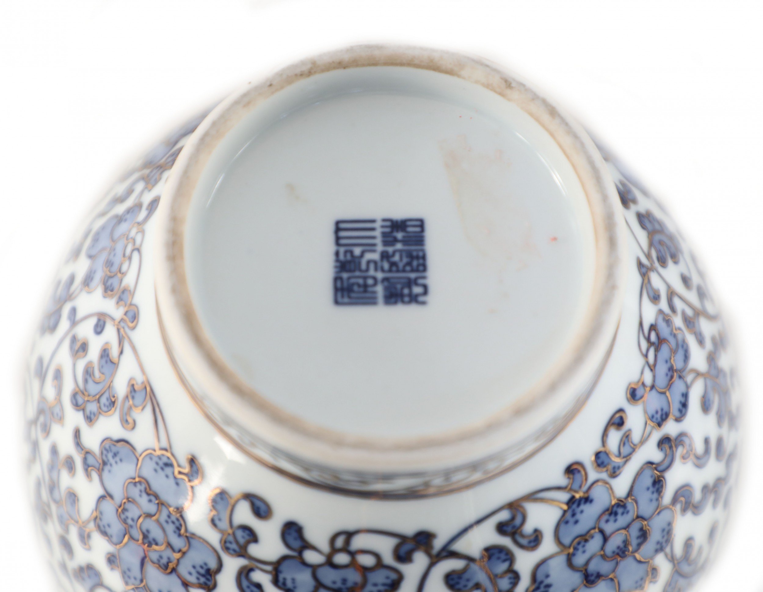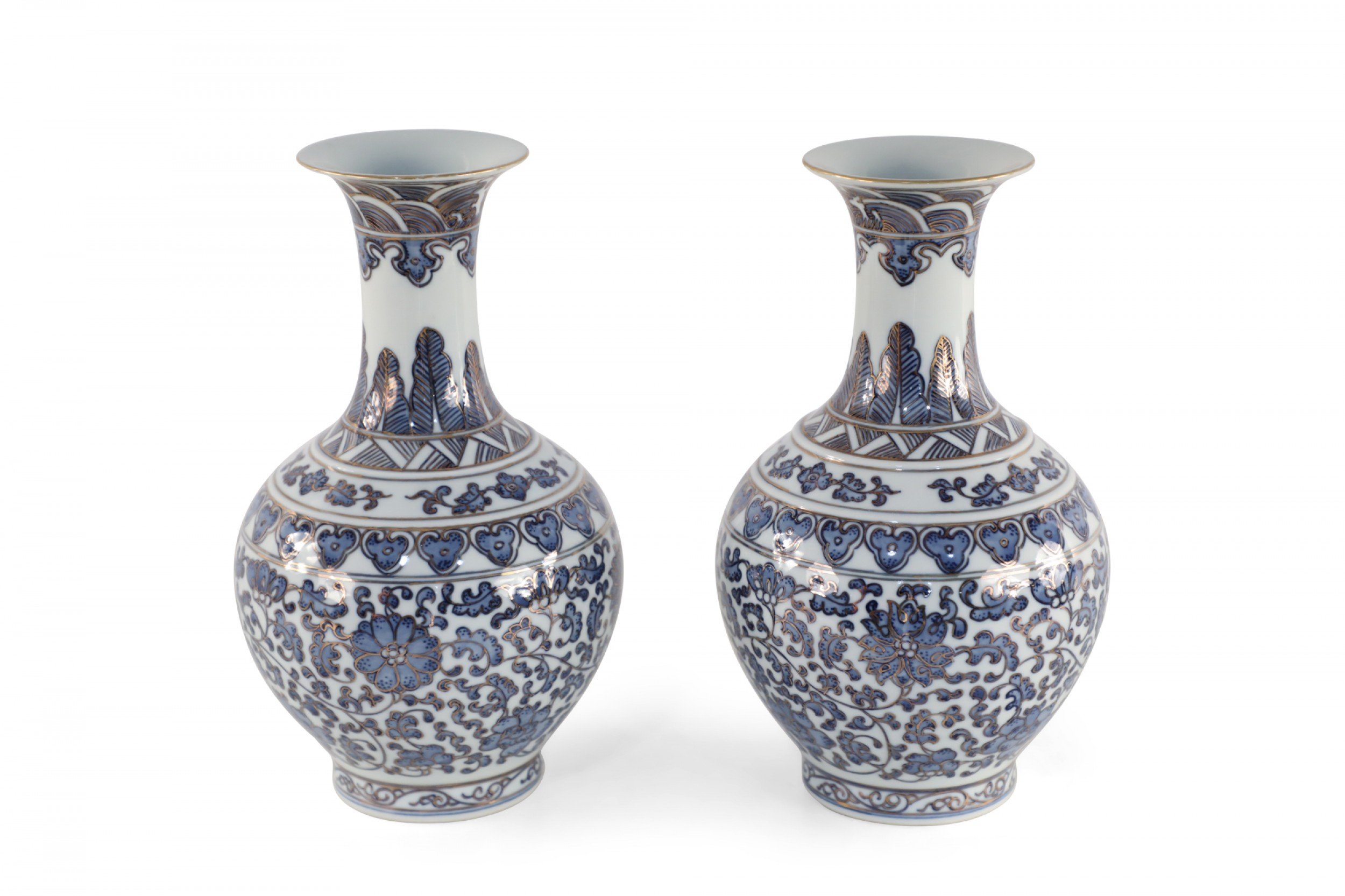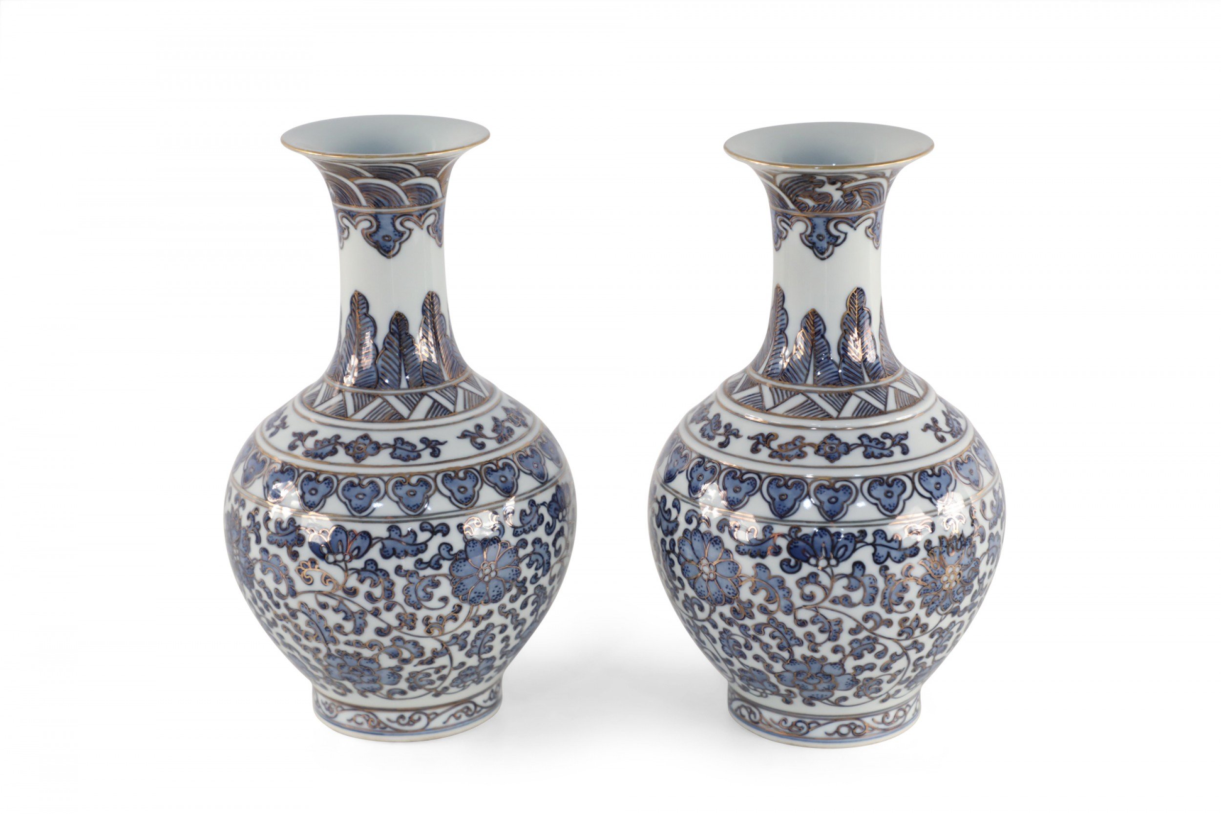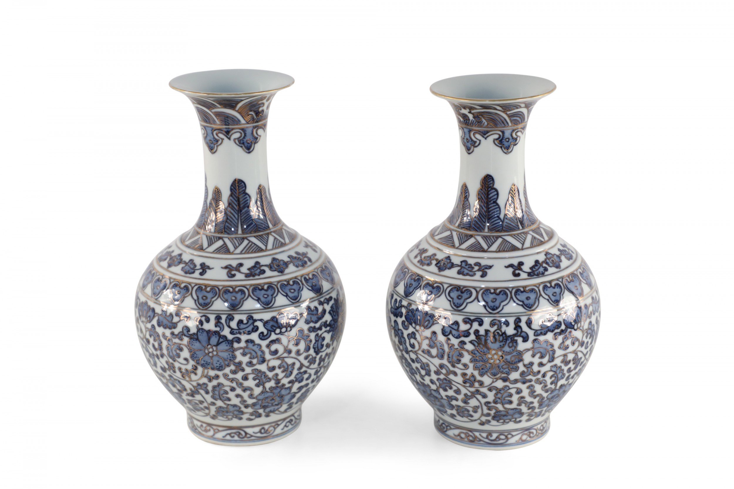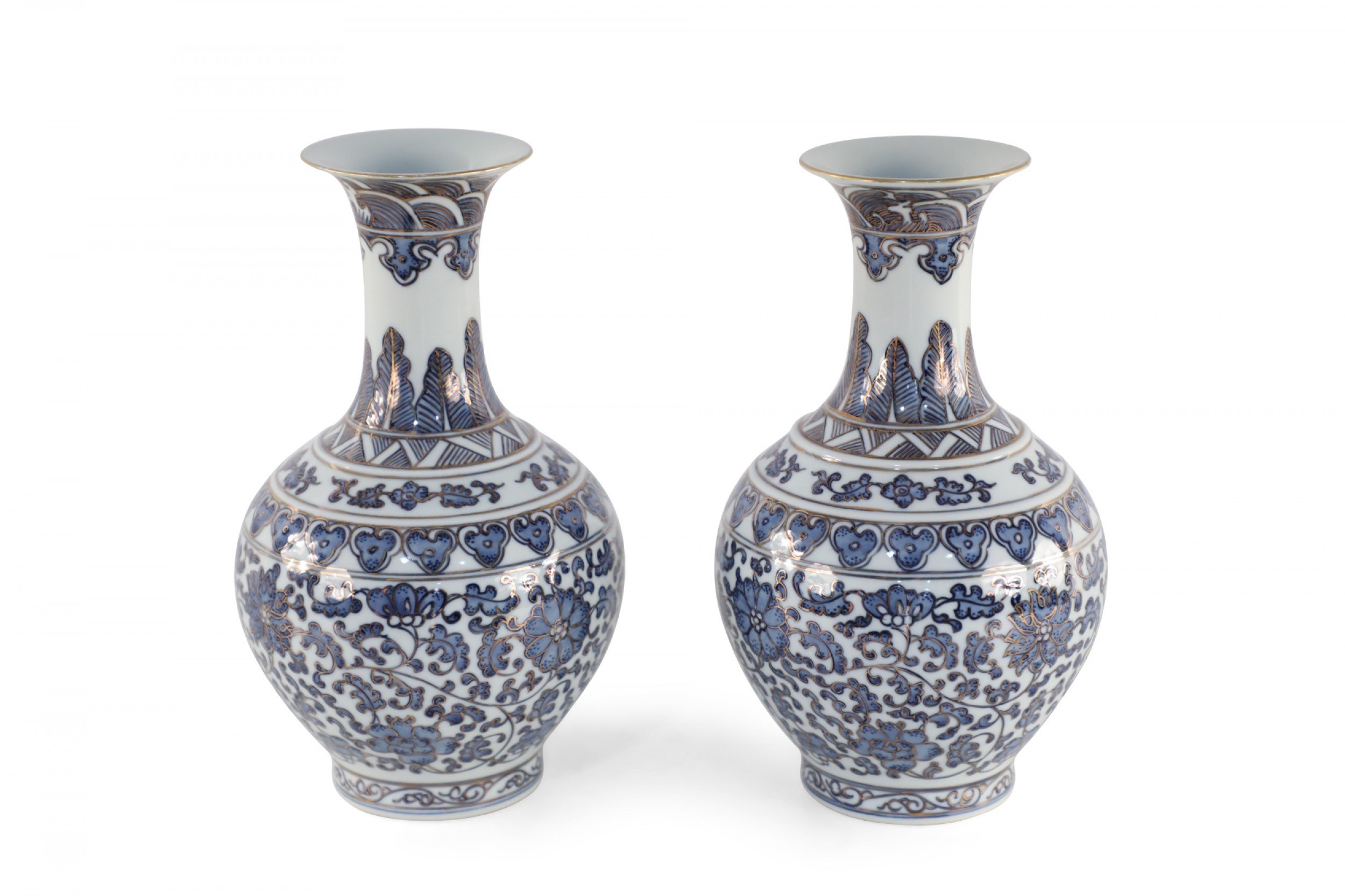PAIR of Chinese Qing Dynasty Qianlong Period-style (Mid-20th Century) globular, white porcelain vases with blue scroll and floral designs accented by gold line work. (mark on bottoms) (PRICED AS PAIR).