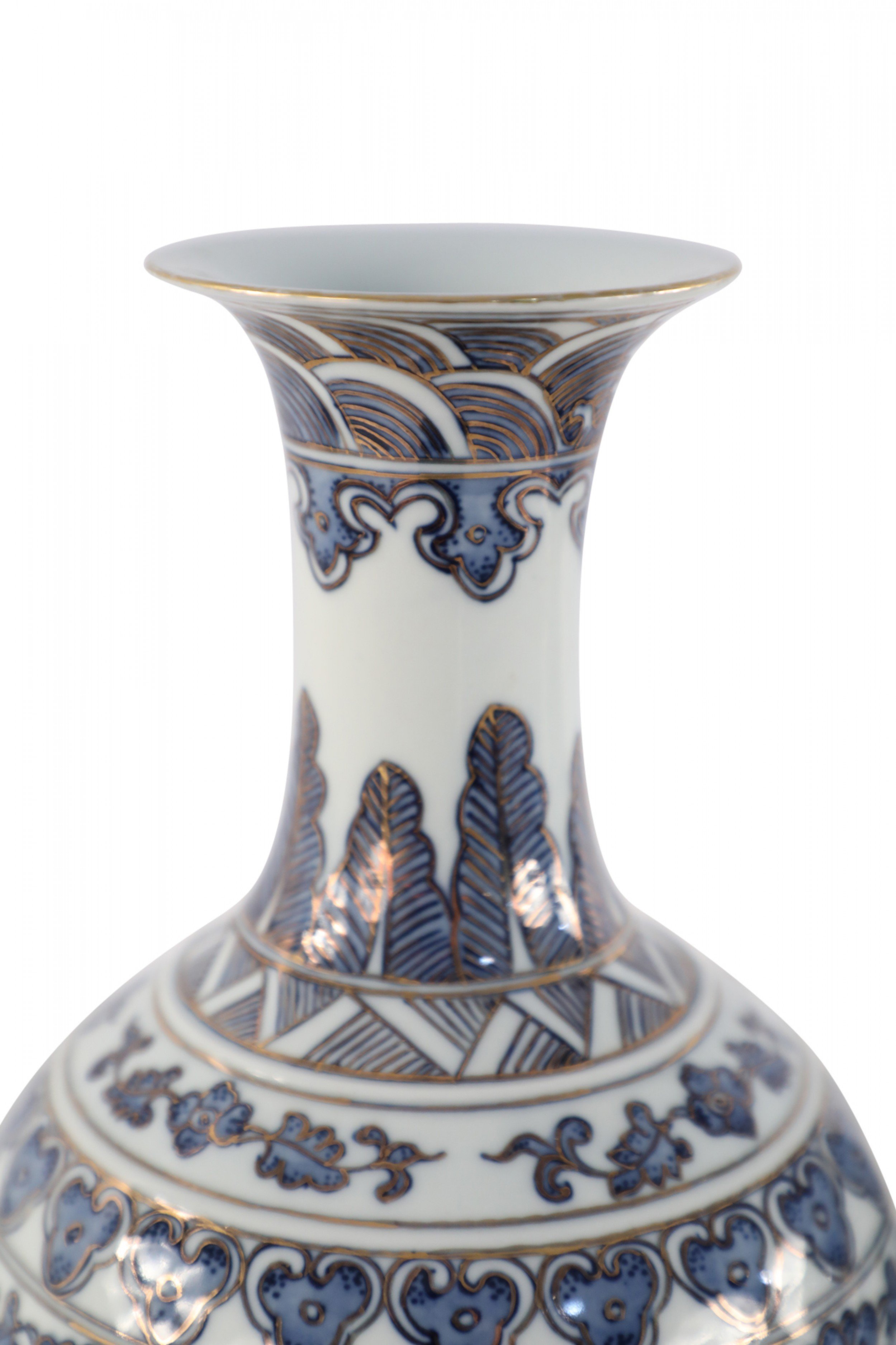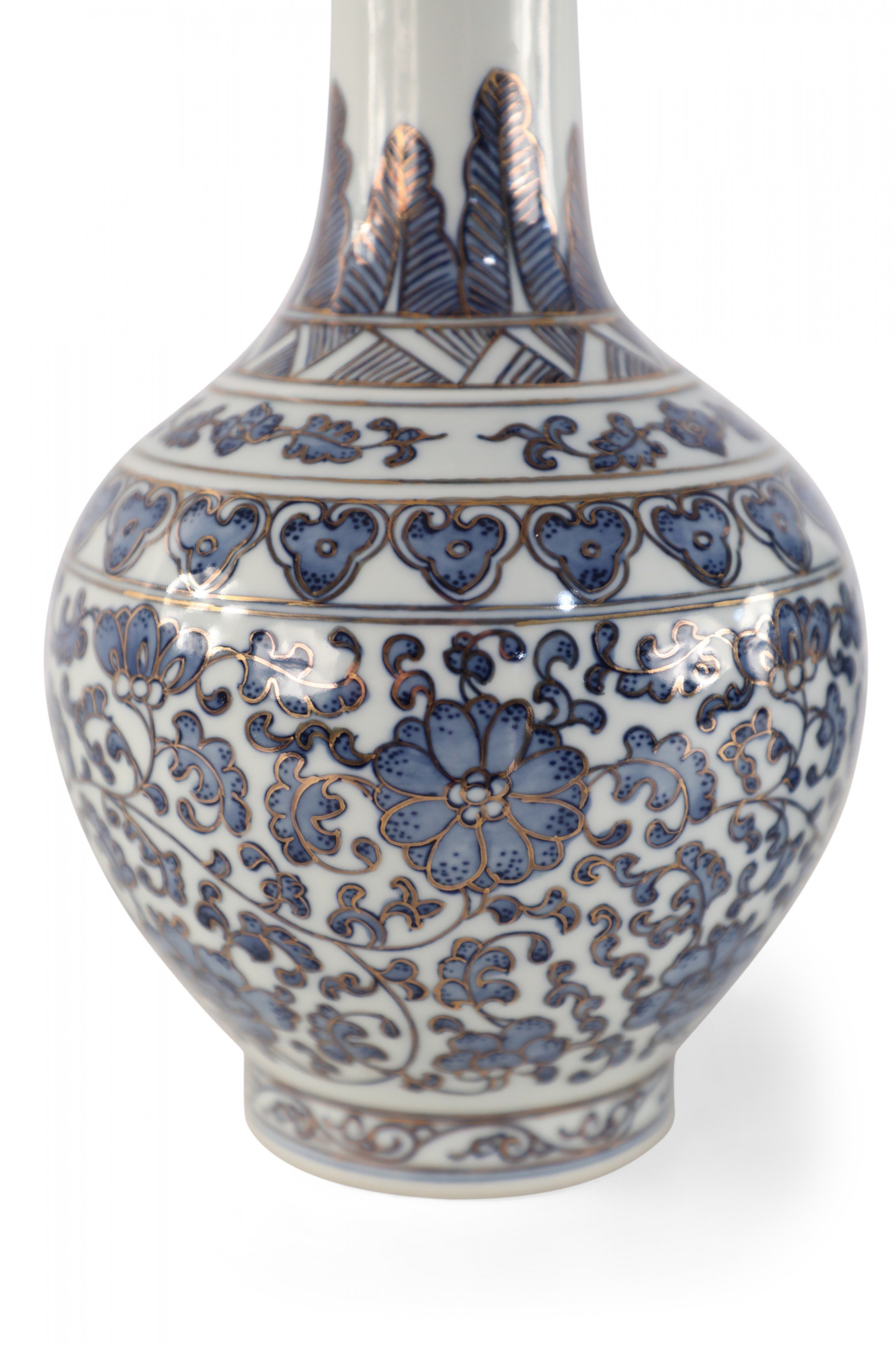 PAIR of Chinese Qing Dynasty Qianlong Period-style (Mid-20th Century) globular, white porcelain vases with blue scroll and floral designs accented by gold line work. (mark on bottoms) (PRICED AS PAIR)..