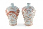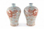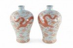 Pair of Chinese Qing Dynasty Style Gray and Alum Red Dragon Motif Meiping Porcelain Vases