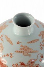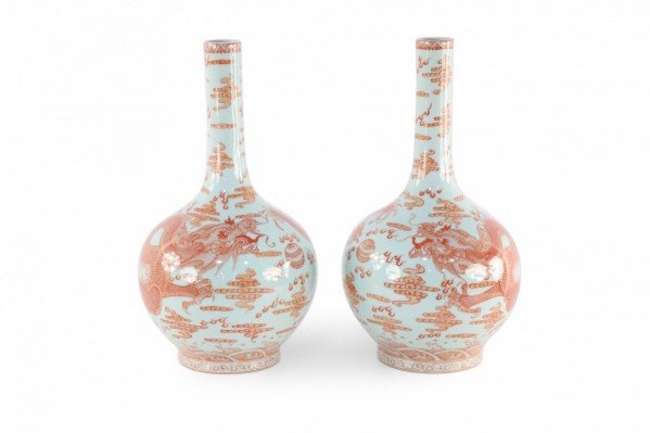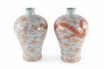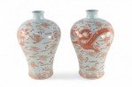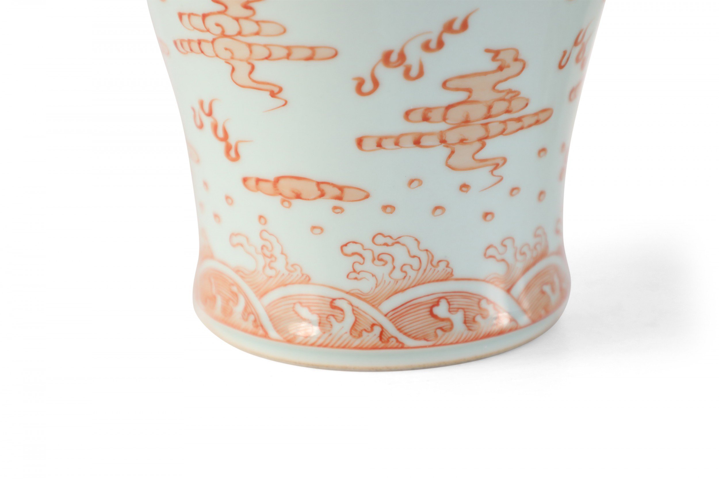 PAIR of Chinese Qing Dynasty Yongzheng Period-style (Mid-20th Century) light gray porcelain vases with Meiping forms wrapped in orange red alum glaze dragon motifs (mark on bottoms, see photos) (PRICED AS PAIR) (Similar pieces: NWL2060).