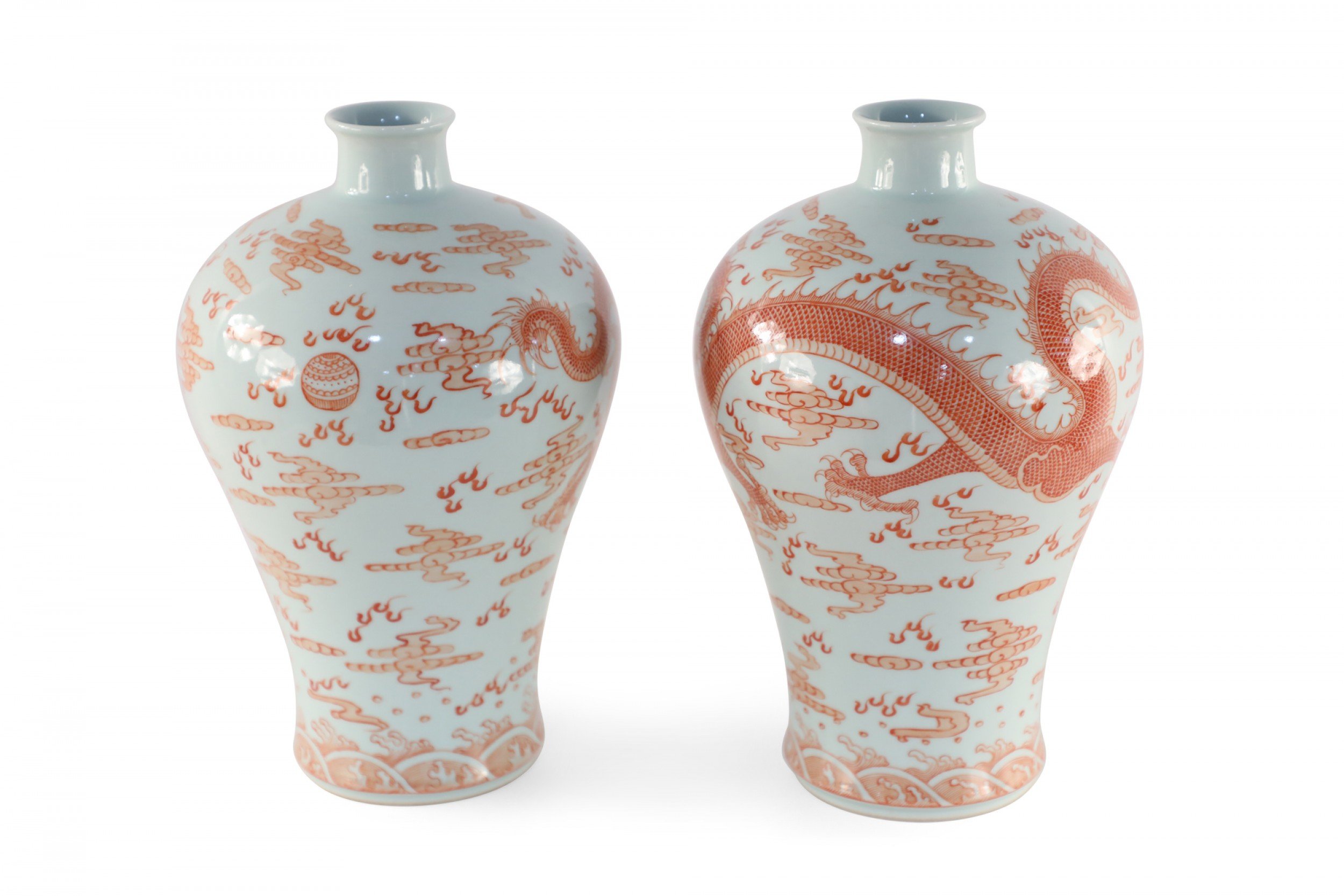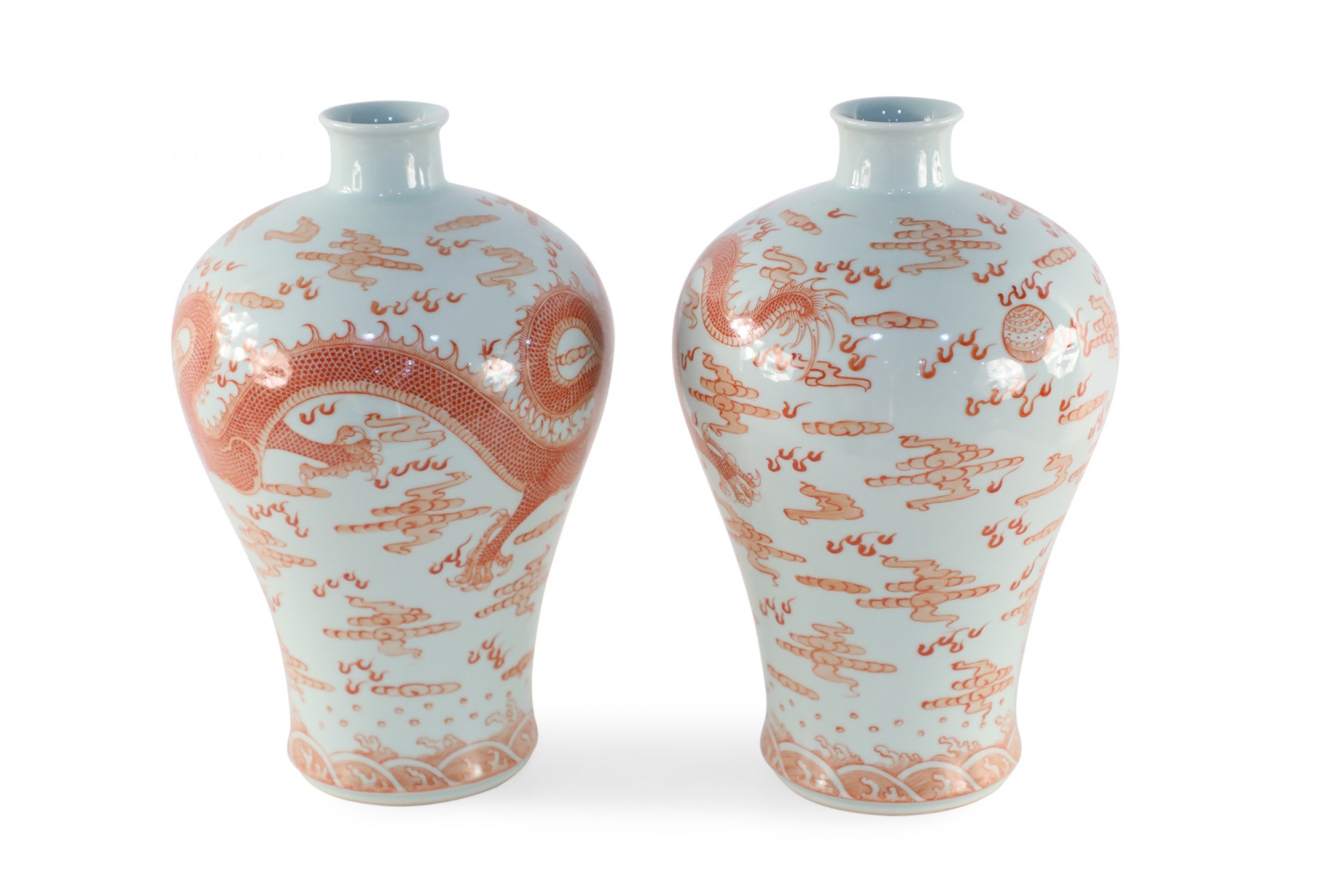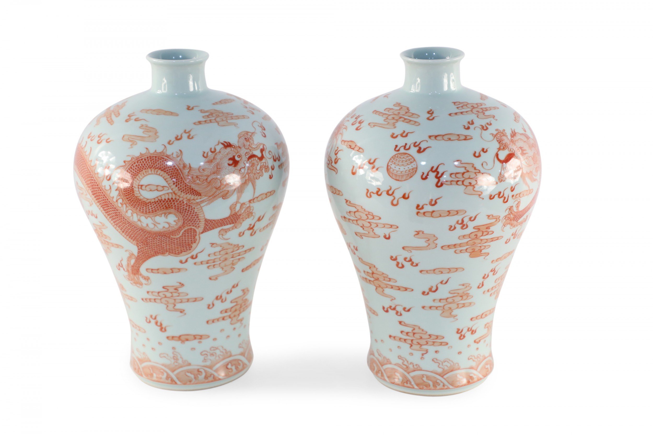 PAIR of Chinese Qing Dynasty Yongzheng Period-style (Mid-20th Century) light gray porcelain vases with Meiping forms wrapped in orange red alum glaze dragon motifs (mark on bottoms, see photos) (PRICED AS PAIR) (Similar pieces: NWL2060)