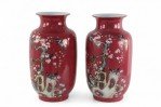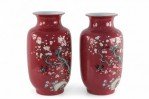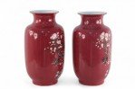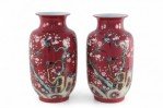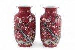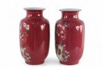 Pair of Chinese Qing Dynasty Style Red and Floral Magpie Motif Porcelain Sleeve Vases