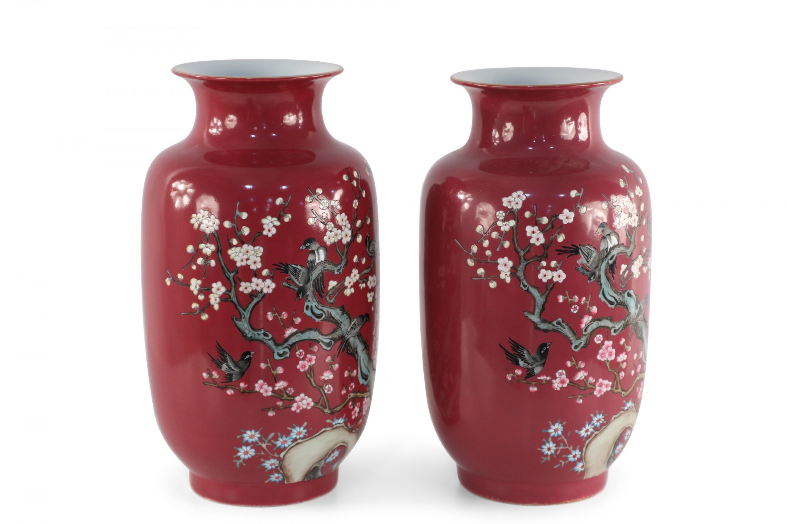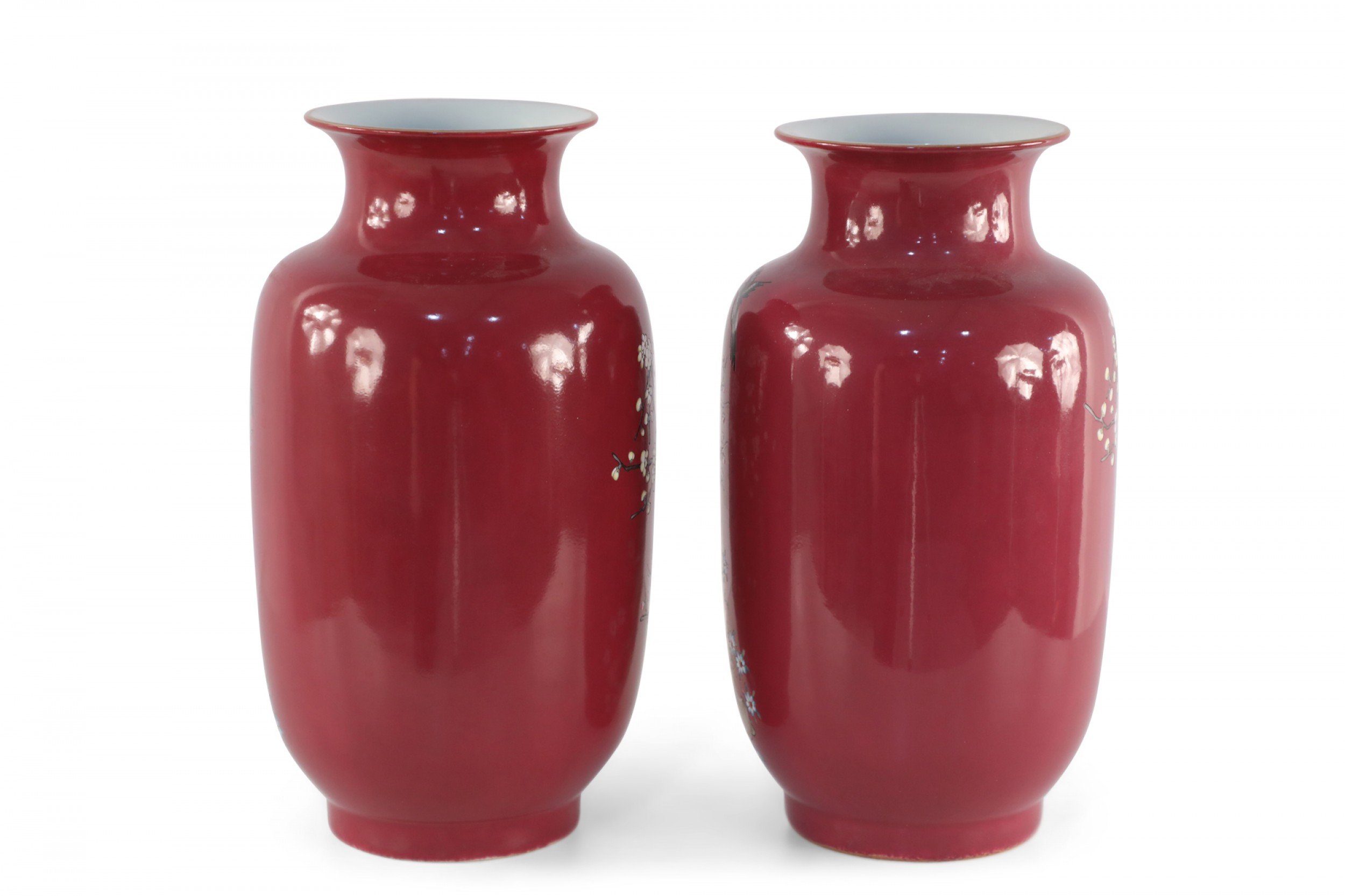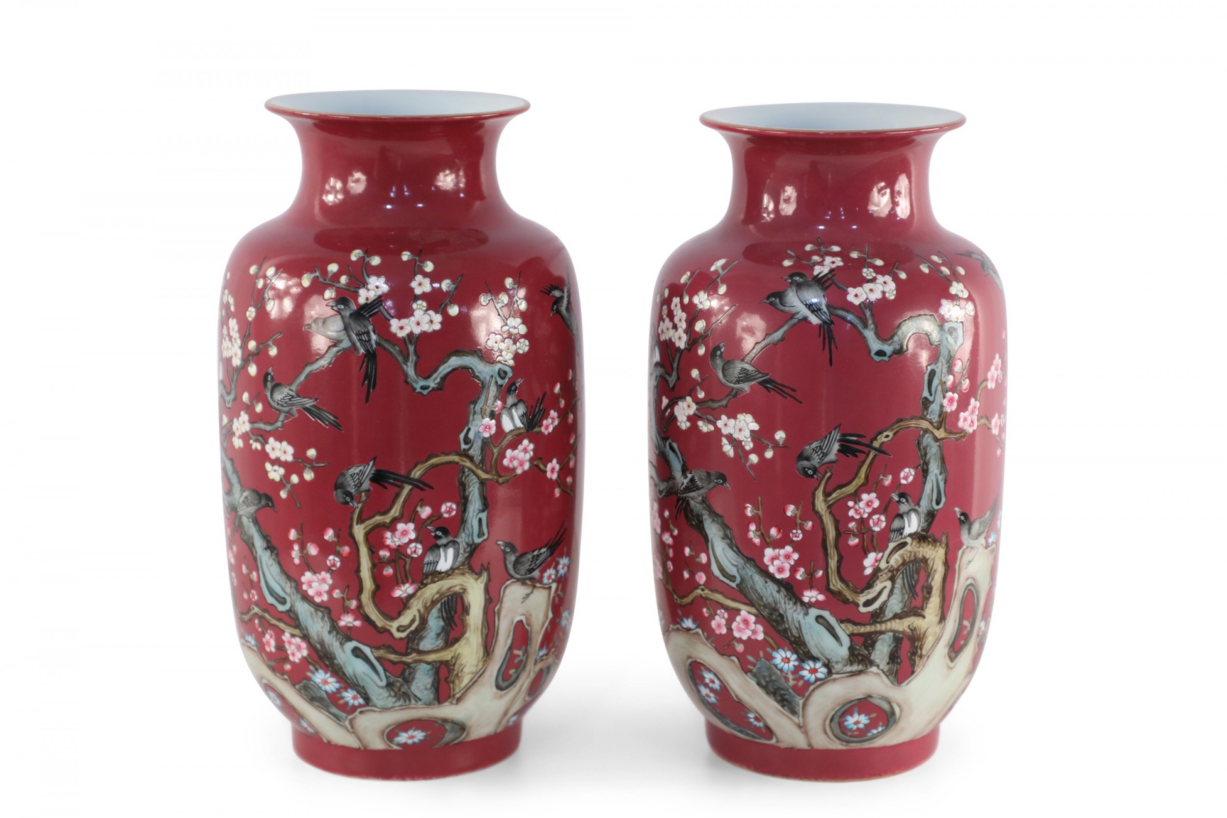PAIR of Chinese Qing Dynasty Qianlong Period-style (early 20th Century) red porcelain sleeve vases decorated with plum blossoms and magpie birds, which together carry the auspicious message "be radiant with joy."(mark on bottom) (PRICED AS PAIR)..