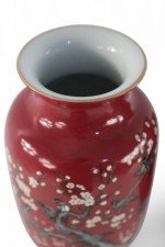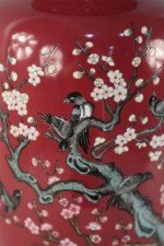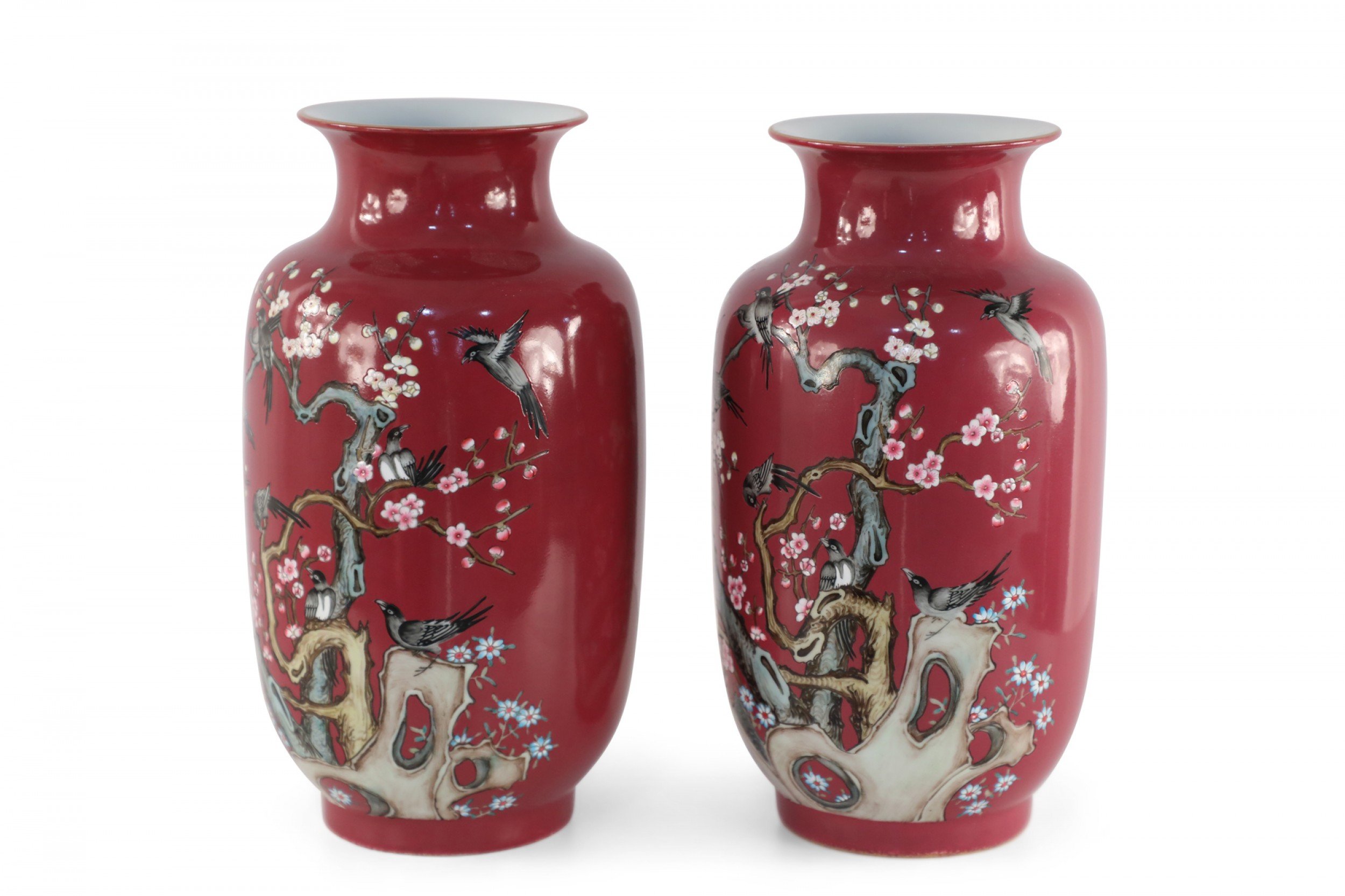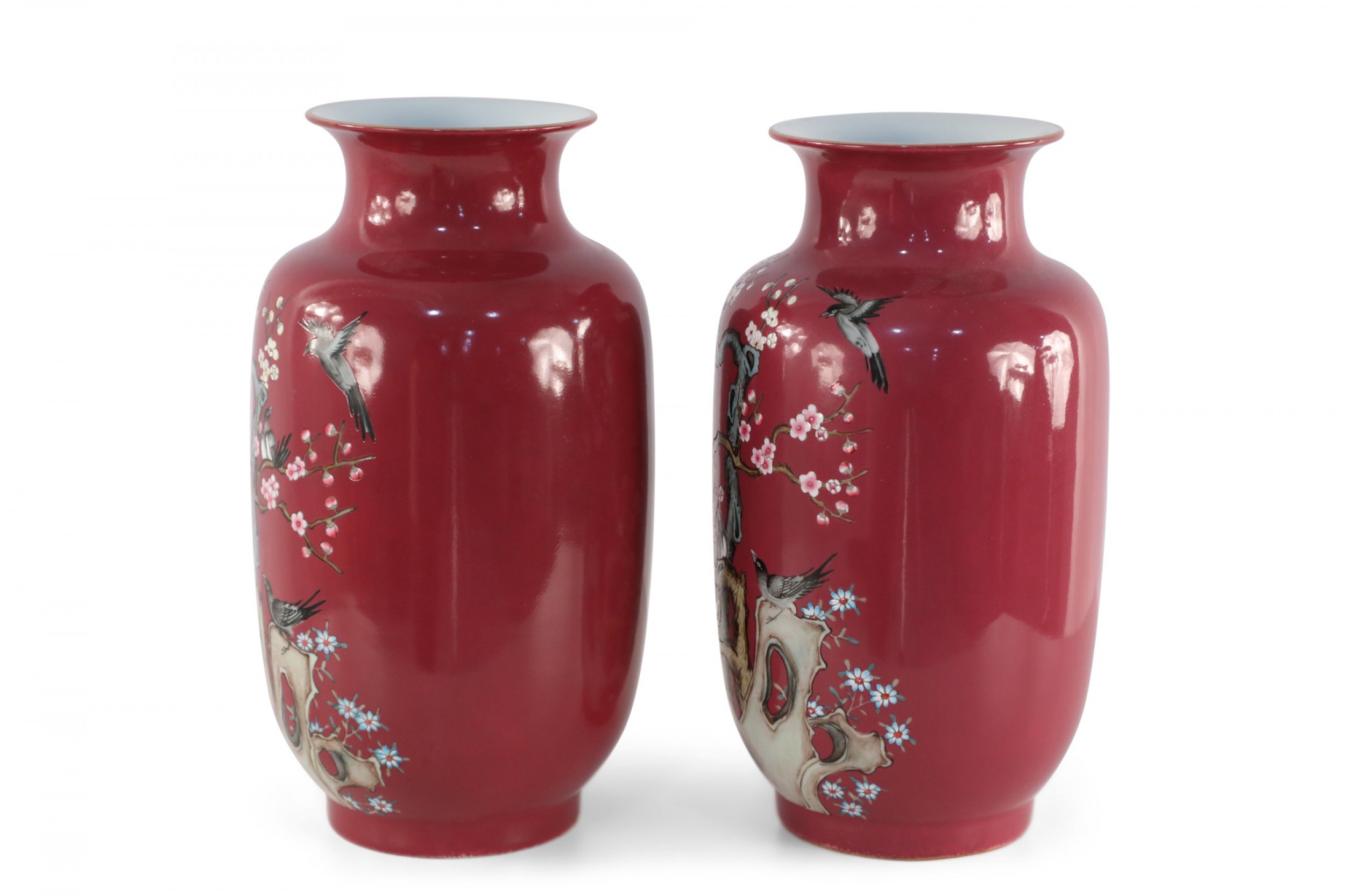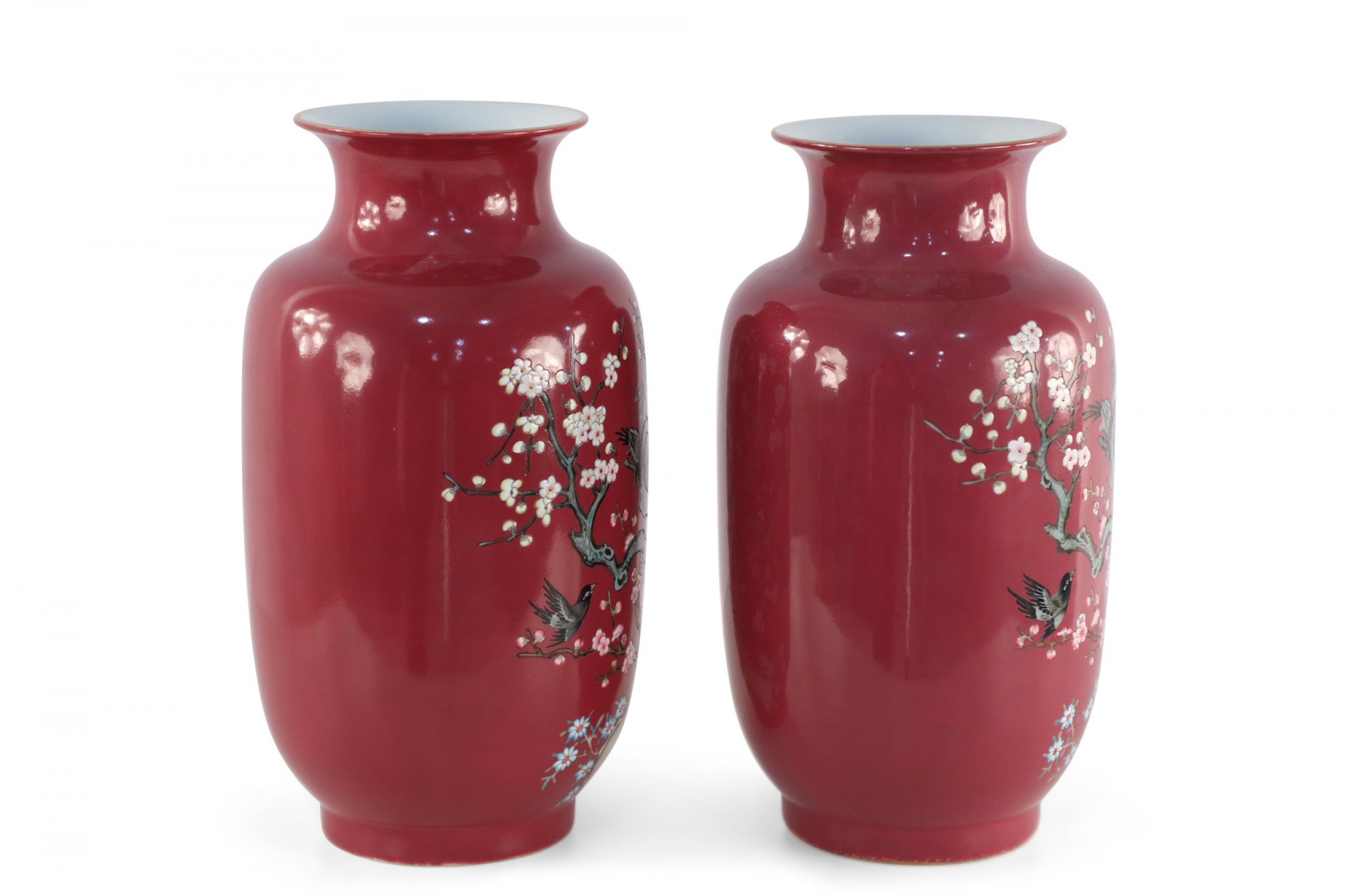 PAIR of Chinese Qing Dynasty Qianlong Period-style (early 20th Century) red porcelain sleeve vases decorated with plum blossoms and magpie birds, which together carry the auspicious message "be radiant with joy."(mark on bottom) (PRICED AS PAIR)..
