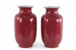 PAIR of Chinese Qing Dynasty Qianlong Period-style (early 20th Century) red porcelain sleeve vases decorated with plum blossoms and magpie birds, which together carry the auspicious message "be radiant with joy."(mark on bottom) (PRICED AS PAIR).