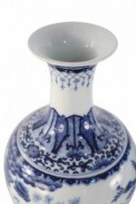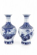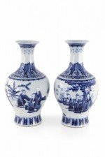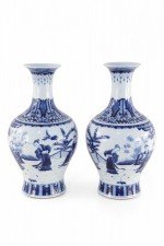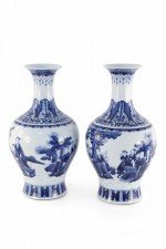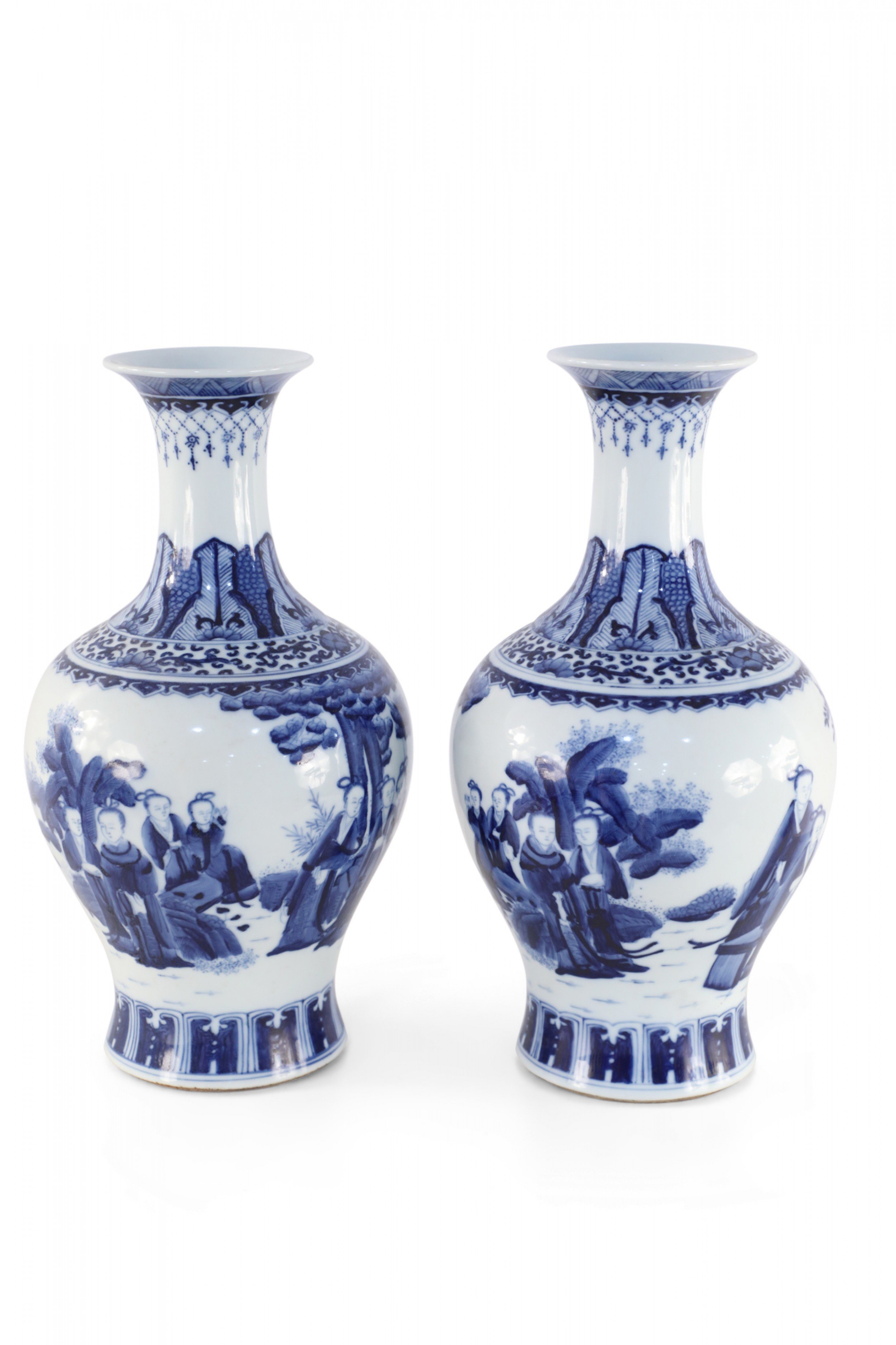 Pair of Chinese Qing Dynasty Style White and Blue Figurative Scene Porcelain Vases