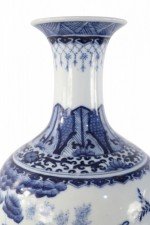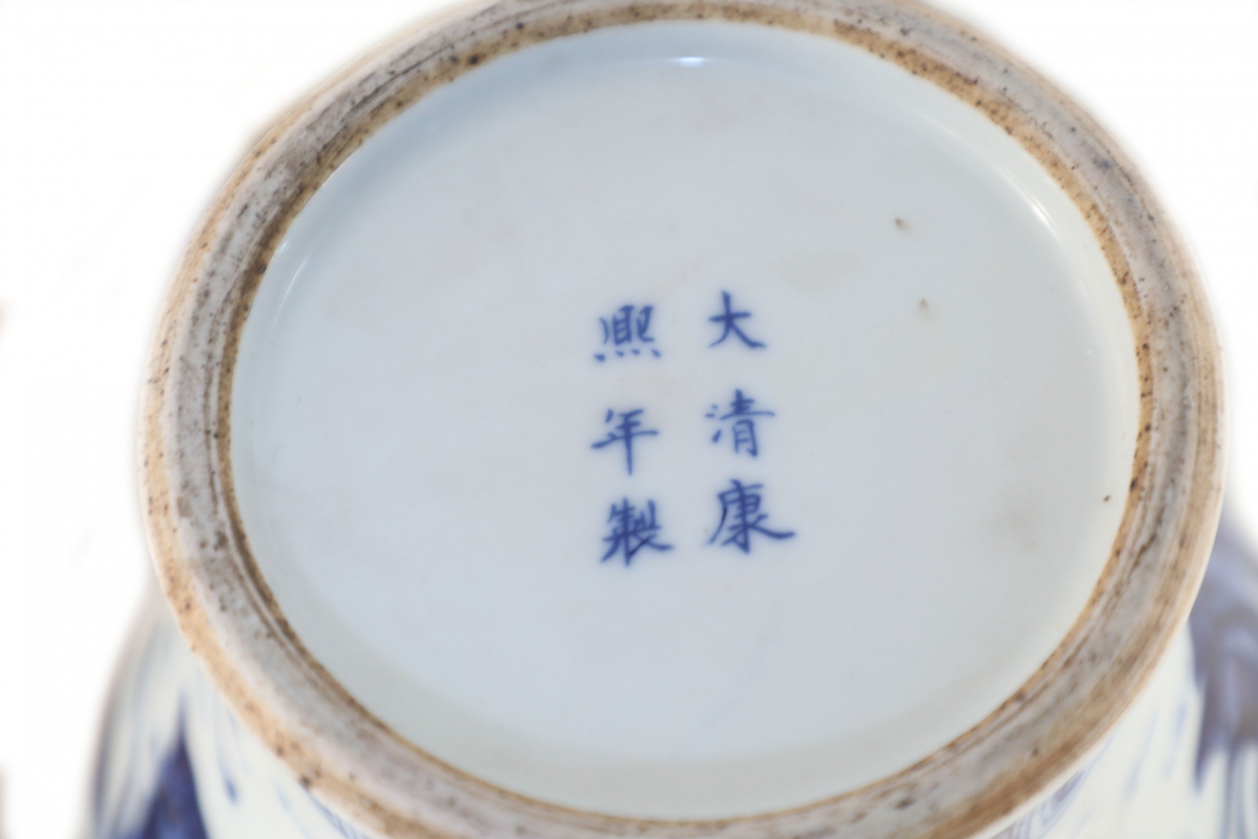 PAIR of Chinese Qing Dynasty Kangxi Period-style (Mid-20th Century) white and blue, pear-shaped porcelain vases depicting women in a pastoral setting and decorative patterns along the neck (mark on bottoms) (PRICED AS PAIR)..
