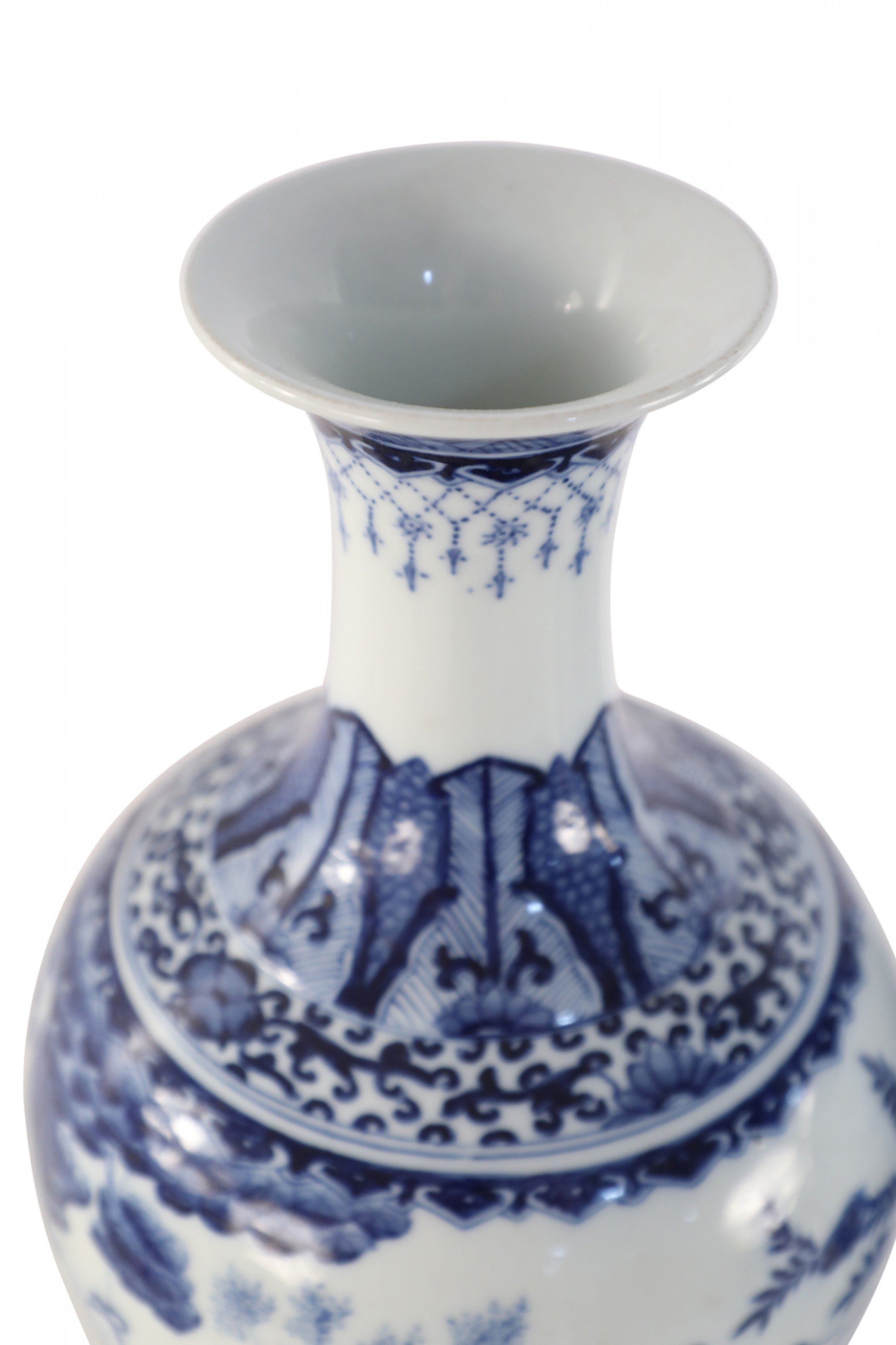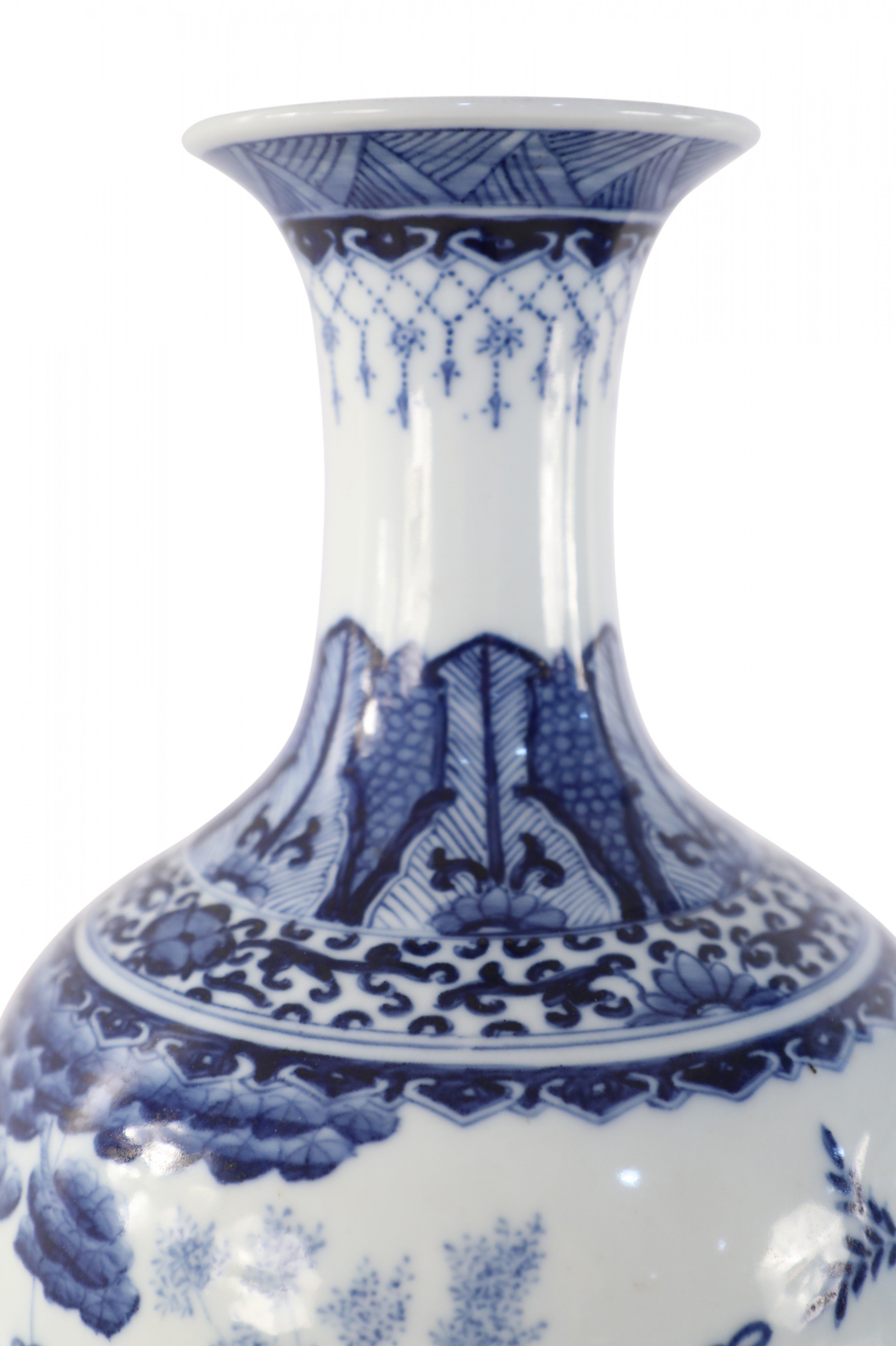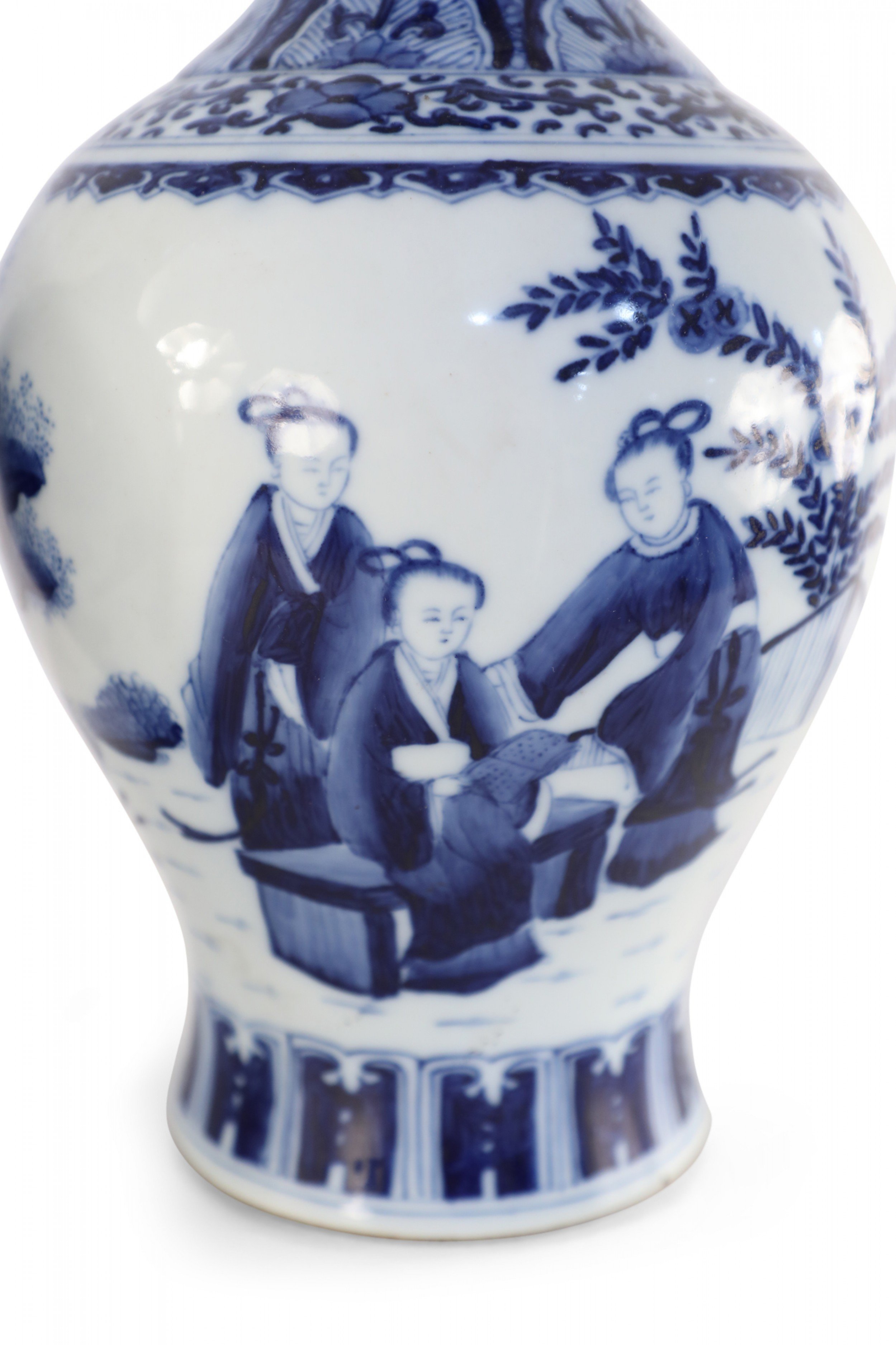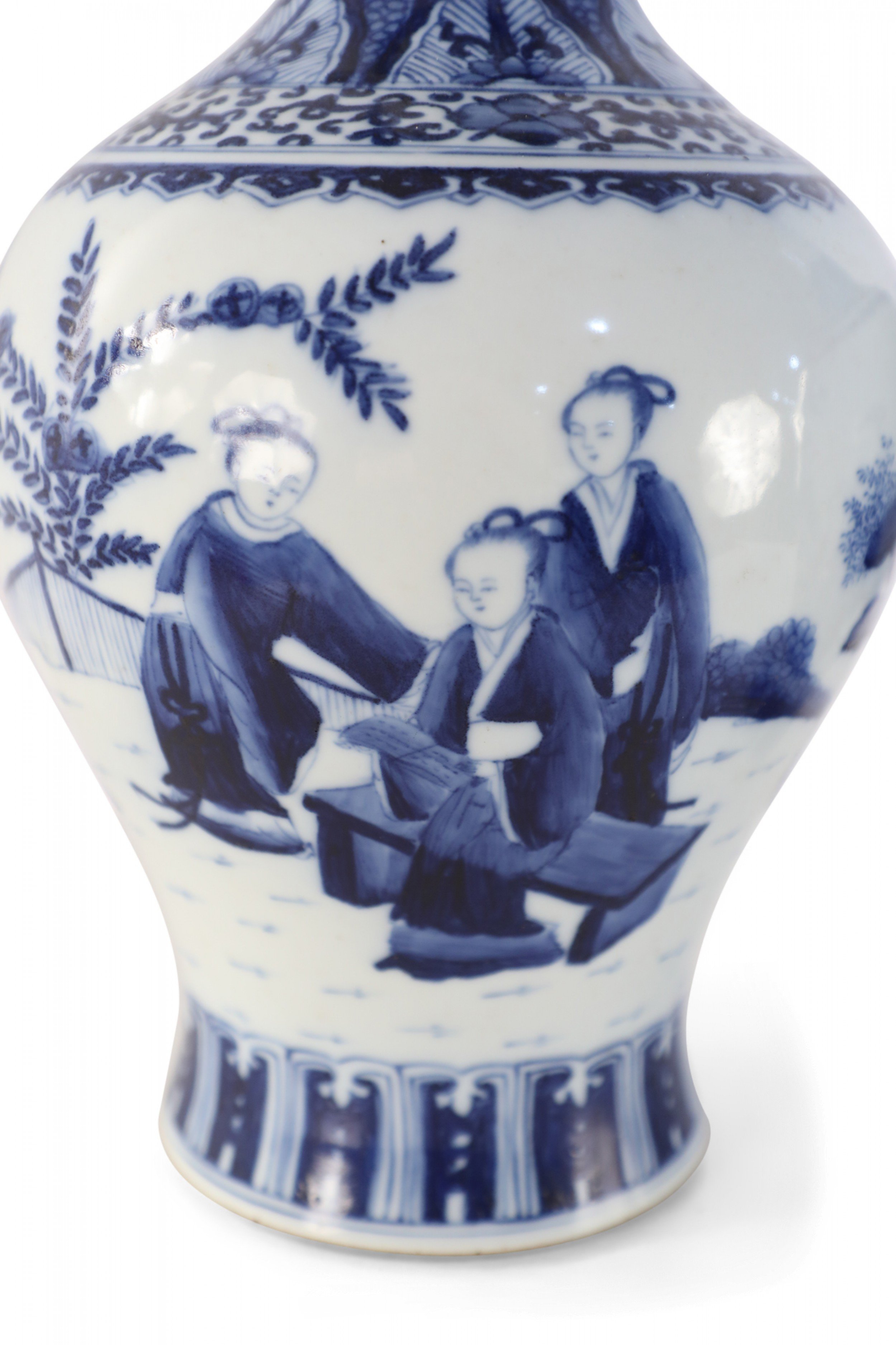 PAIR of Chinese Qing Dynasty Kangxi Period-style (Mid-20th Century) white and blue, pear-shaped porcelain vases depicting women in a pastoral setting and decorative patterns along the neck (mark on bottoms) (PRICED AS PAIR).