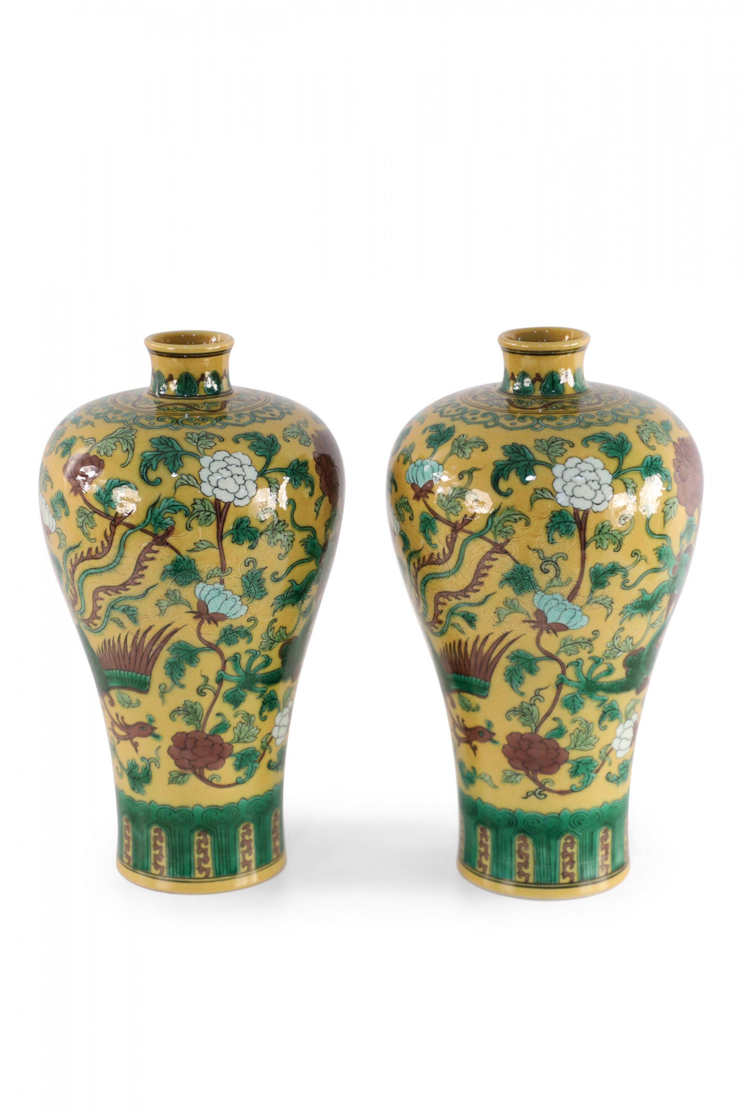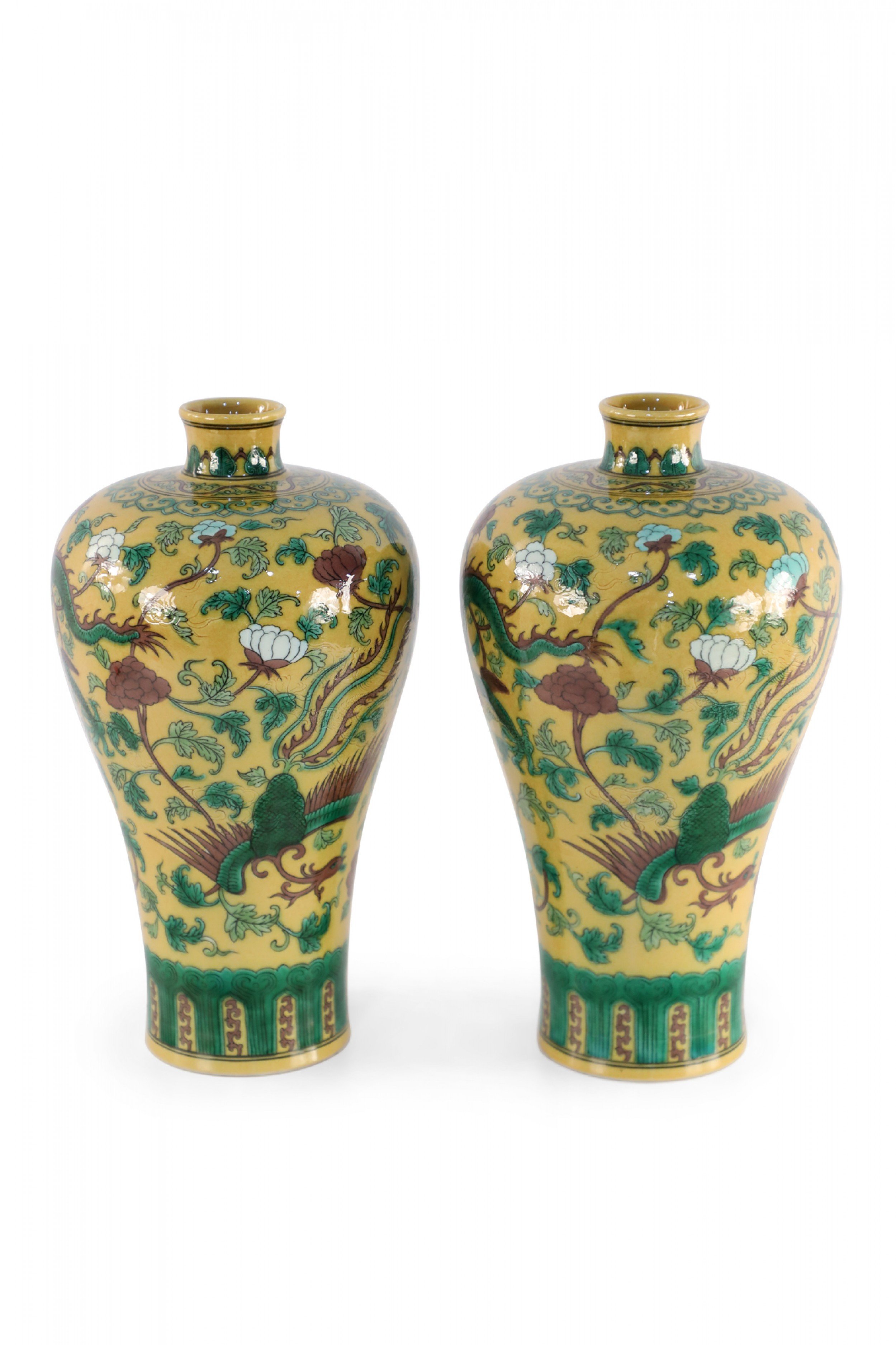 PAIR of Chinese Qing Dynasty Kangxi Period-style (Mid-20th Century) yellow ceramic vases with Meiping forms wrapped in green floral and dragon motifs, and decorative bands leading up to the openings and bases (mark on bottom)(PRICED AS PAIR).