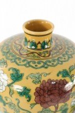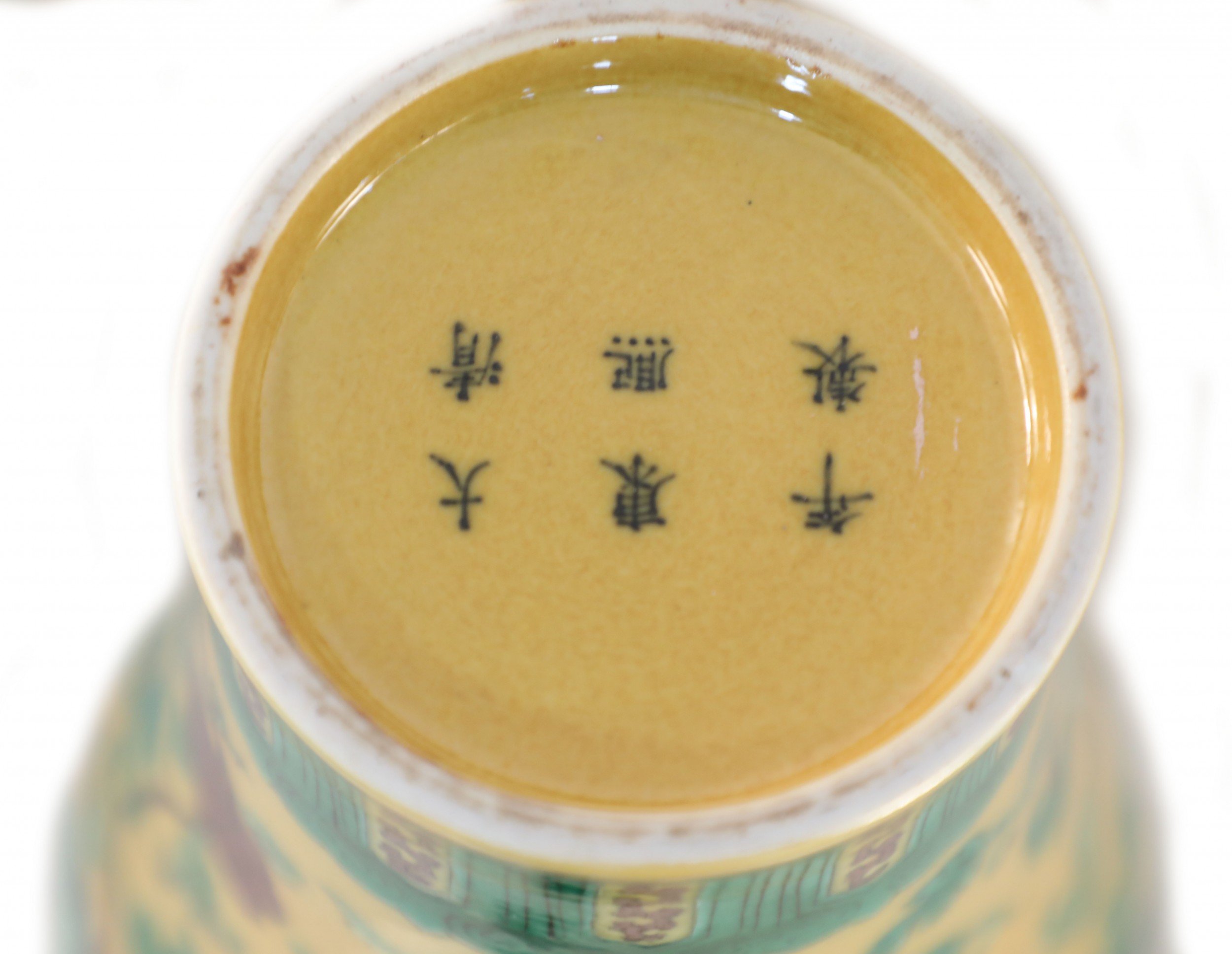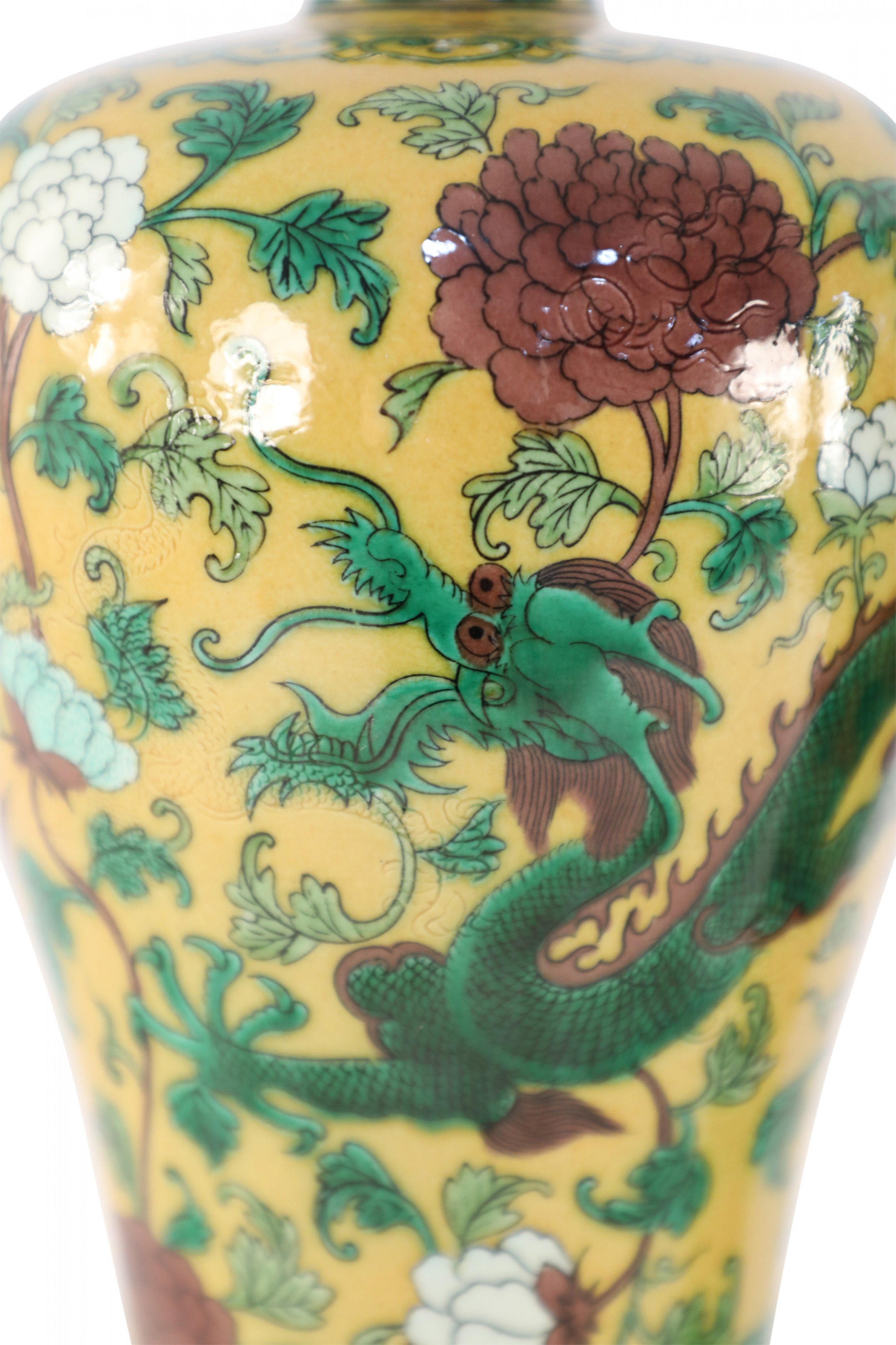 PAIR of Chinese Qing Dynasty Kangxi Period-style (Mid-20th Century) yellow ceramic vases with Meiping forms wrapped in green floral and dragon motifs, and decorative bands leading up to the openings and bases (mark on bottom)(PRICED AS PAIR)