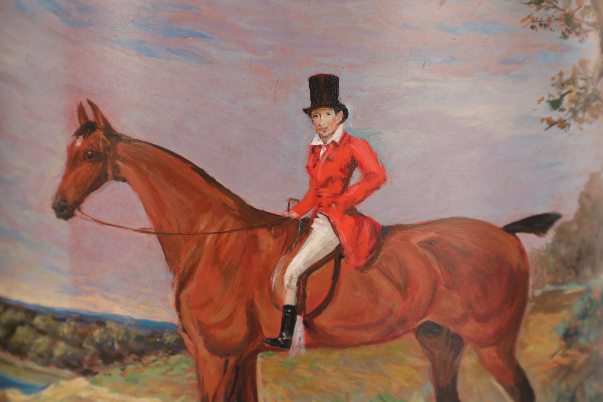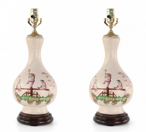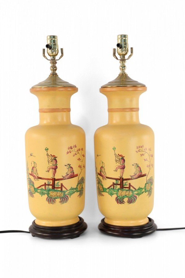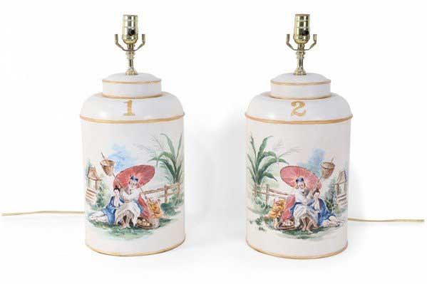 Pair of Chinese Red Tole Equestrian Scene Table Lamps