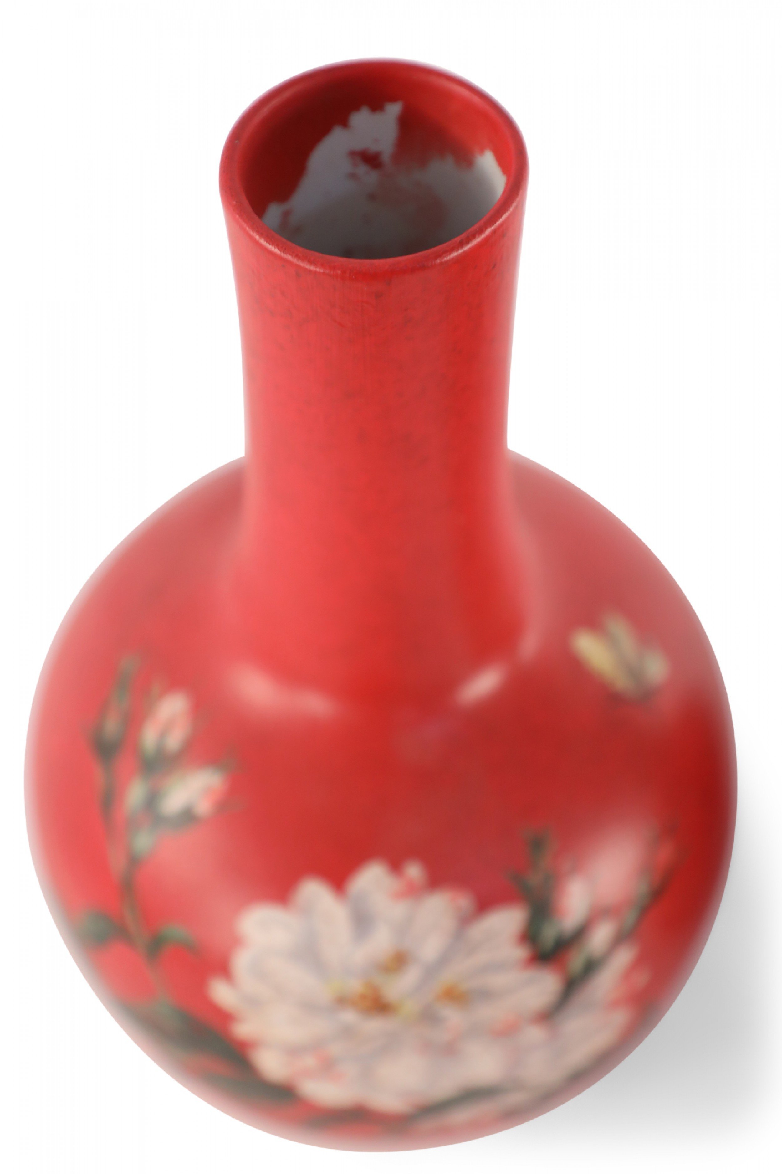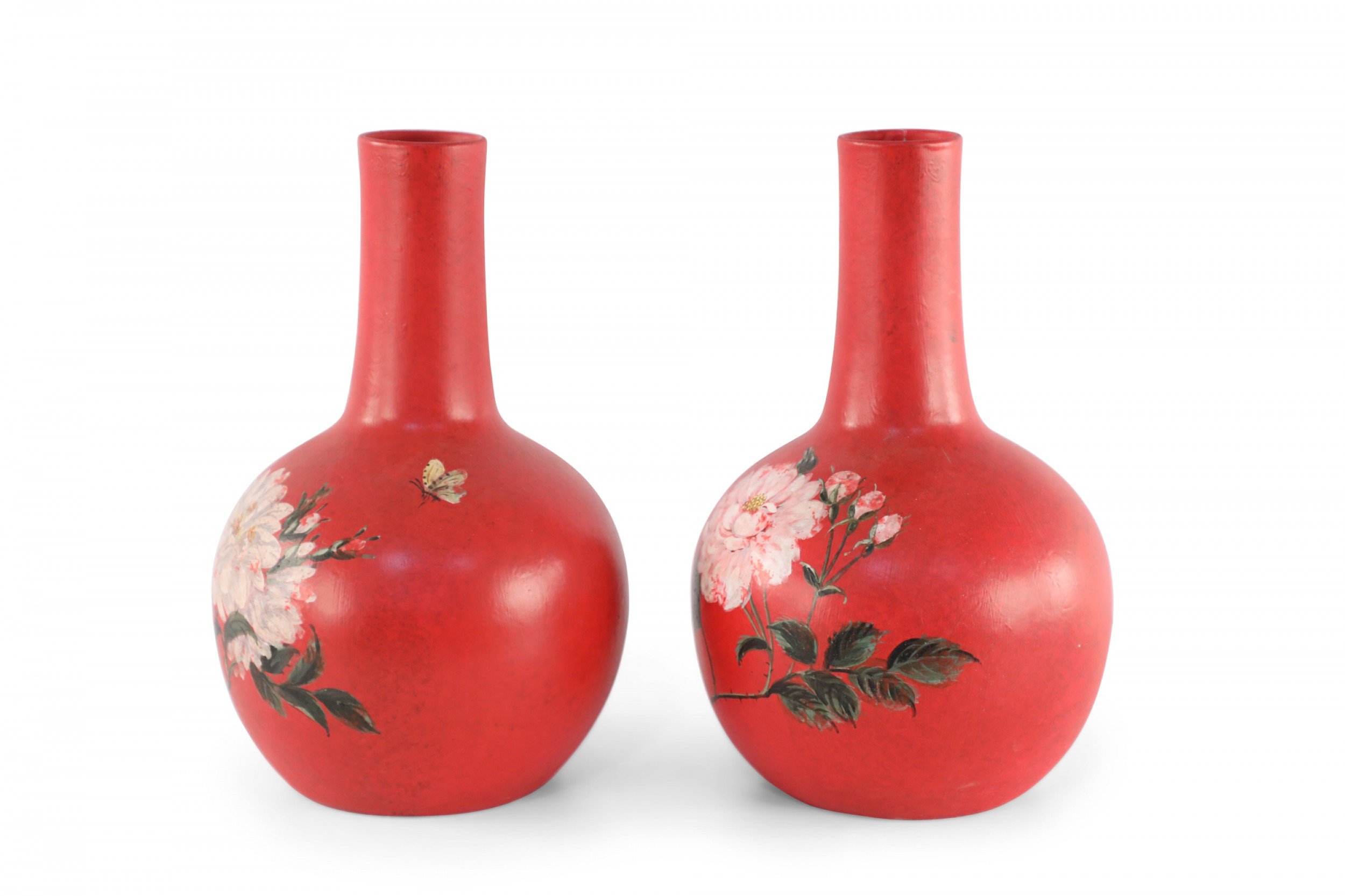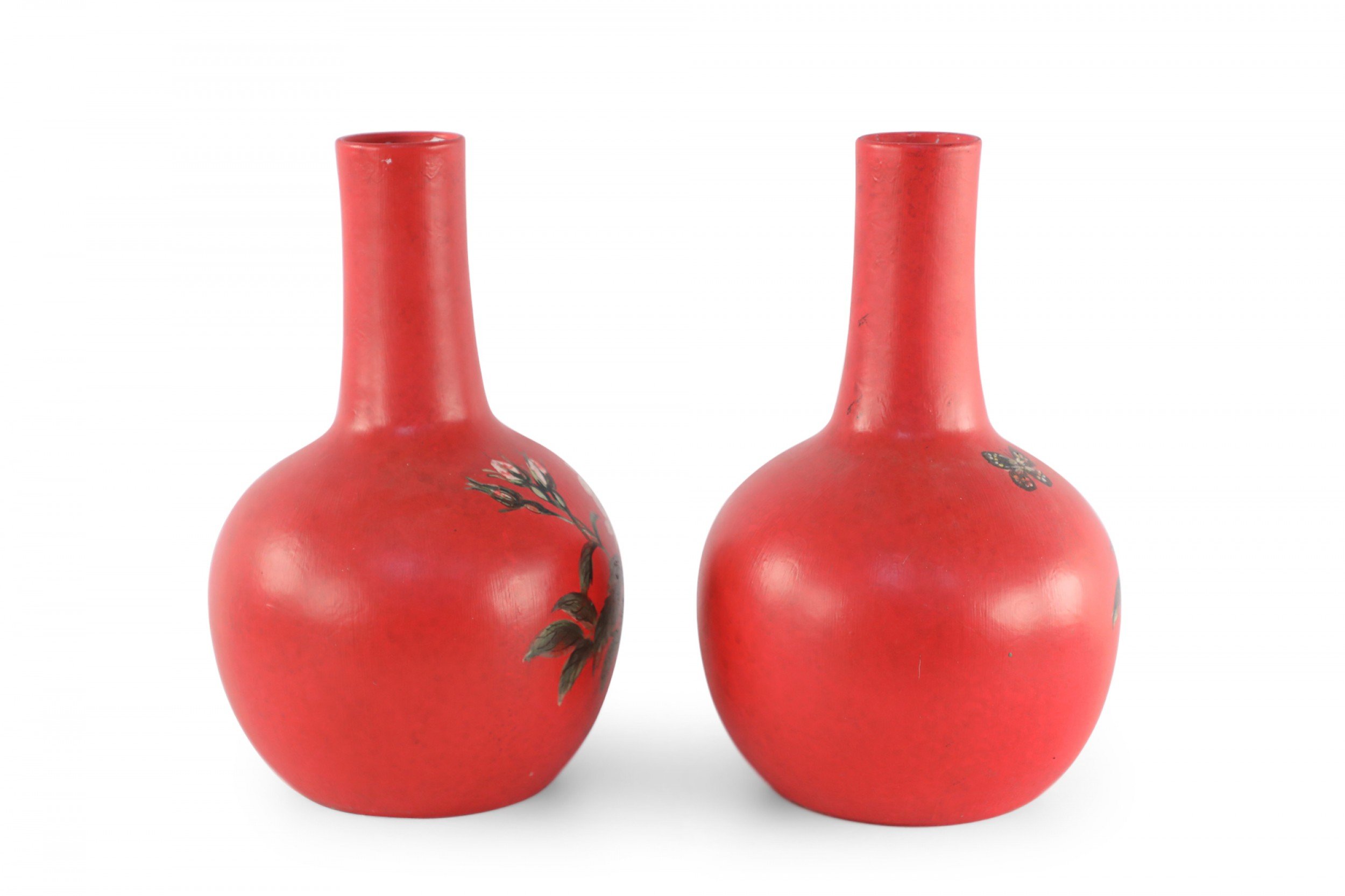 PAIR of Chinese red, globular porcelain vases hand-painted with butterflies over blooming white, pink-speckled florals. (PRICED AS PAIR)