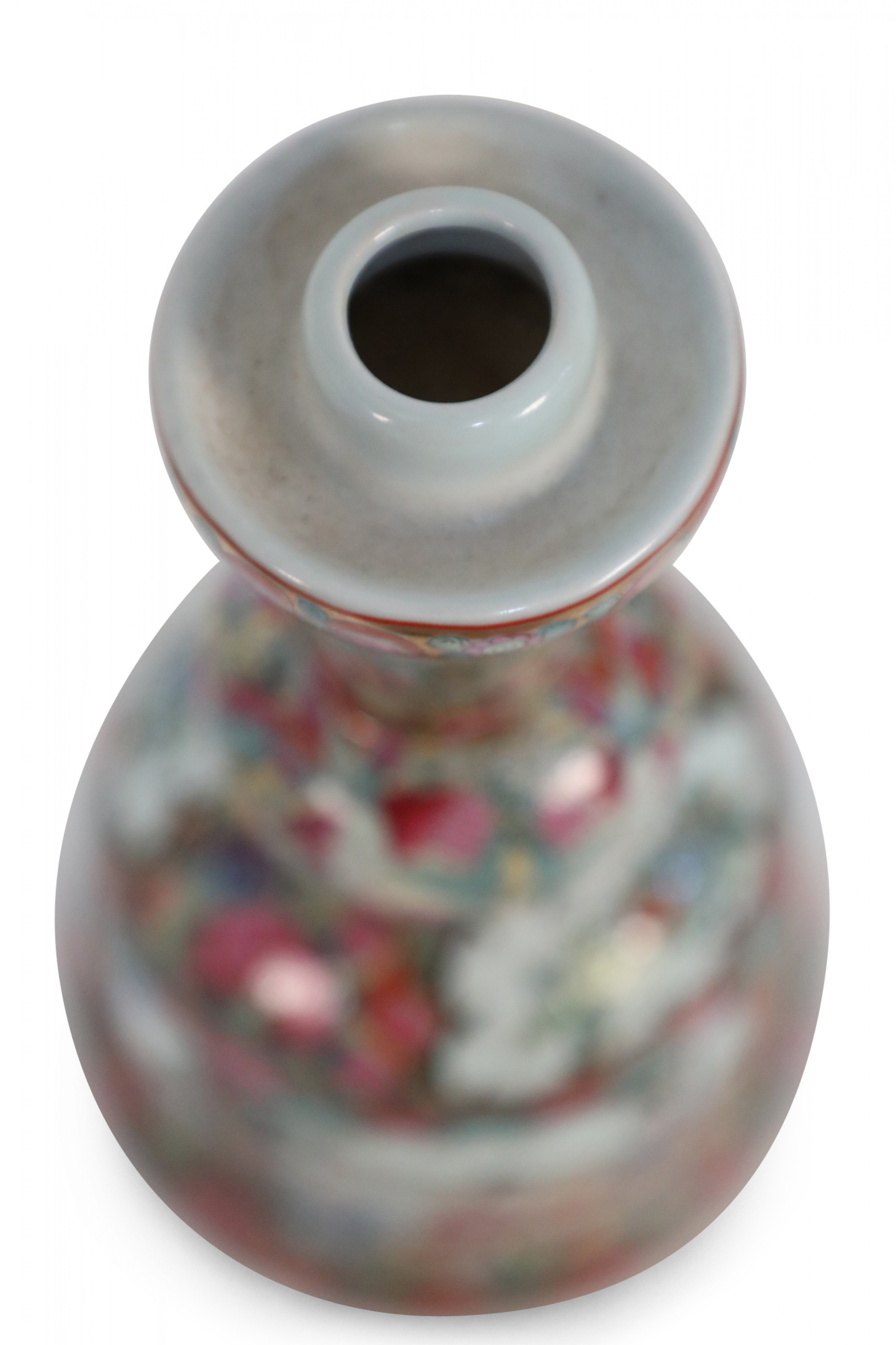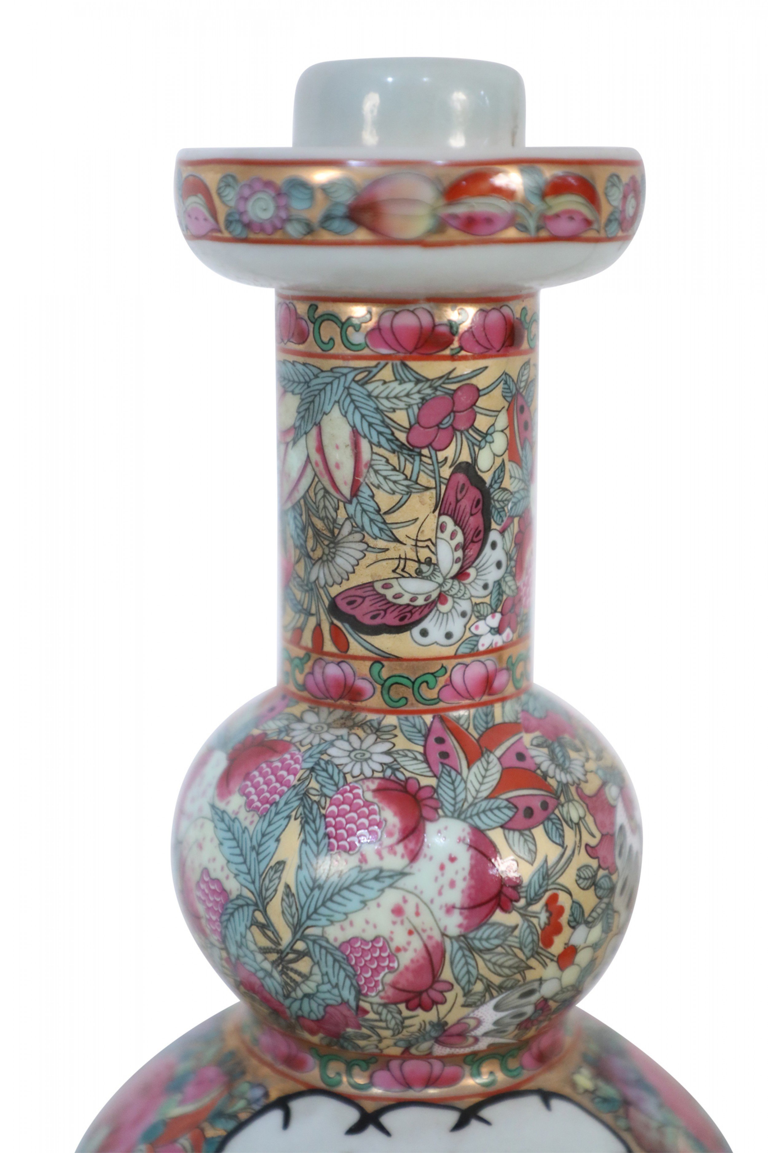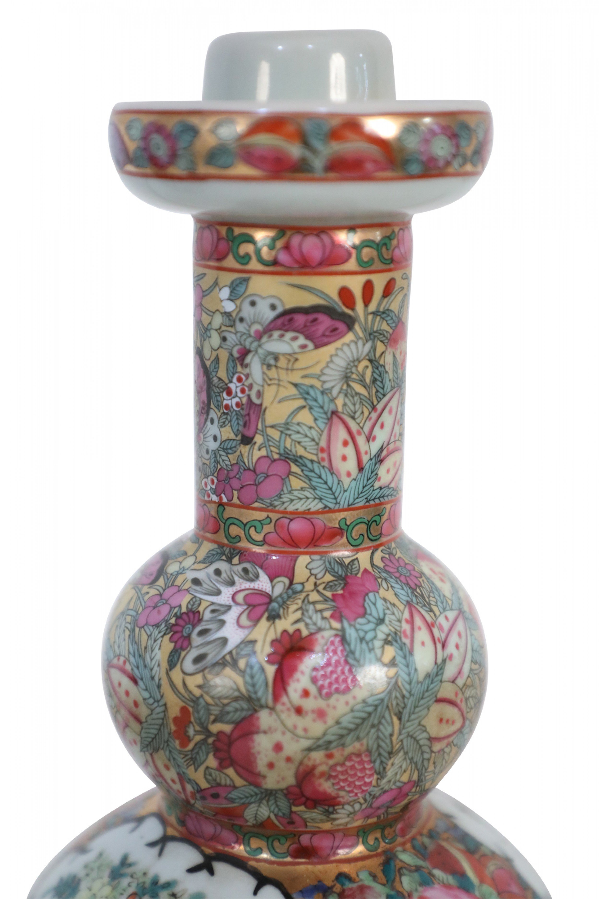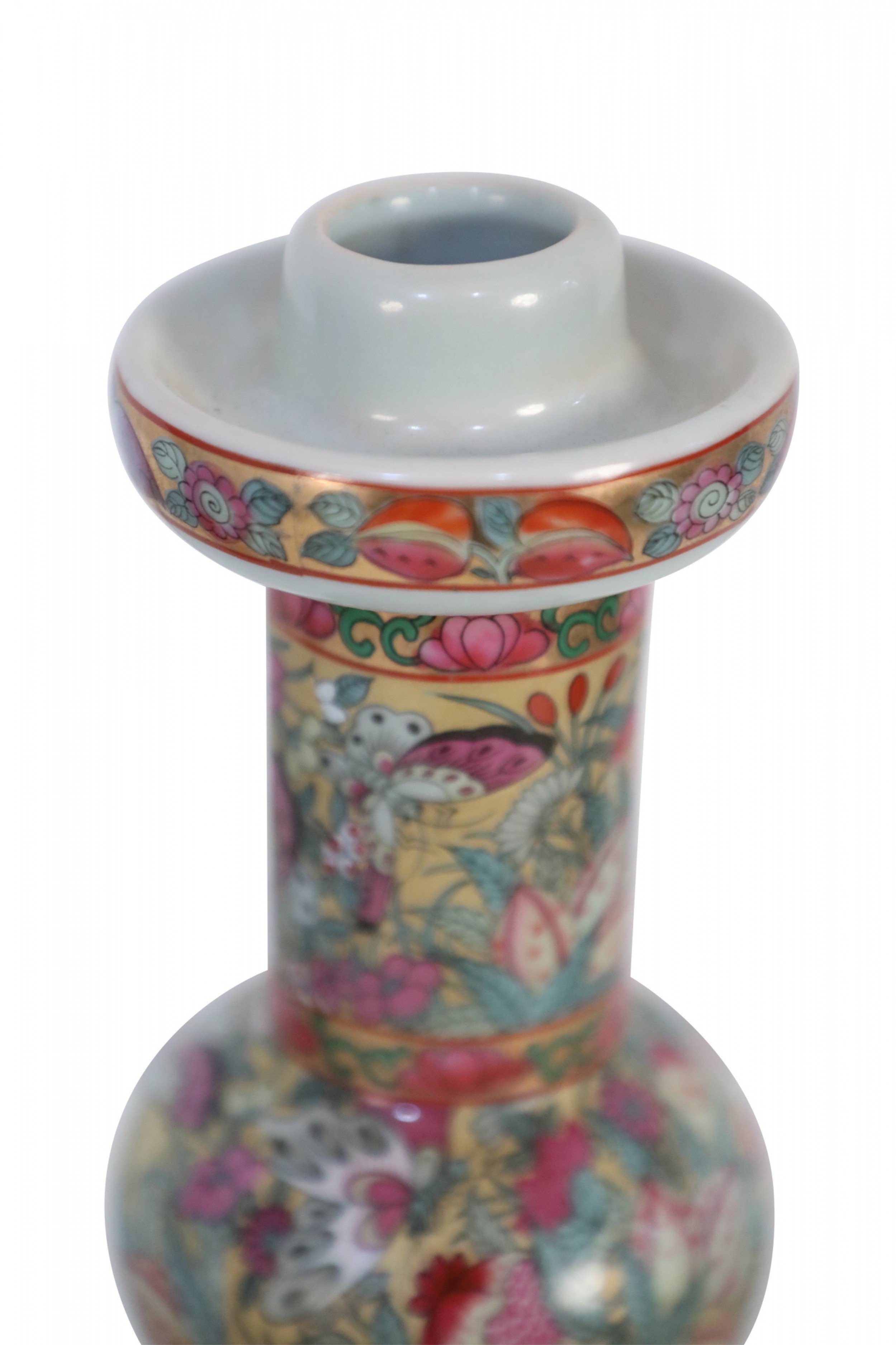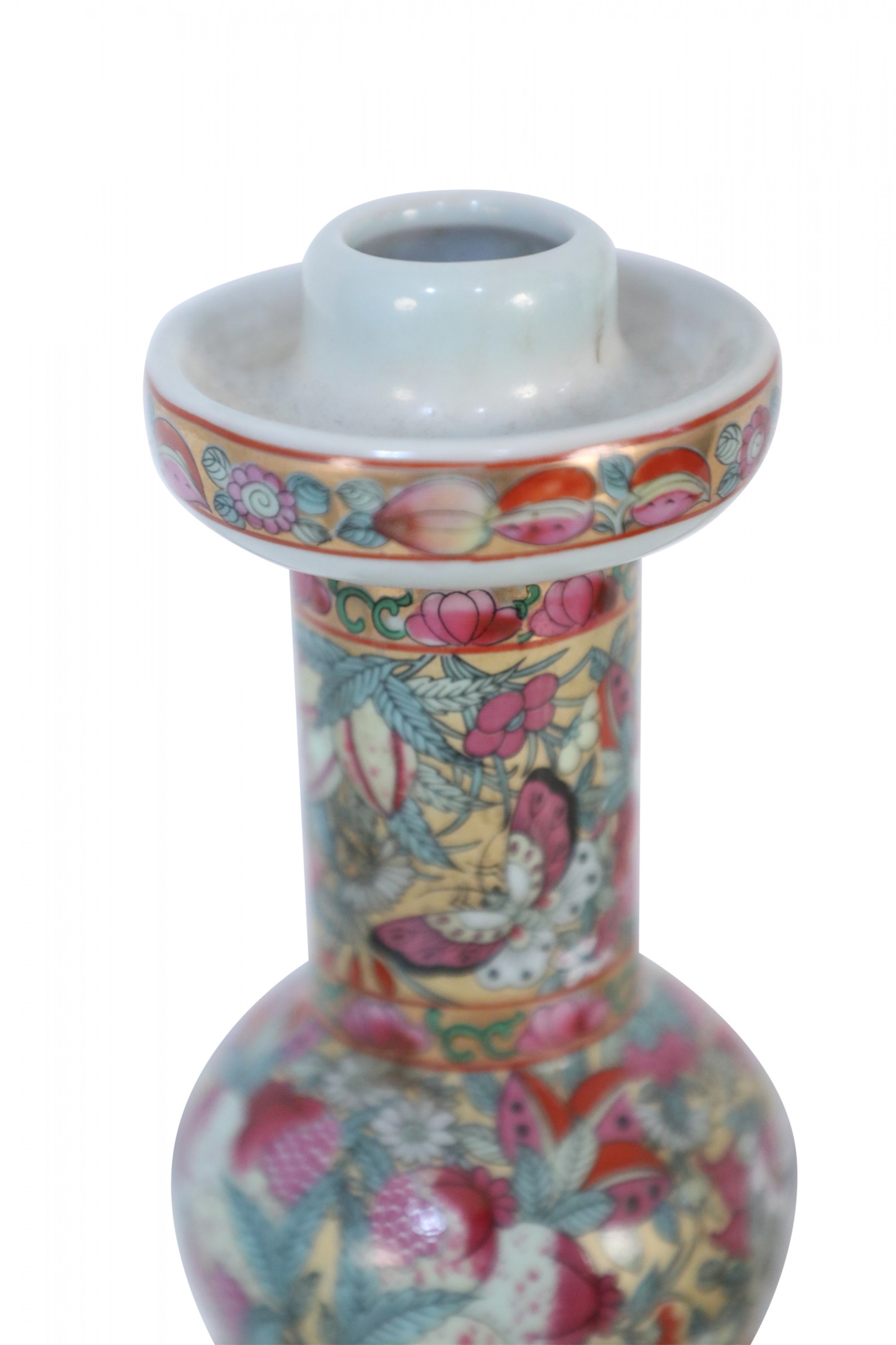PAIR of Chinese (20th Century) porcelain candlesticks featuring an upper design of flowers, butterflies, and leaves, and a bottom design of rose medallions and a genre scene of people participating in domestic activities (PRICED AS PAIR)