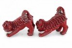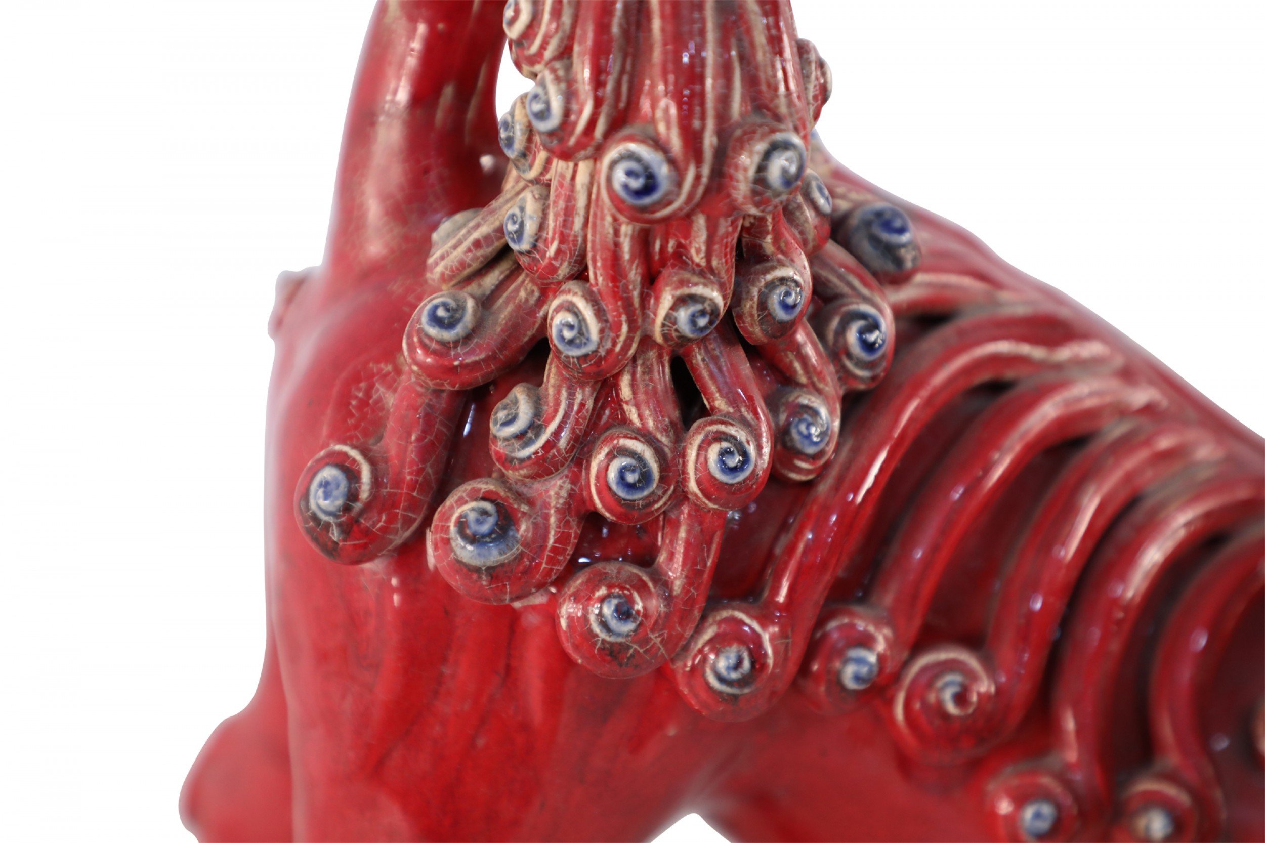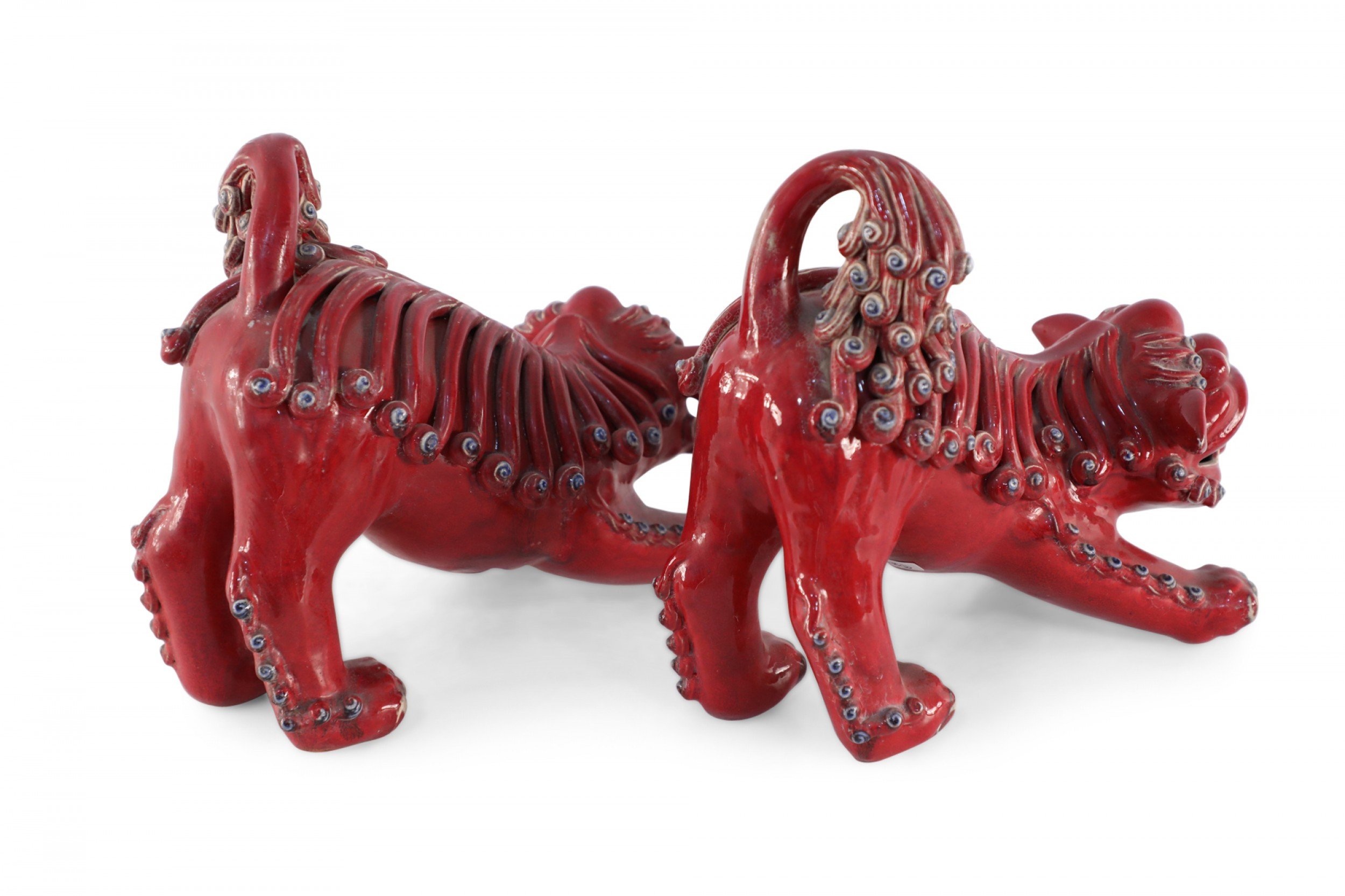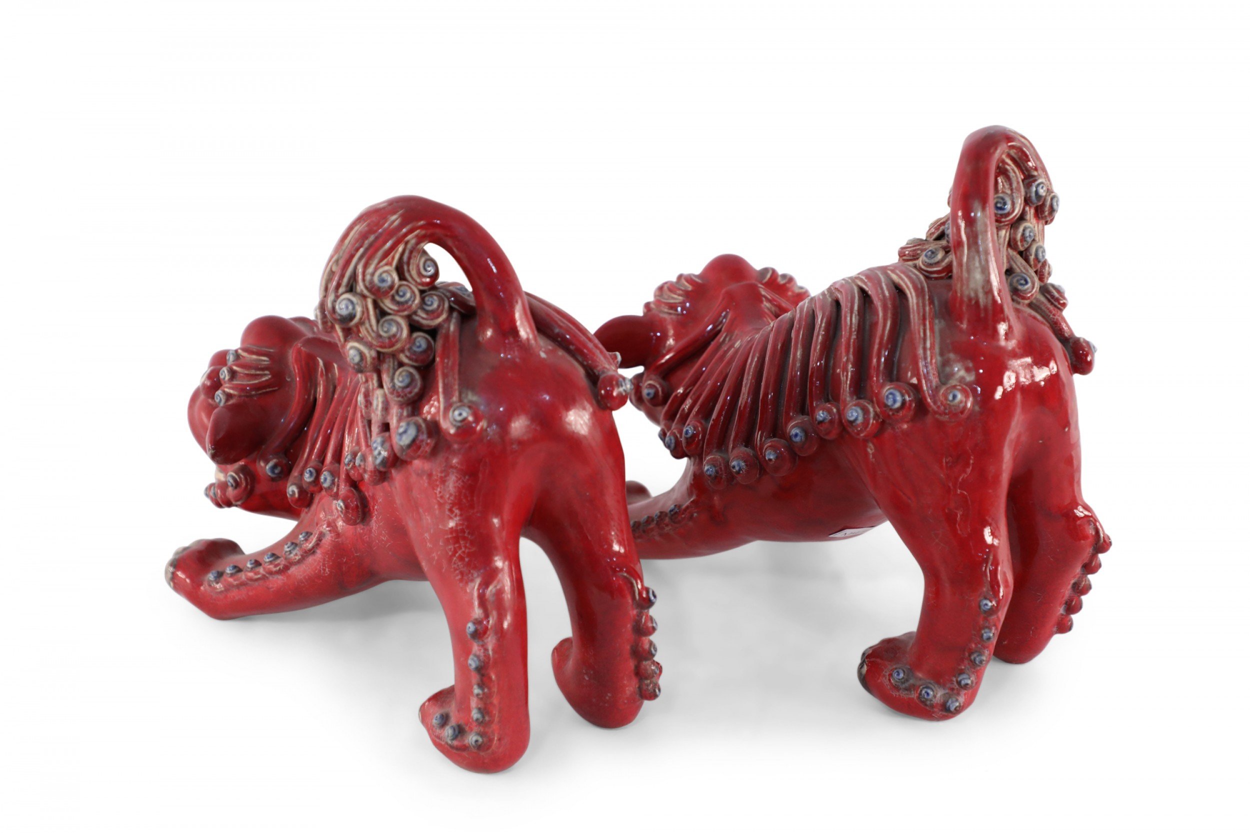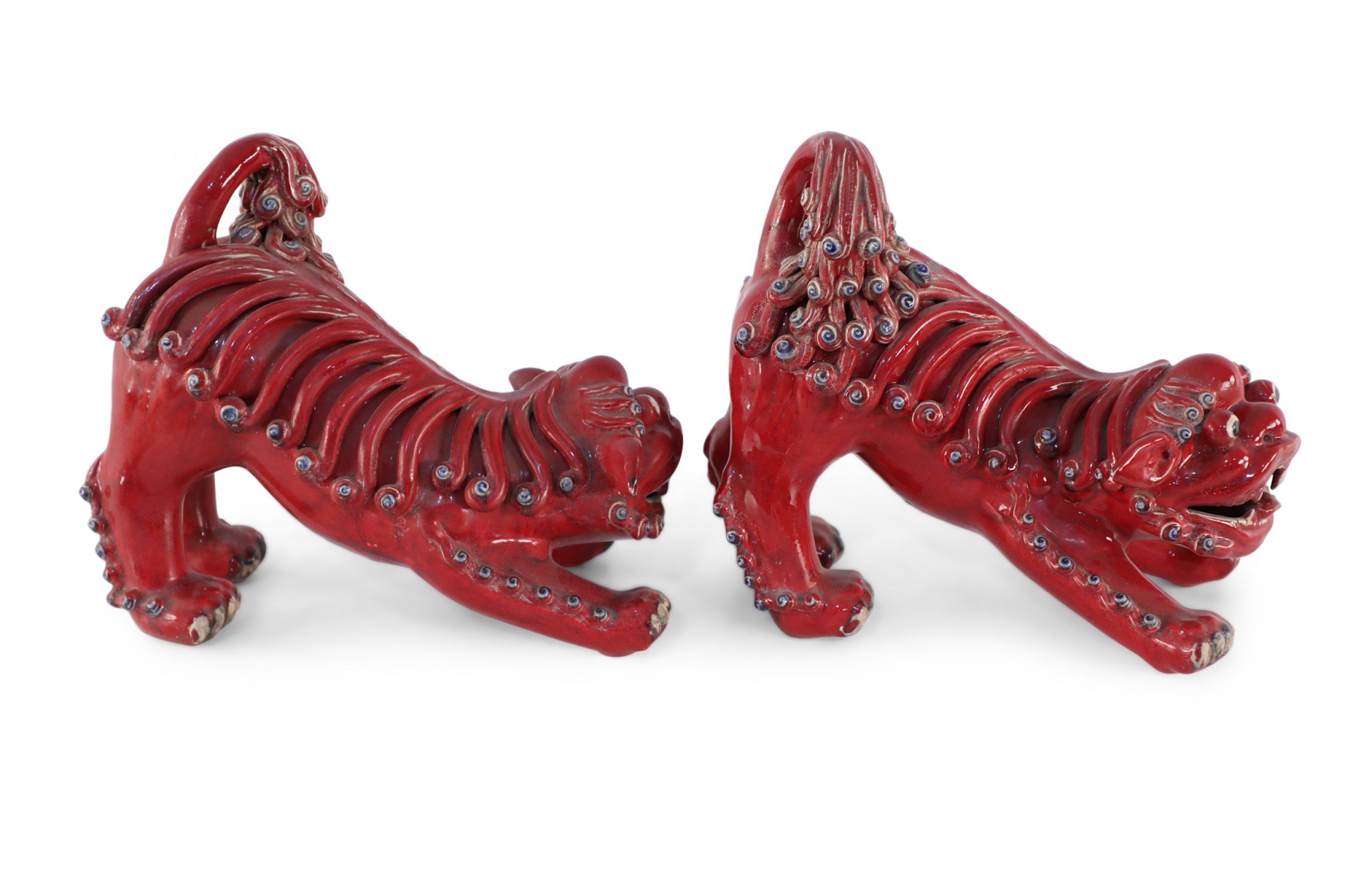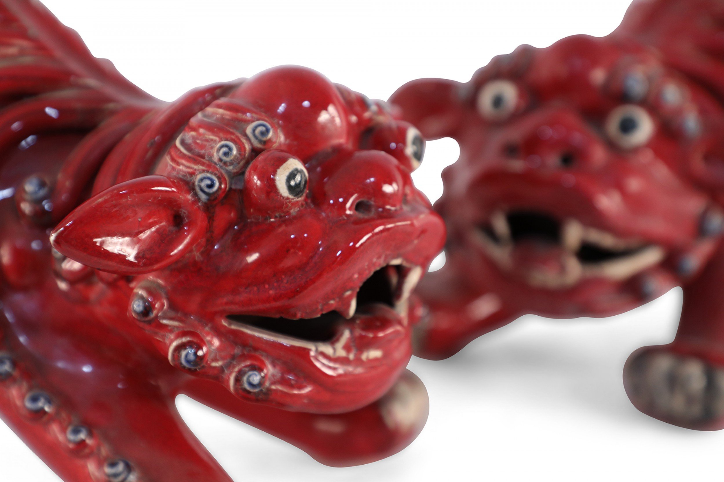 PAIR of Chinese red porcelain foo dogs with spirited expressions, detailing, and Shiwan Town in Guangdong forms- home to one of the most famous folk kilns during the Ming and Qing Dynasties, renowned for their vivid animal models (PRICED AS PAIR)