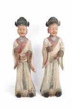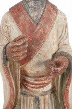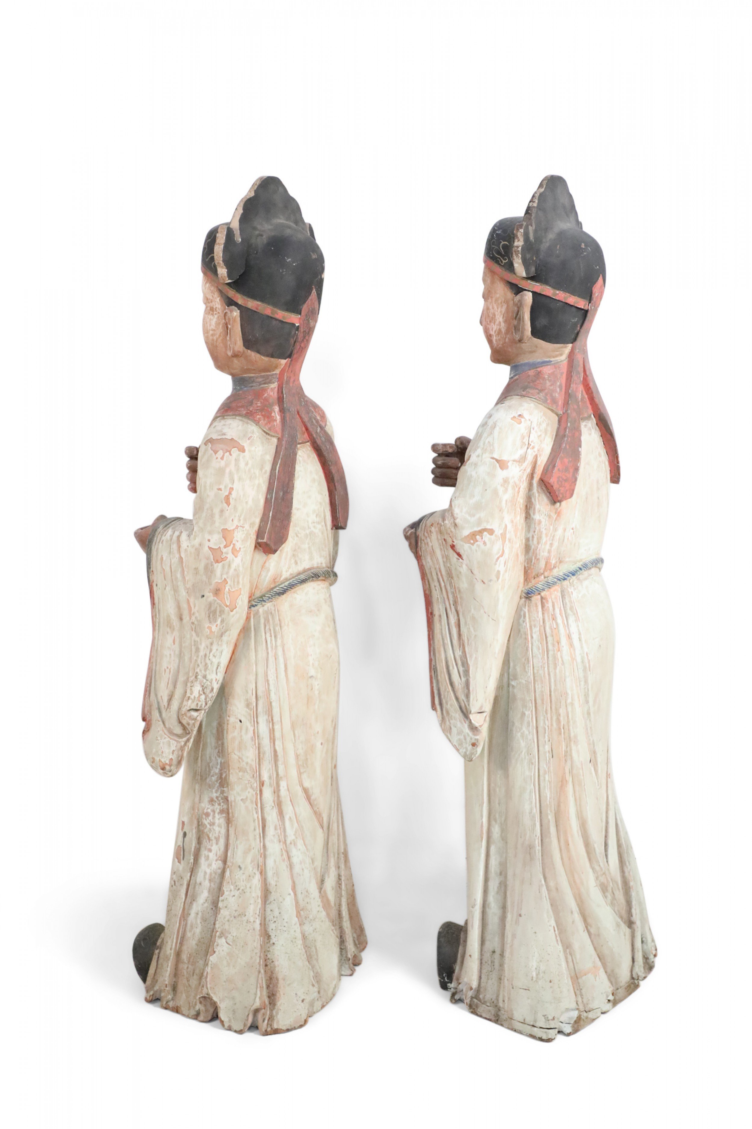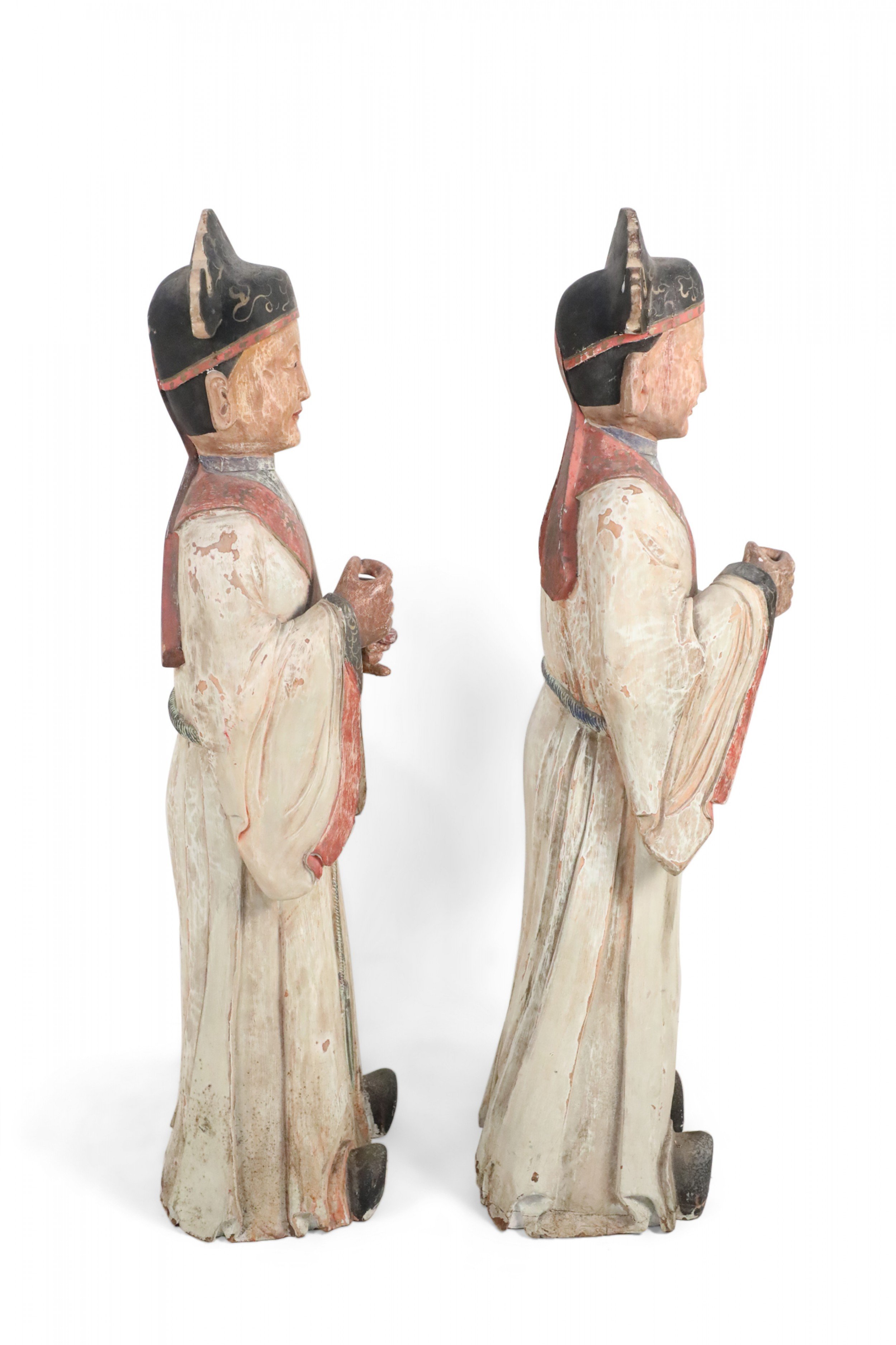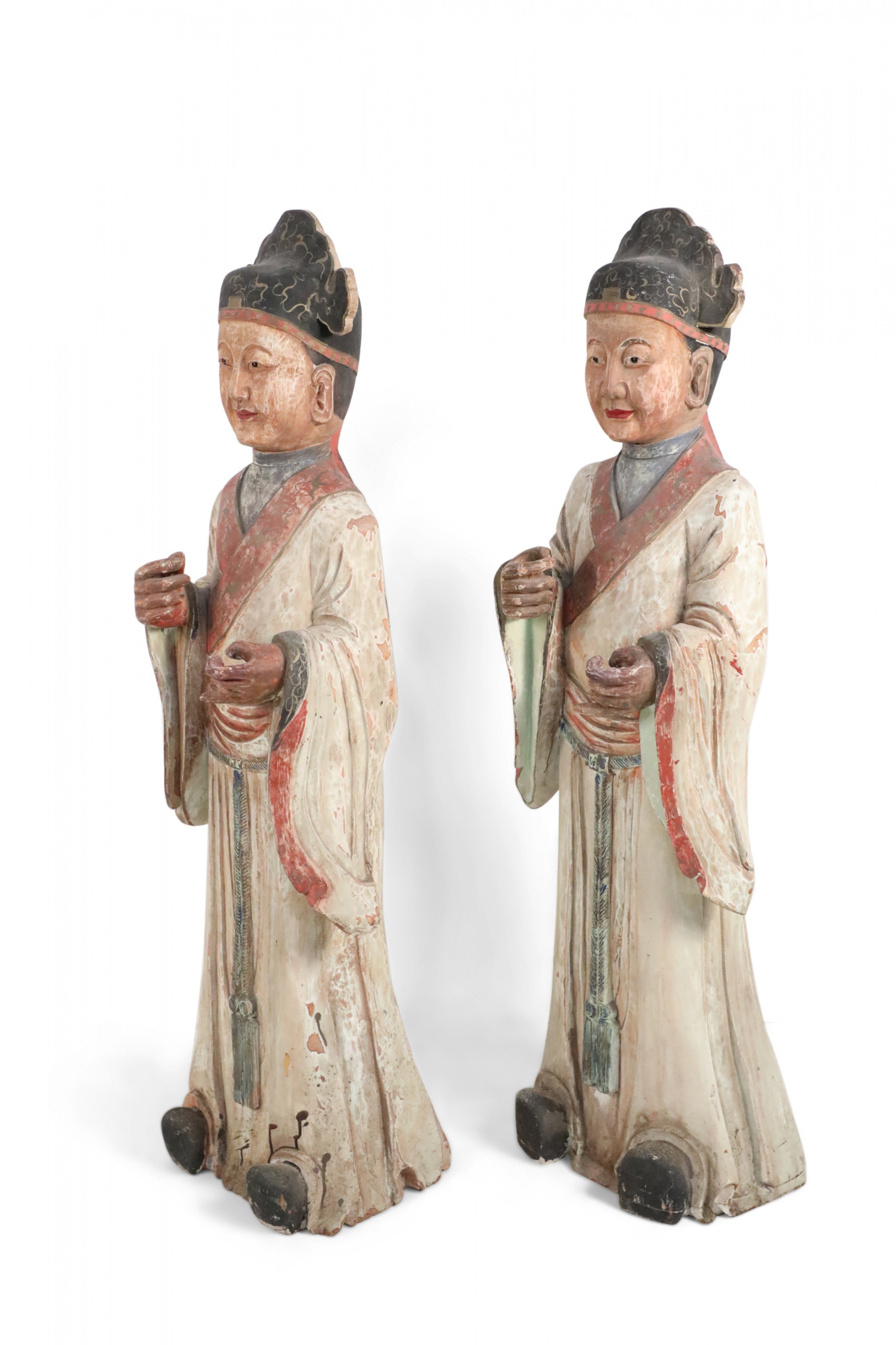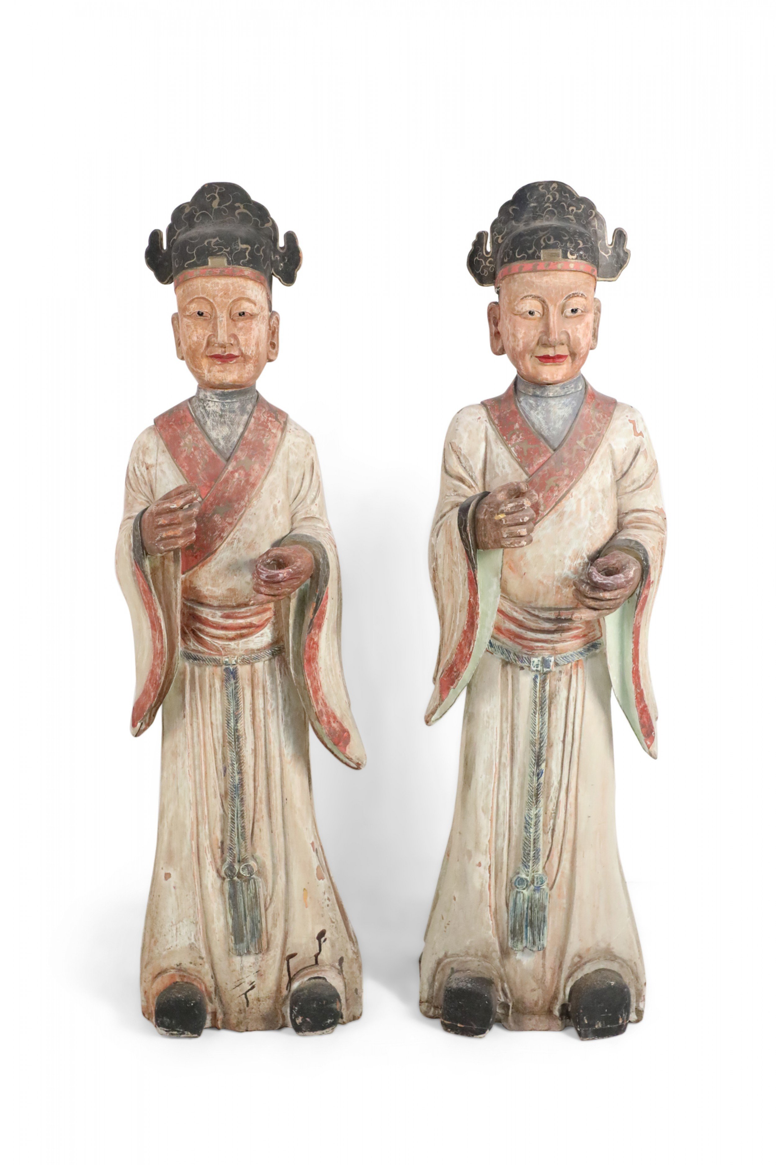 2 Chinese carved wooden statues of civil officers wearing white robes detailed with red trim and a tassel belt at the waist (similar statue: NWL2357) (PRICED EACH).