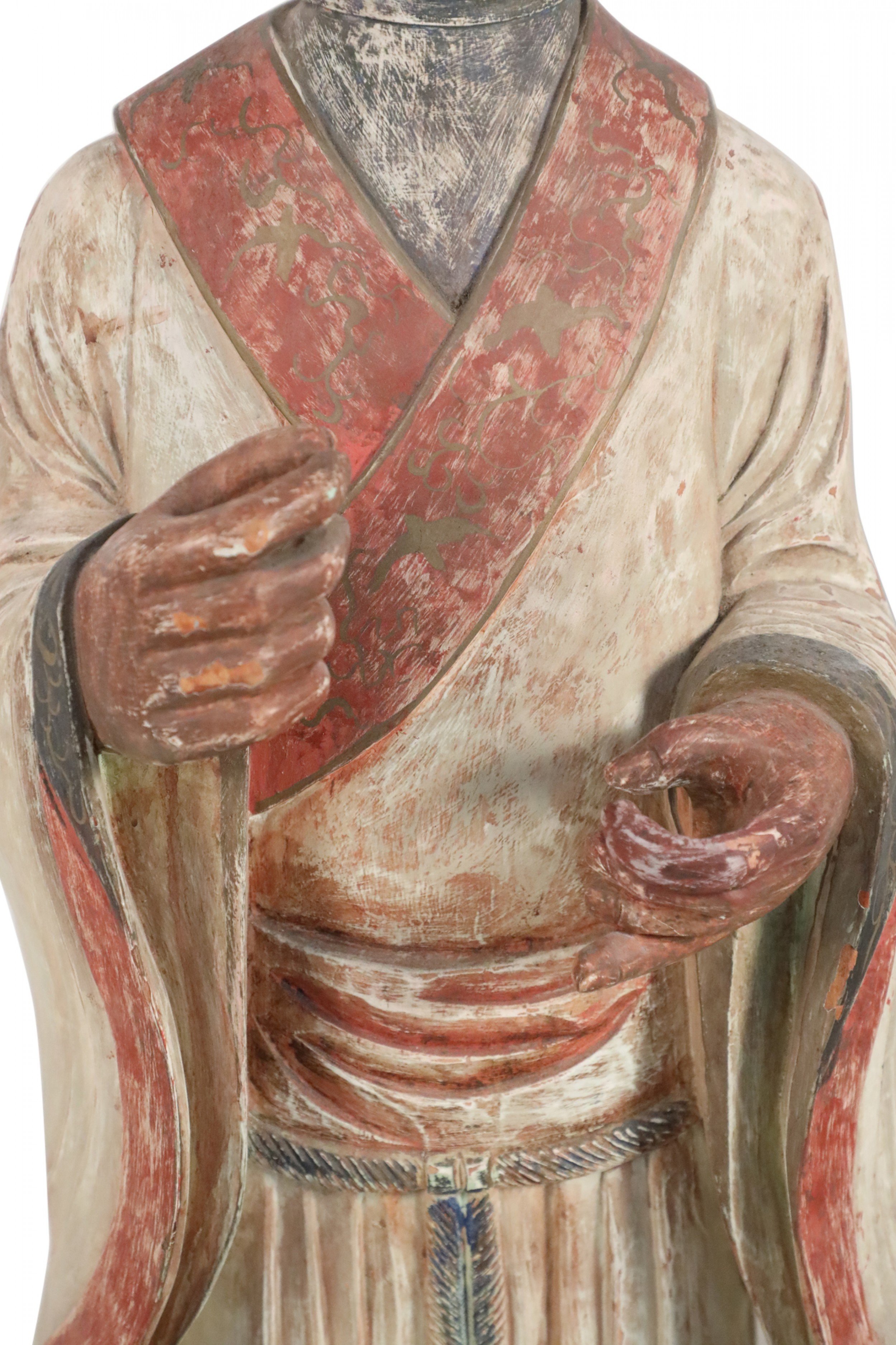2 Chinese carved wooden statues of civil officers wearing white robes detailed with red trim and a tassel belt at the waist (similar statue: NWL2357) (PRICED EACH)..
