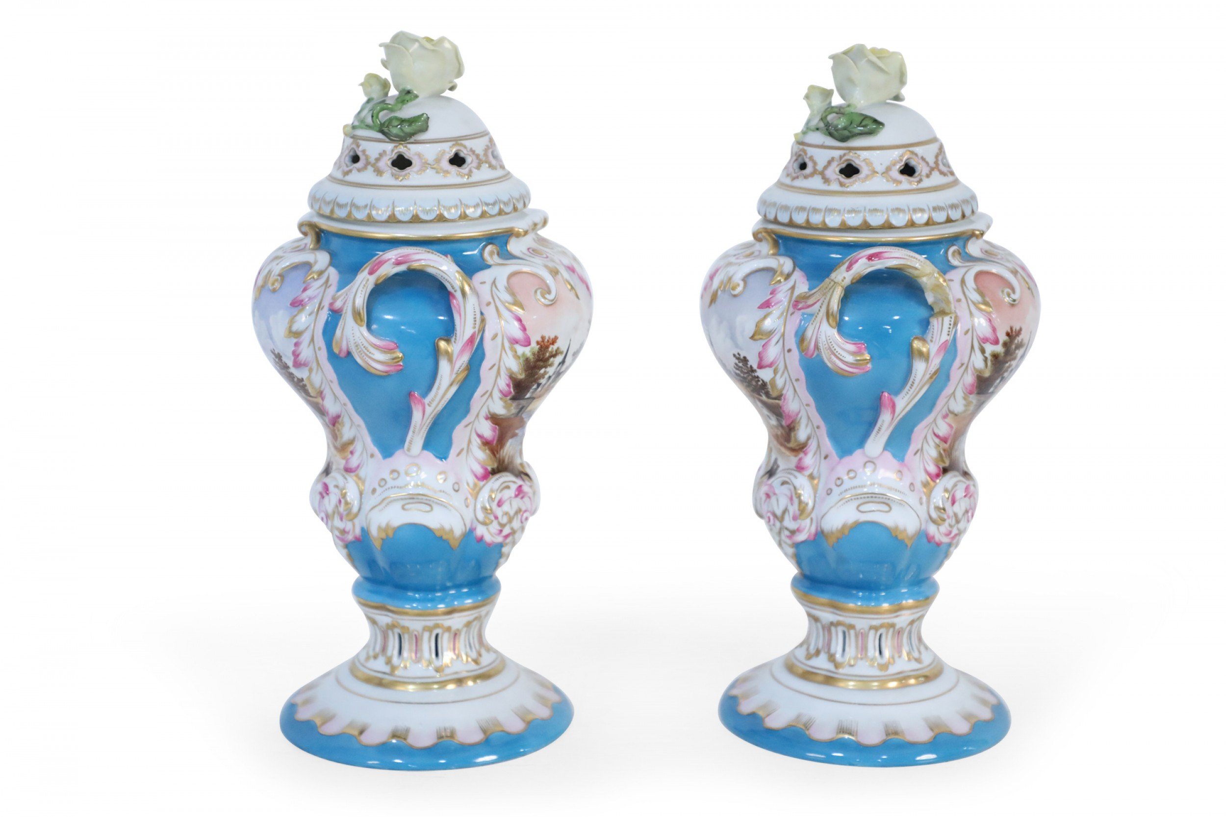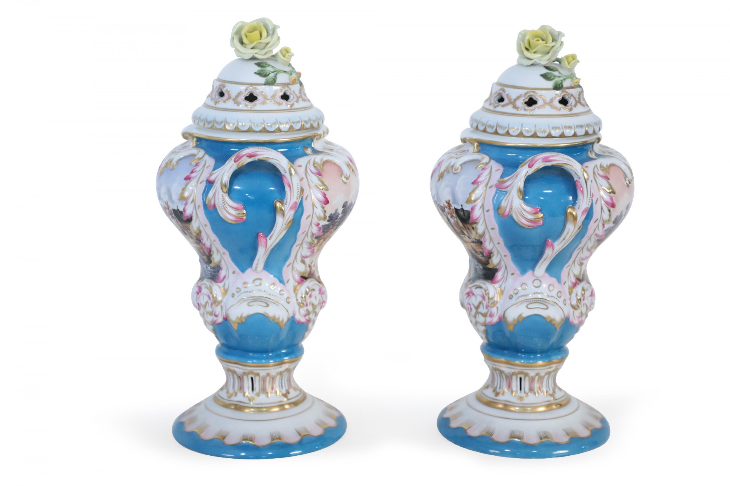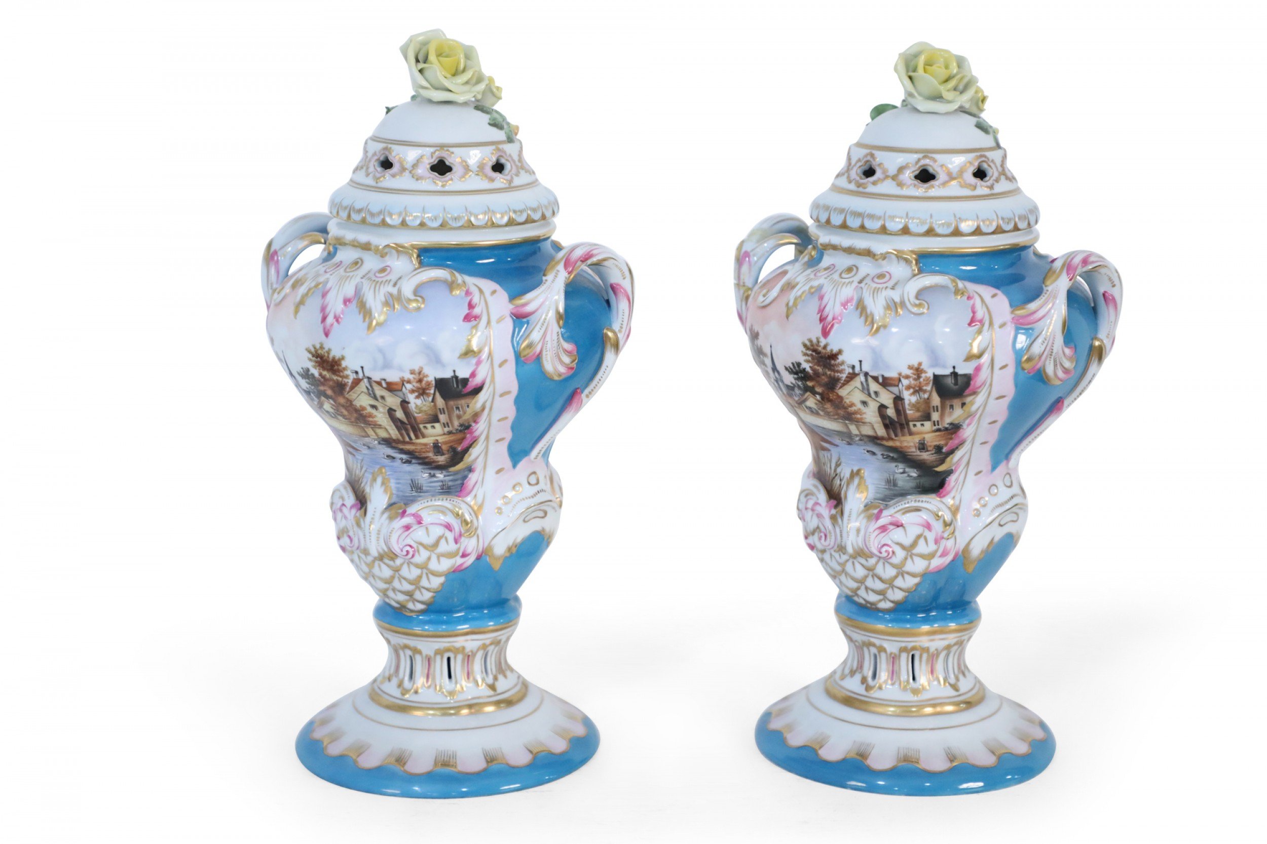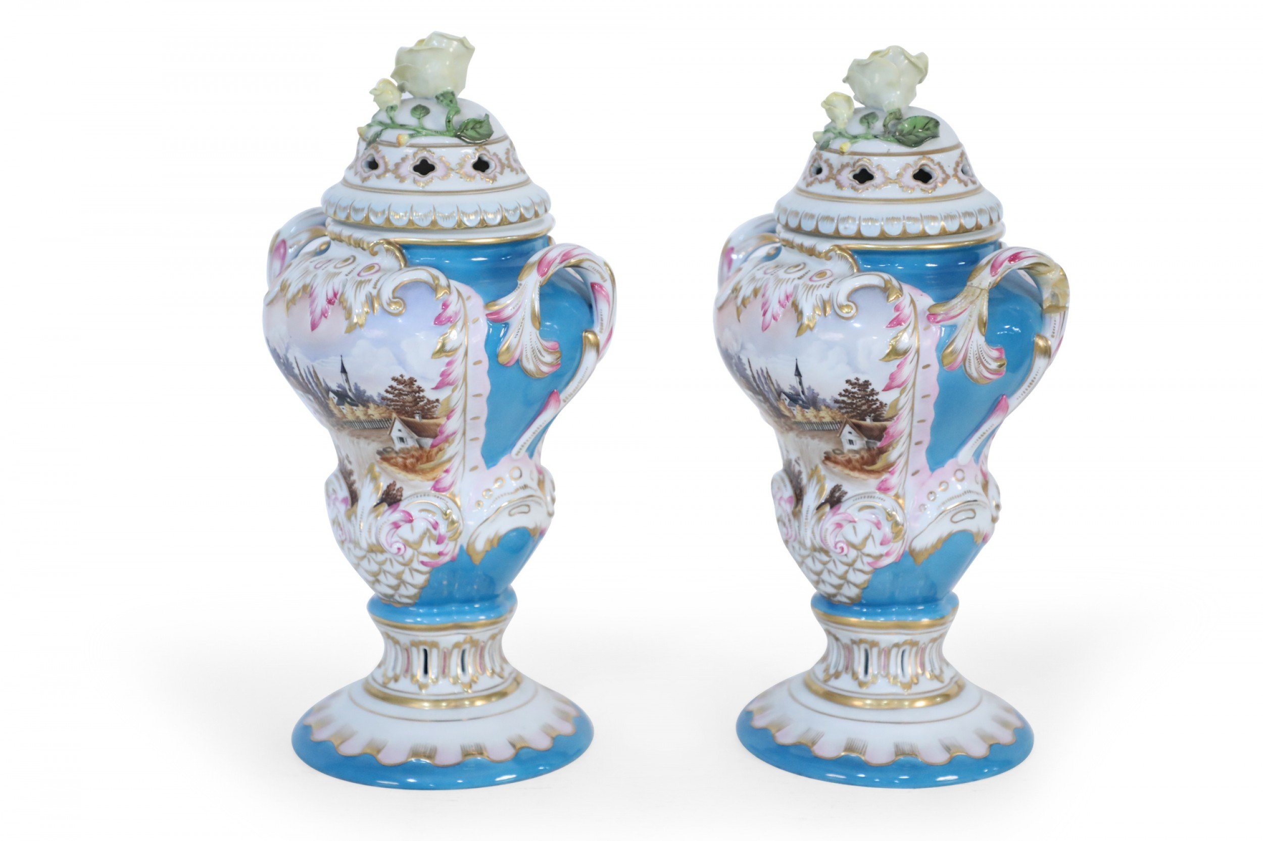 PAIR of Hungarian (20th Century porcelain urns with bright blue backgrounds and painted central pastoral scenes with gilt and pink details and lids with decorative cutouts topped with yellow porcelain roses (Marked, HEREND HUNGARY)(PRICED AS PAIR).
