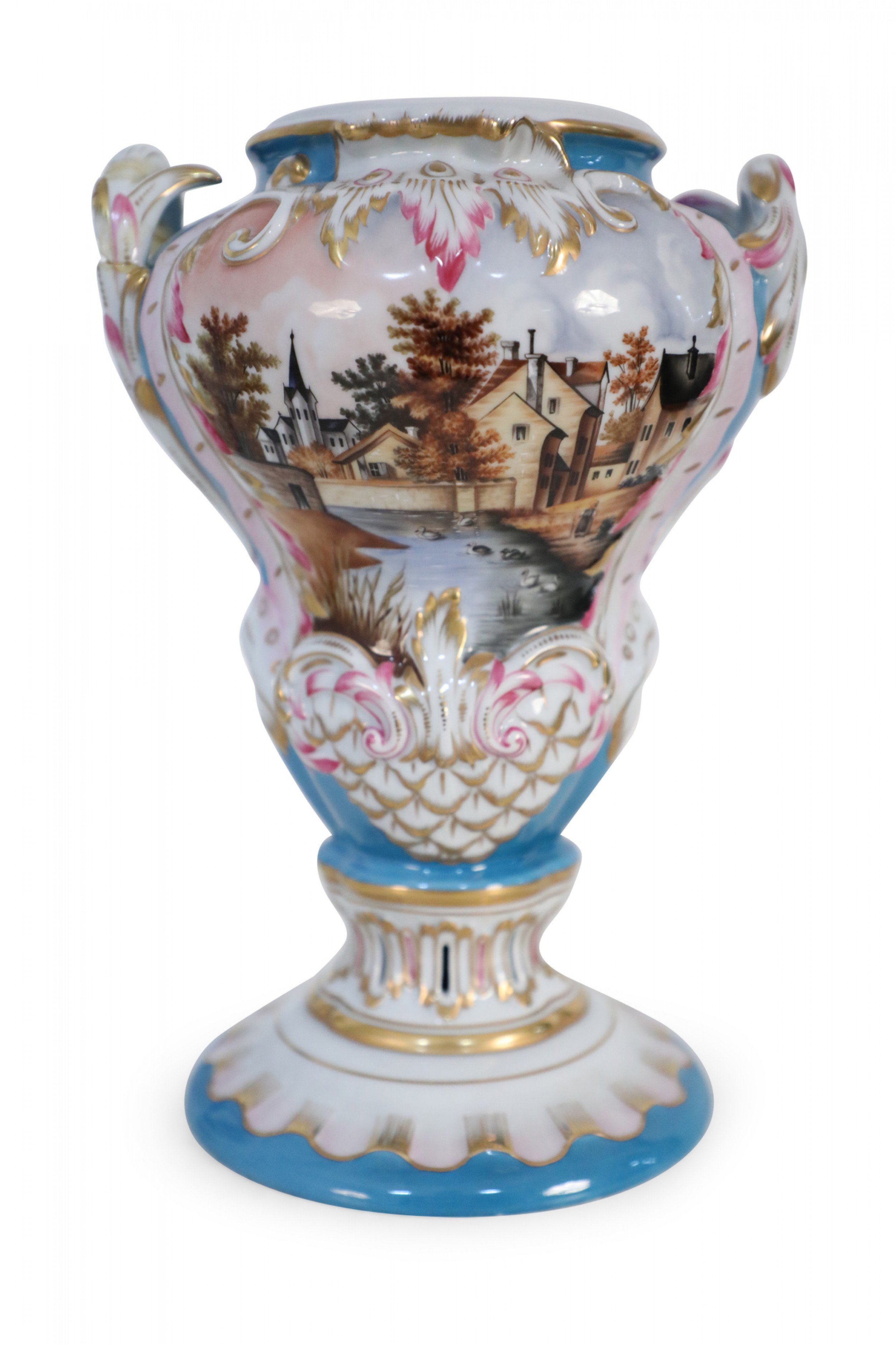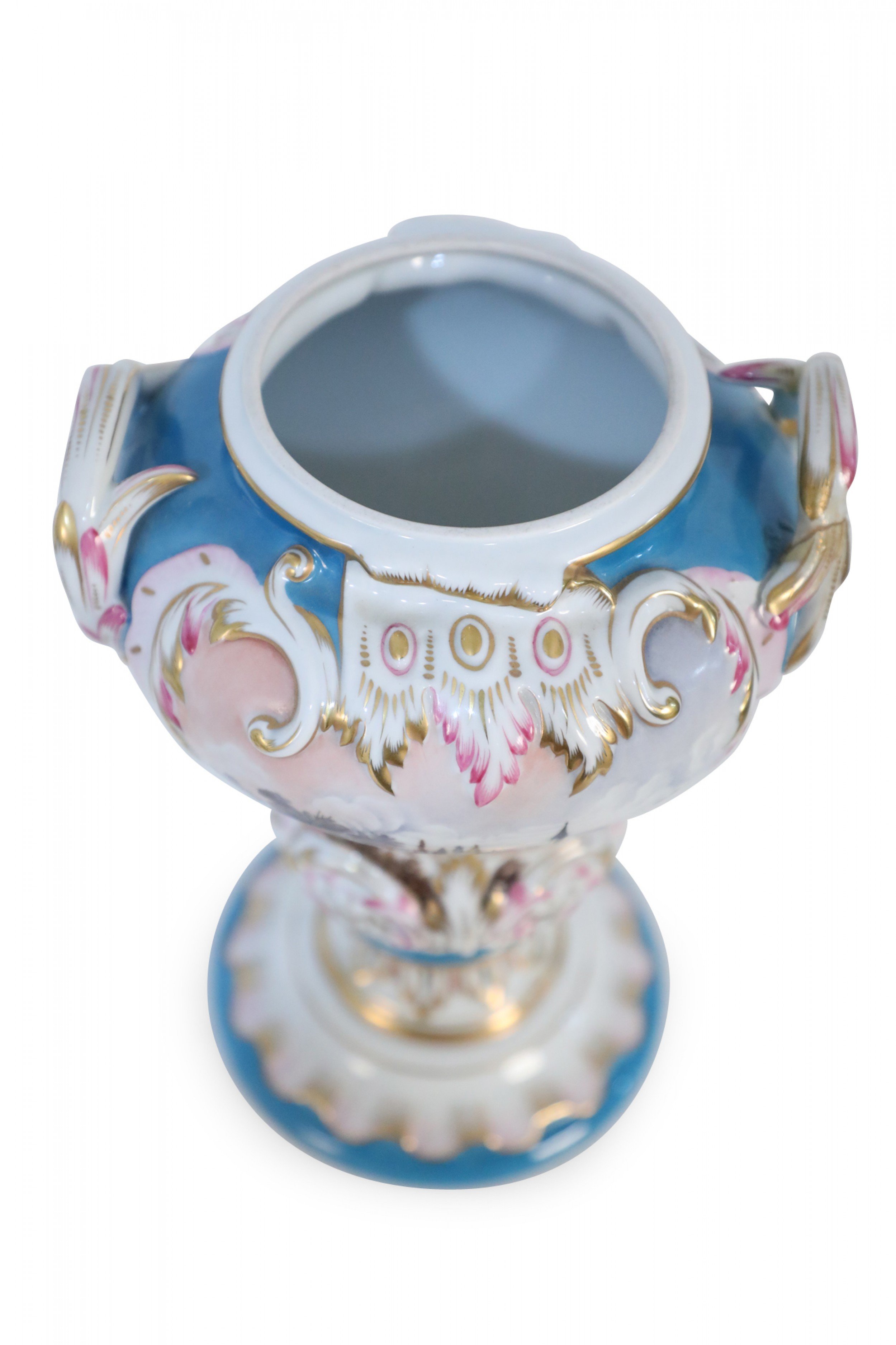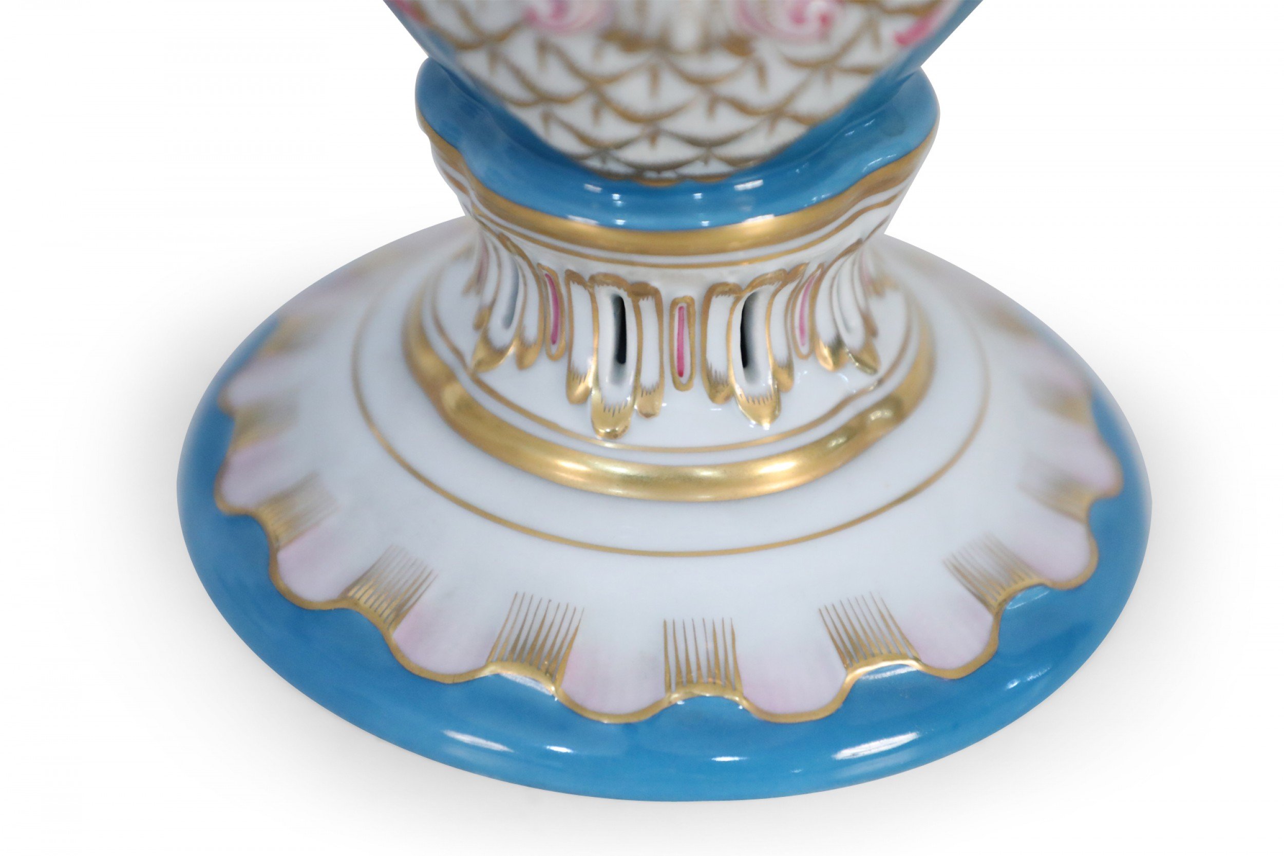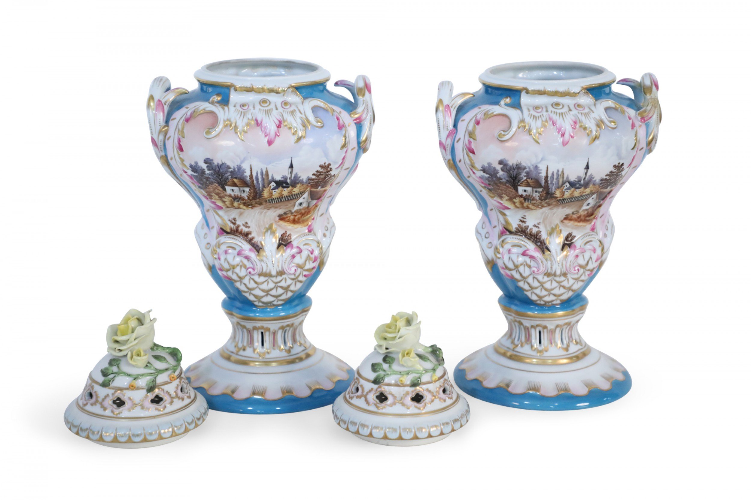PAIR of Hungarian (20th Century porcelain urns with bright blue backgrounds and painted central pastoral scenes with gilt and pink details and lids with decorative cutouts topped with yellow porcelain roses (Marked, HEREND HUNGARY)(PRICED AS PAIR).
