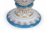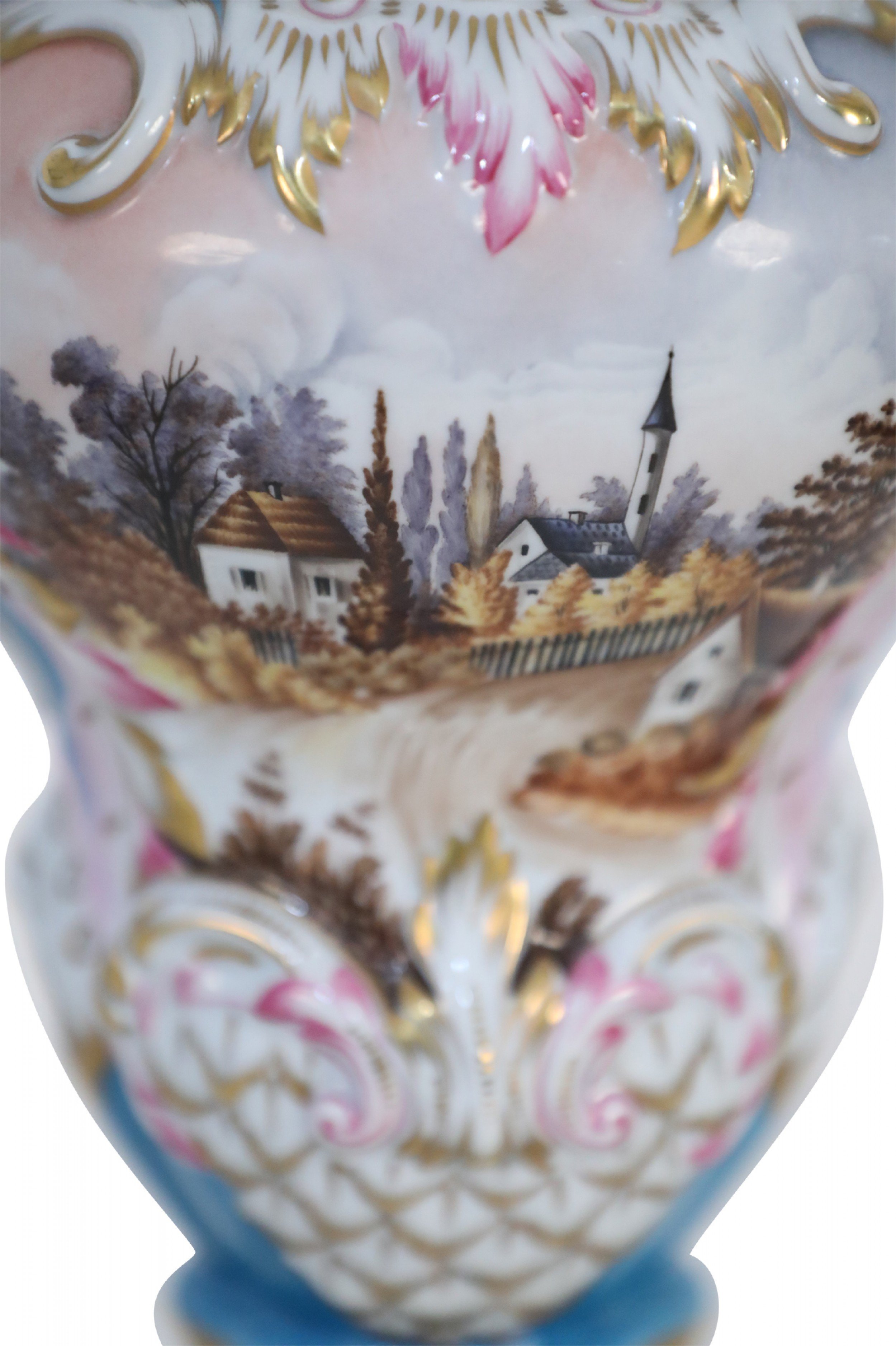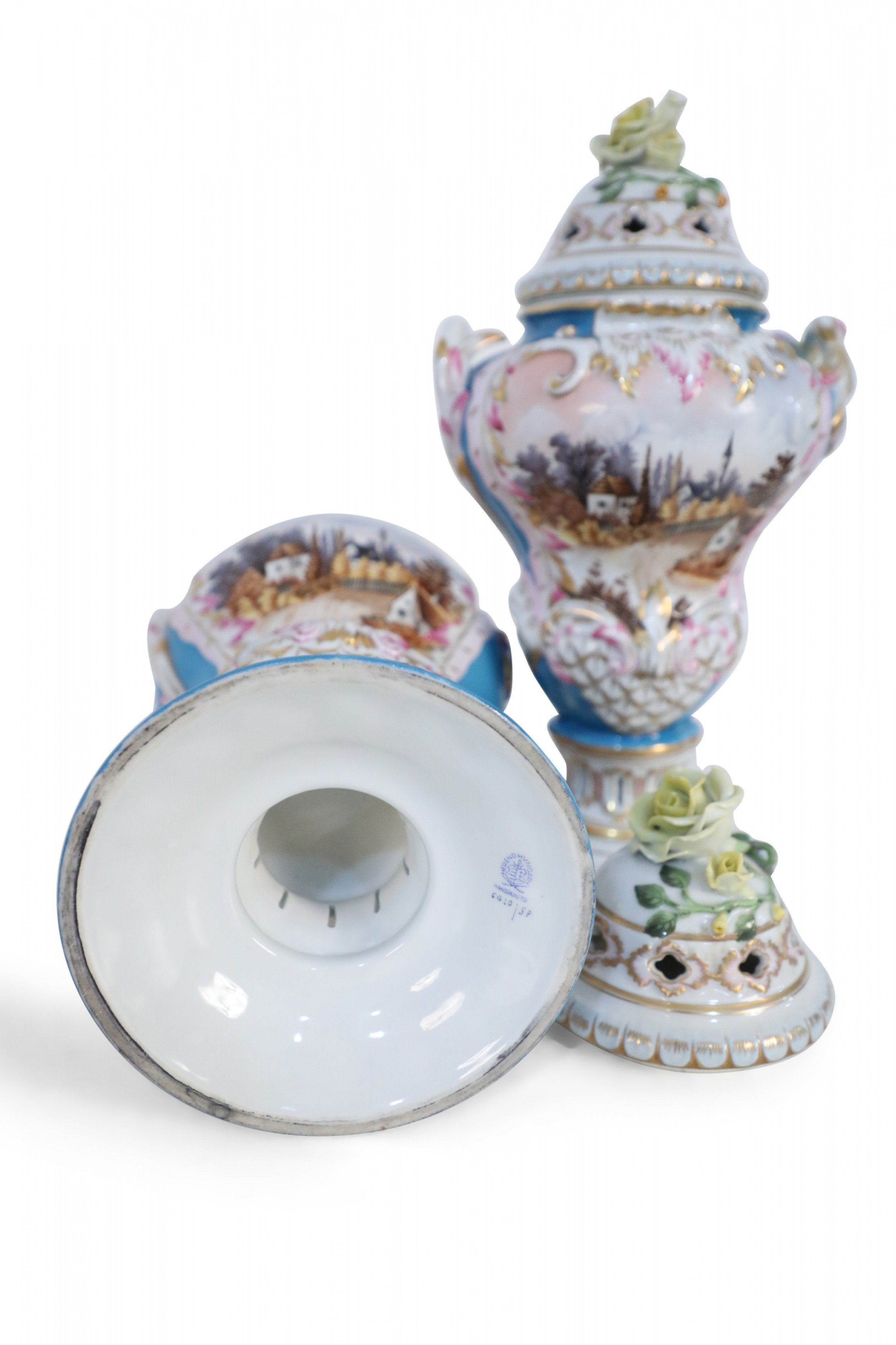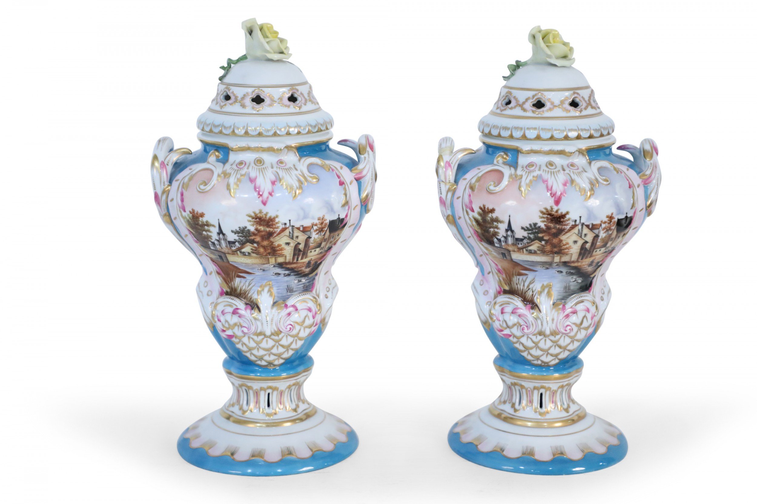 PAIR of Hungarian (20th Century porcelain urns with bright blue backgrounds and painted central pastoral scenes with gilt and pink details and lids with decorative cutouts topped with yellow porcelain roses (Marked, HEREND HUNGARY)(PRICED AS PAIR)