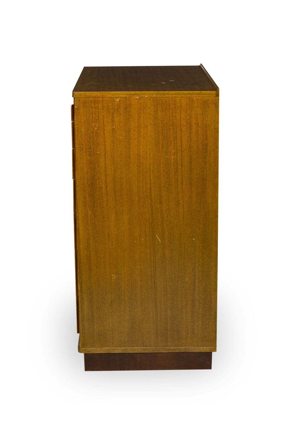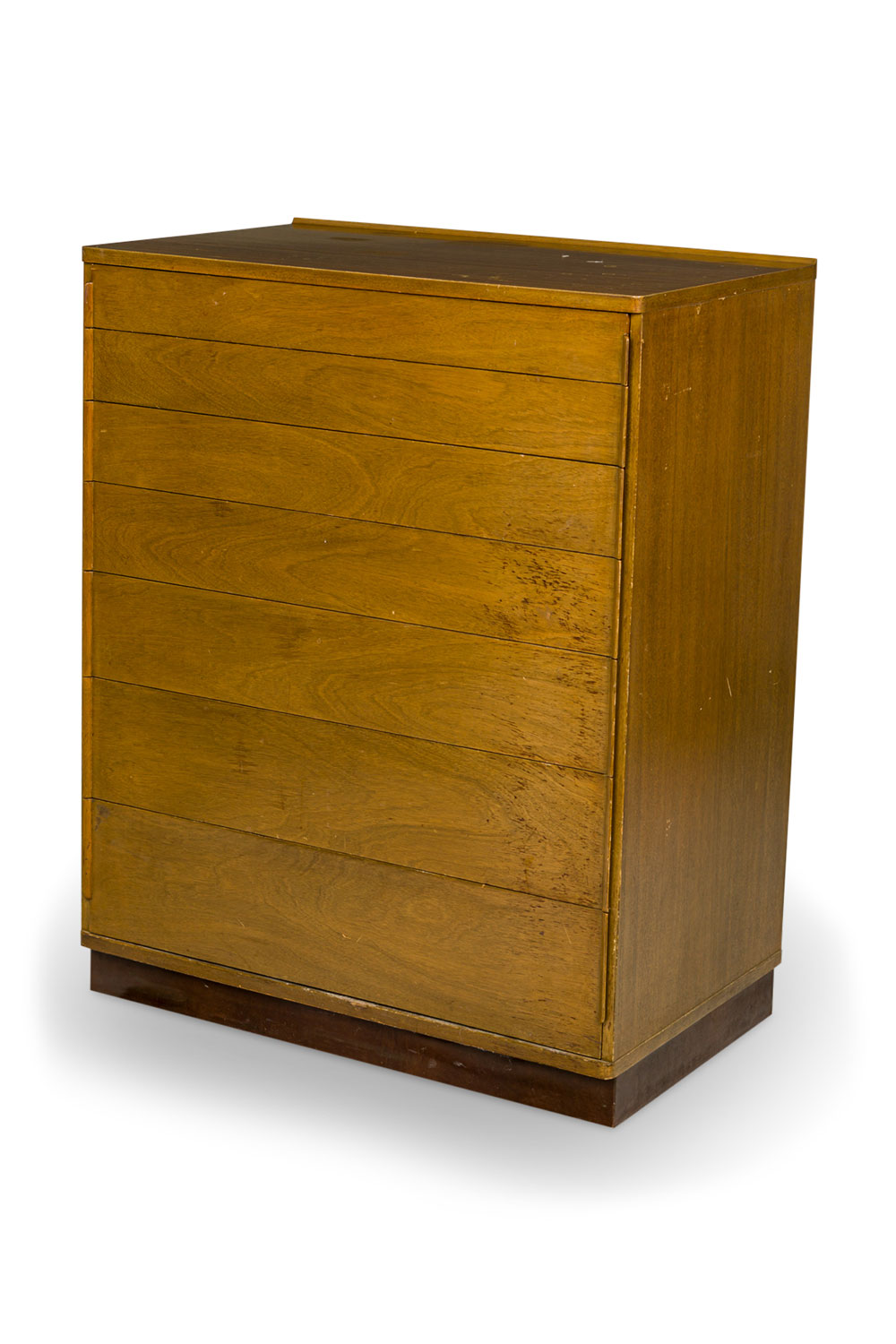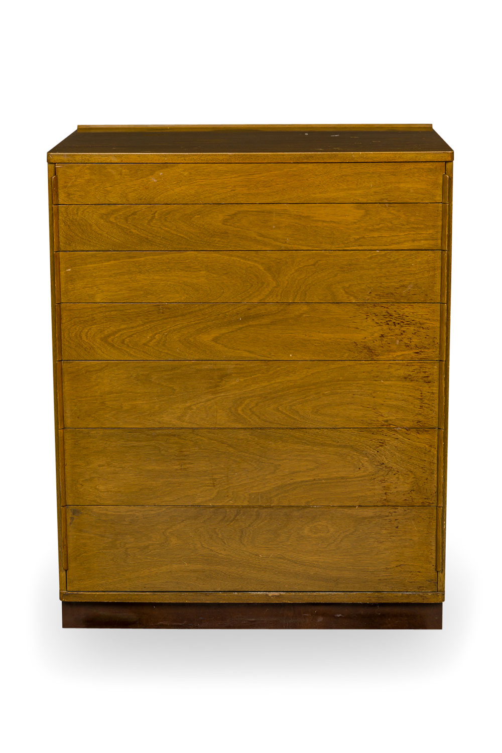 PAIR of American Mid-Century 7-drawer chests with walnut veneer, and drawers in graduating size with thin plywood drawer pulls on the sides of each drawer front, resting on a brown leather-wrapped plinth. (EDWARD WORMLEY FOR DUNBAR FURNITURE COMPANY)(PRICED AS PAIR).