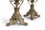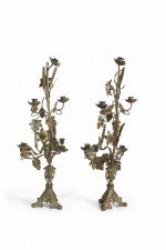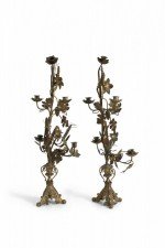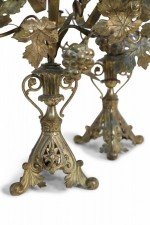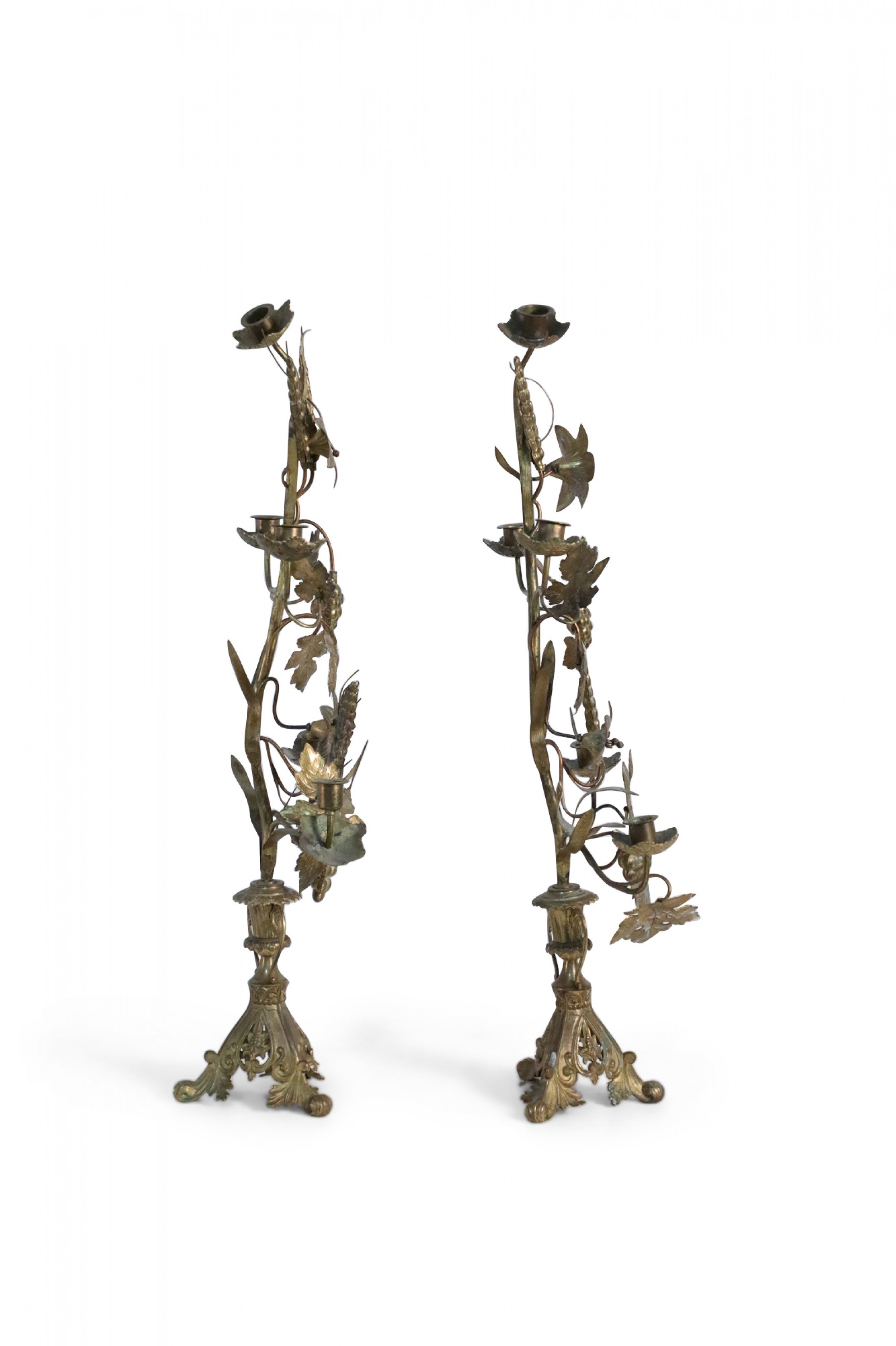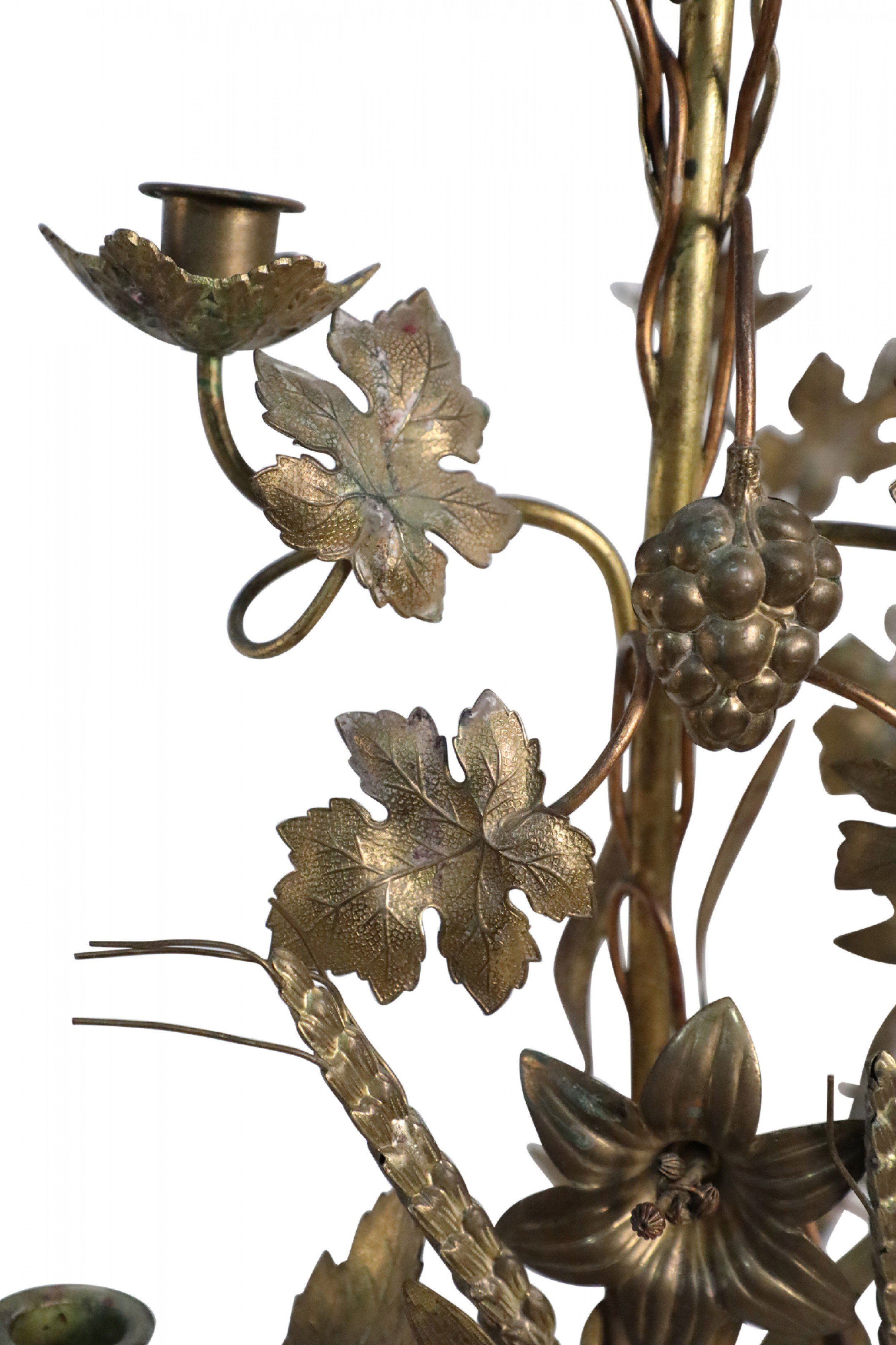 PAIR of French Provincial bronze harvest motif 5-armcandelabras with decorative grape vines and leaves, wheat sheafs, and lilies intertwined above a triangular. (PRICED AS PAIR).