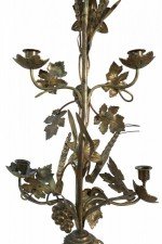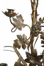 PAIR of French Provincial bronze harvest motif 5-armcandelabras with decorative grape vines and leaves, wheat sheafs, and lilies intertwined above a triangular. (PRICED AS PAIR)