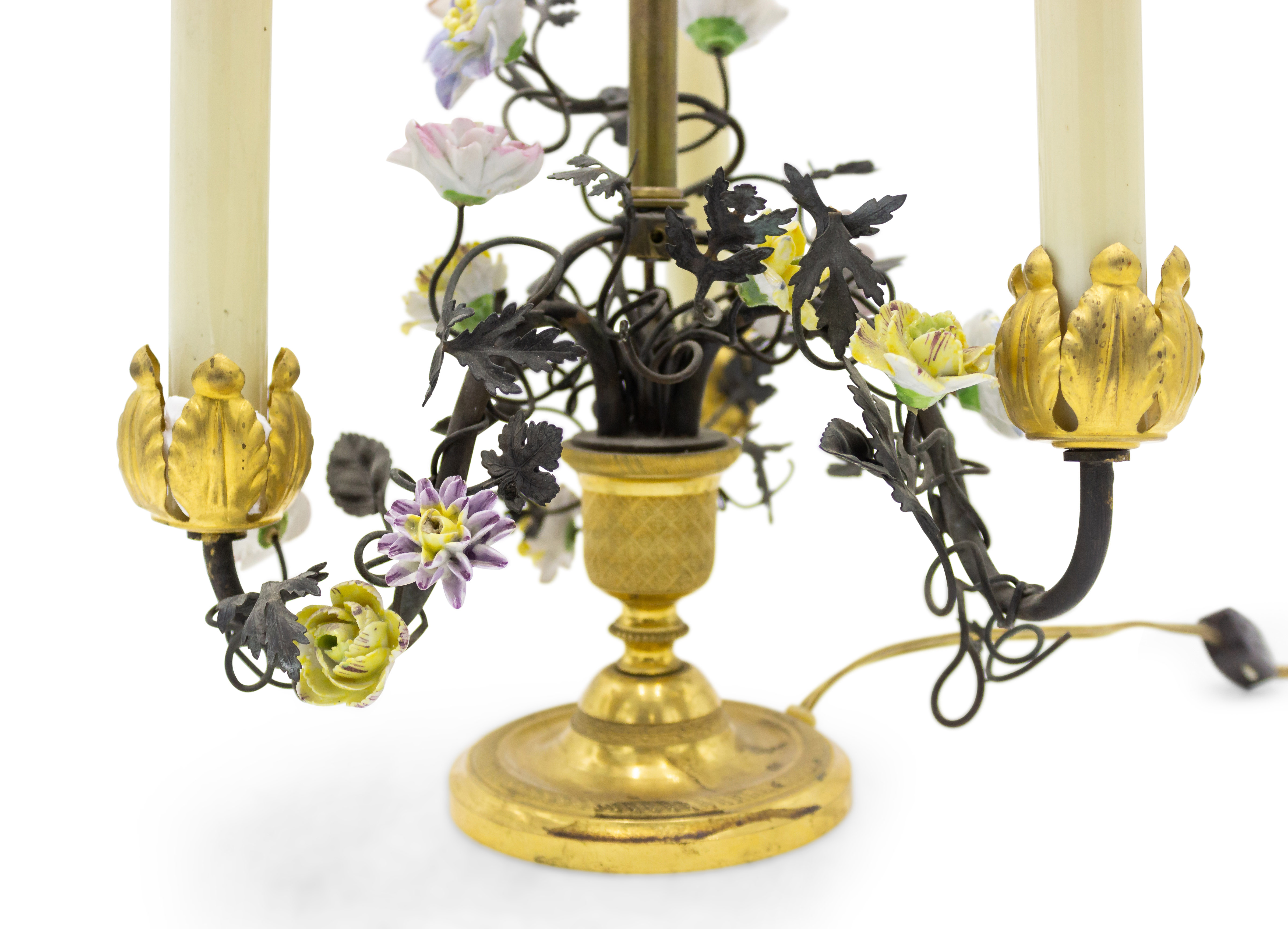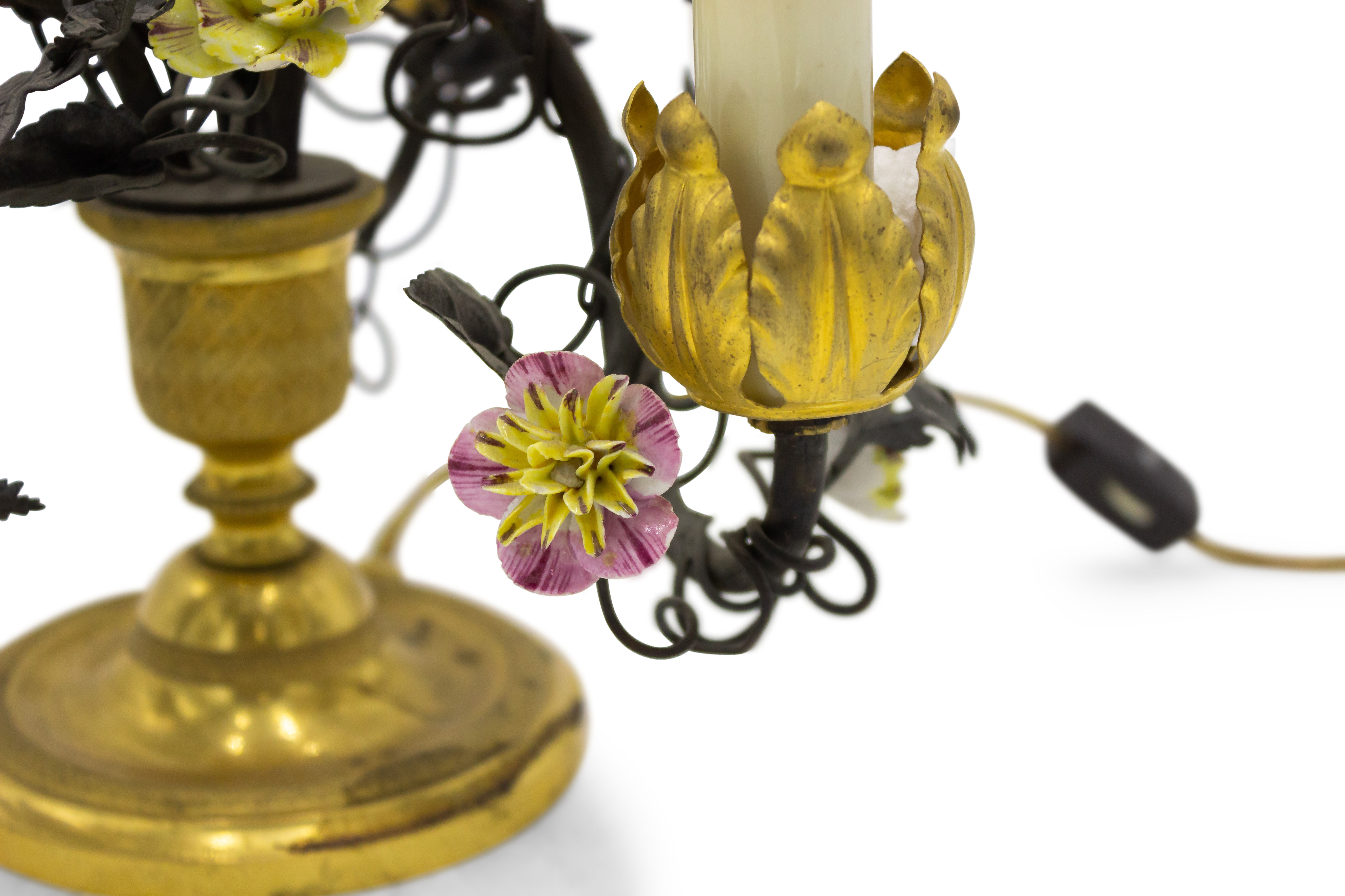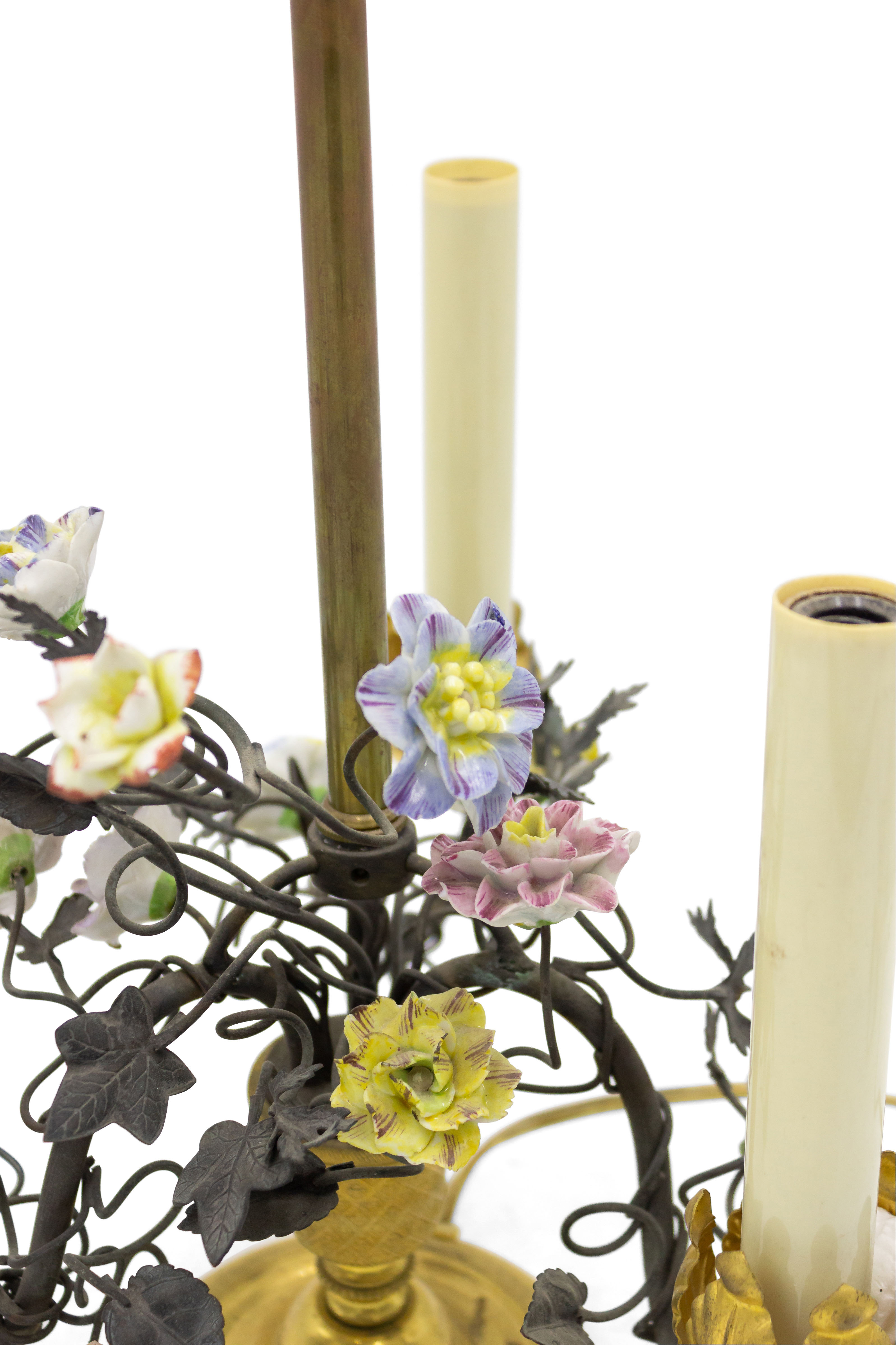 PAIR of French Victorian (19/20th Century) three-light lamps with metal foliate arms & porcelain flowers on a round bronze base (PRICED AS PAIR).