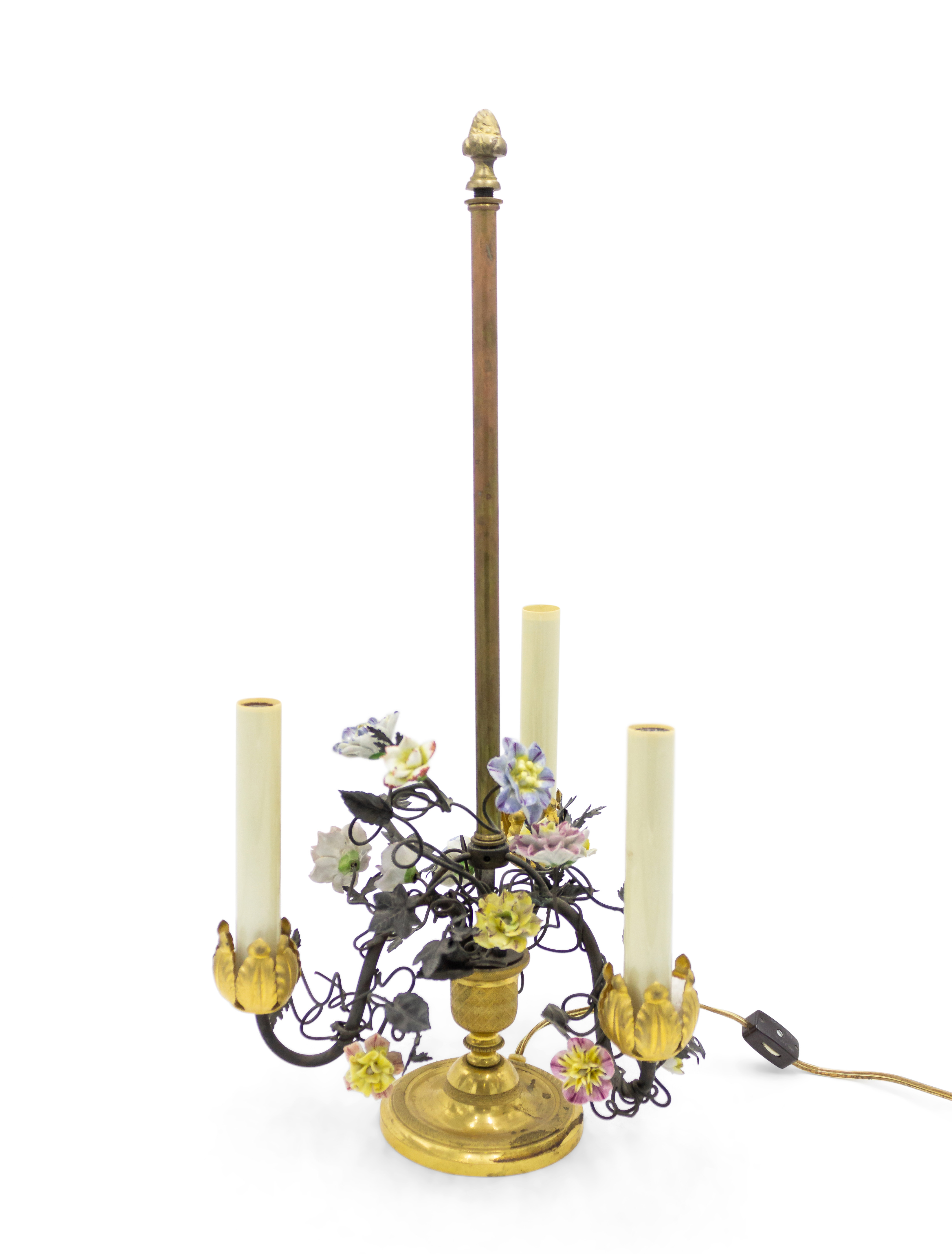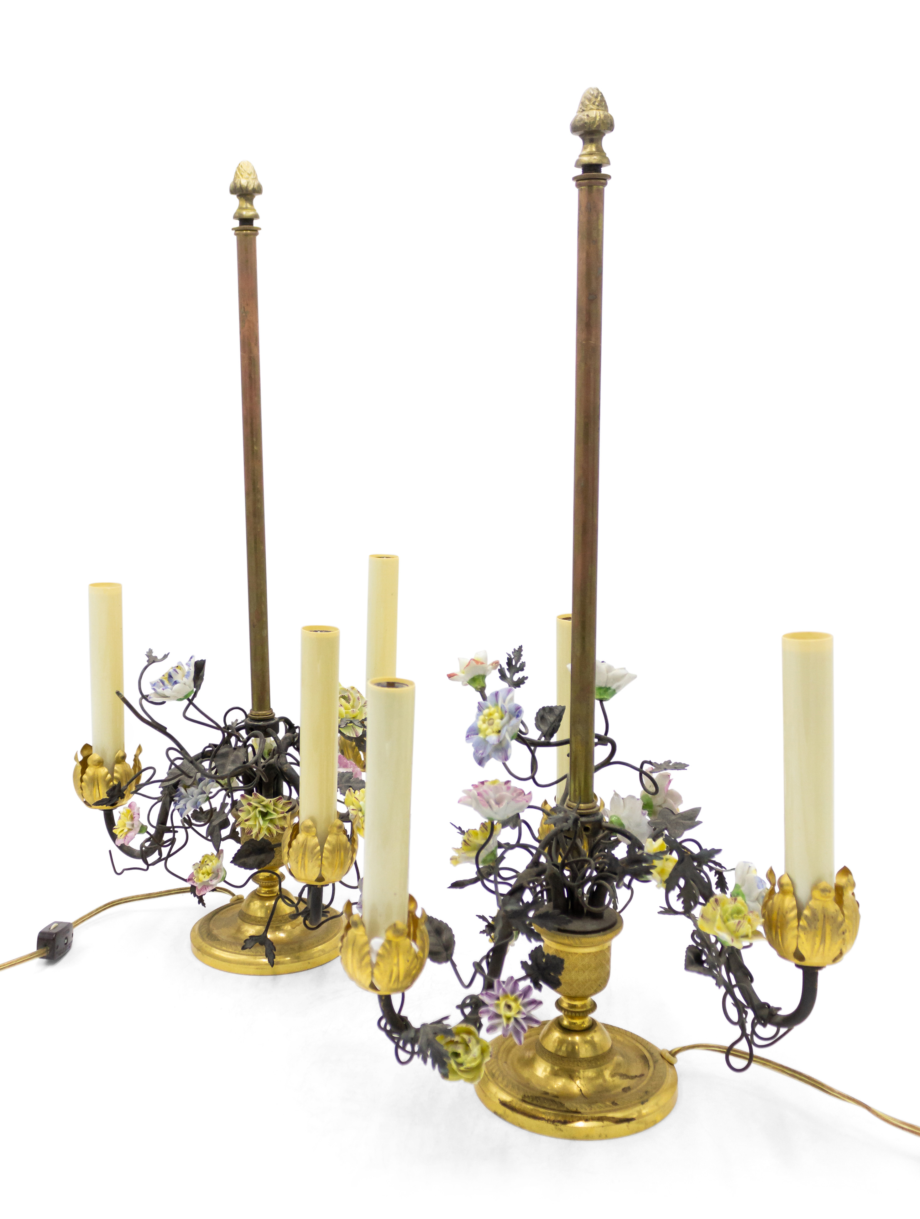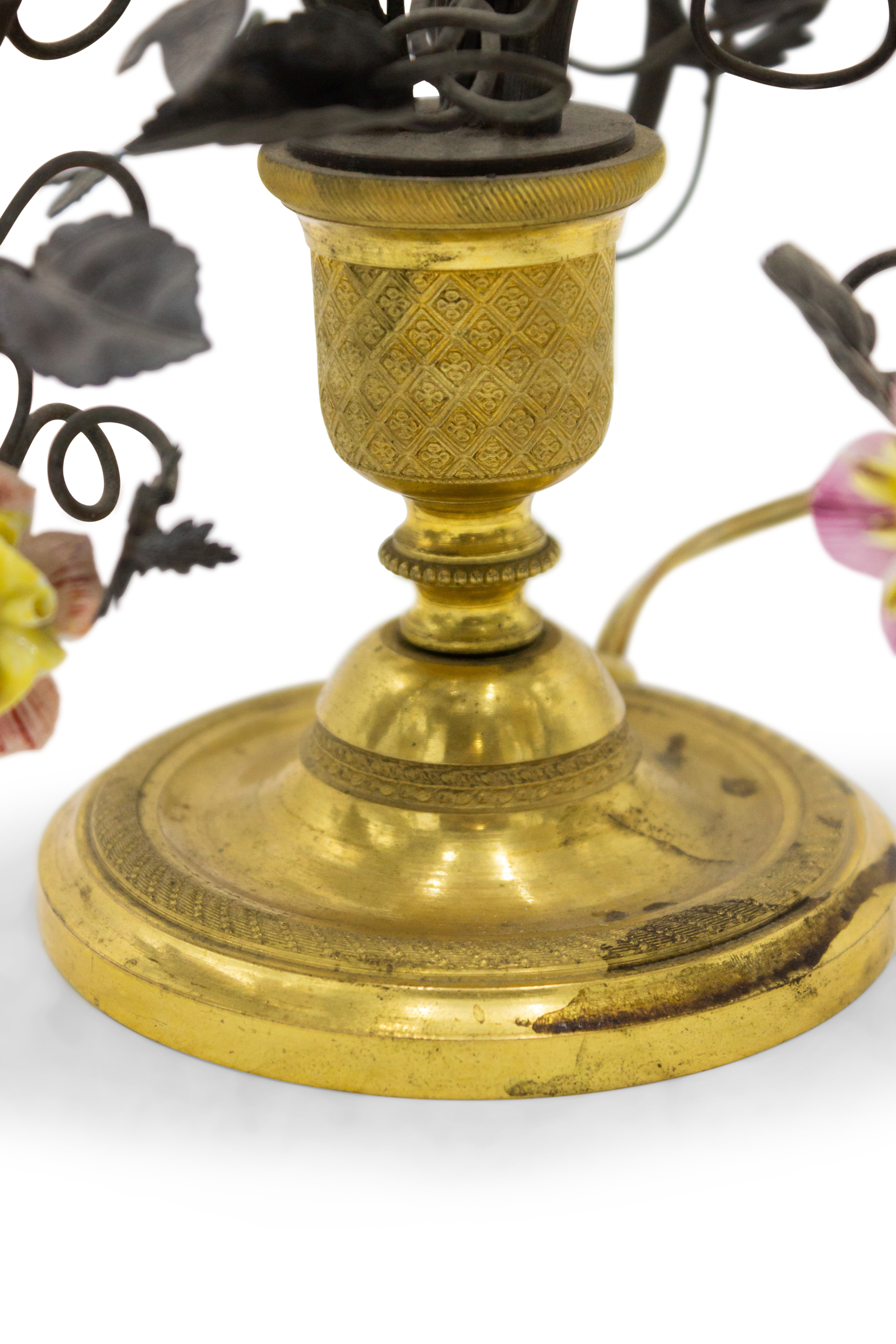 PAIR of French Victorian (19/20th Century) three-light lamps with metal foliate arms & porcelain flowers on a round bronze base (PRICED AS PAIR).
