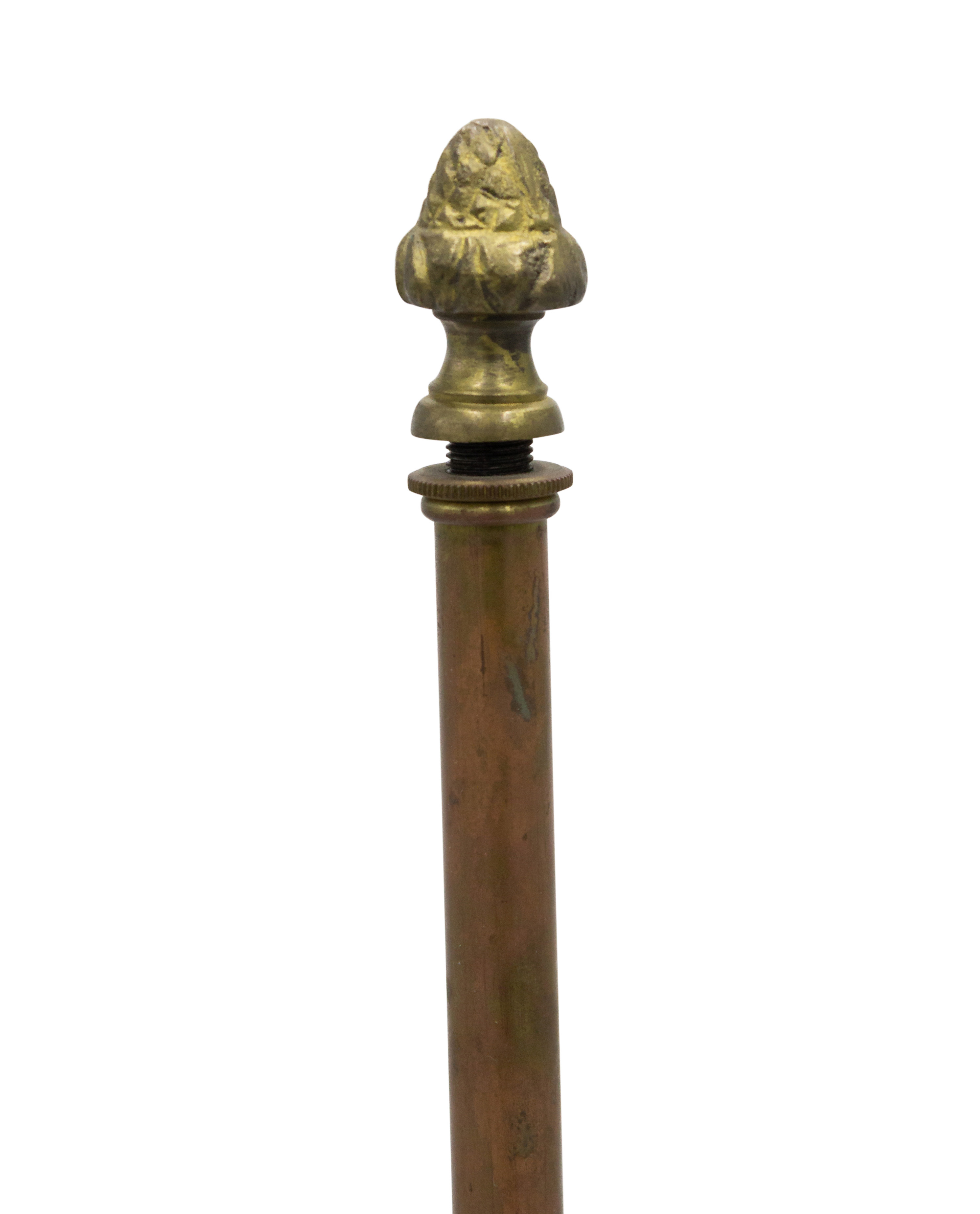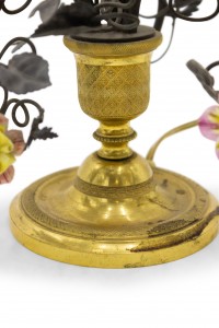 PAIR of French Victorian (19/20th Century) three-light lamps with metal foliate arms & porcelain flowers on a round bronze base (PRICED AS PAIR)..
