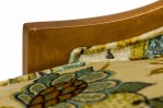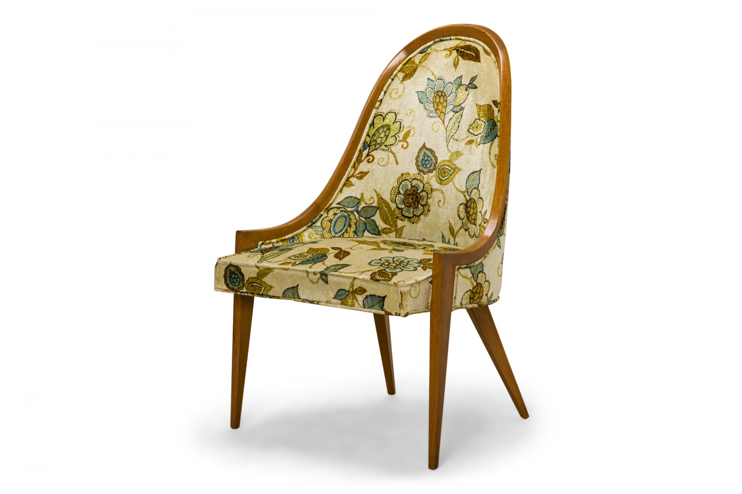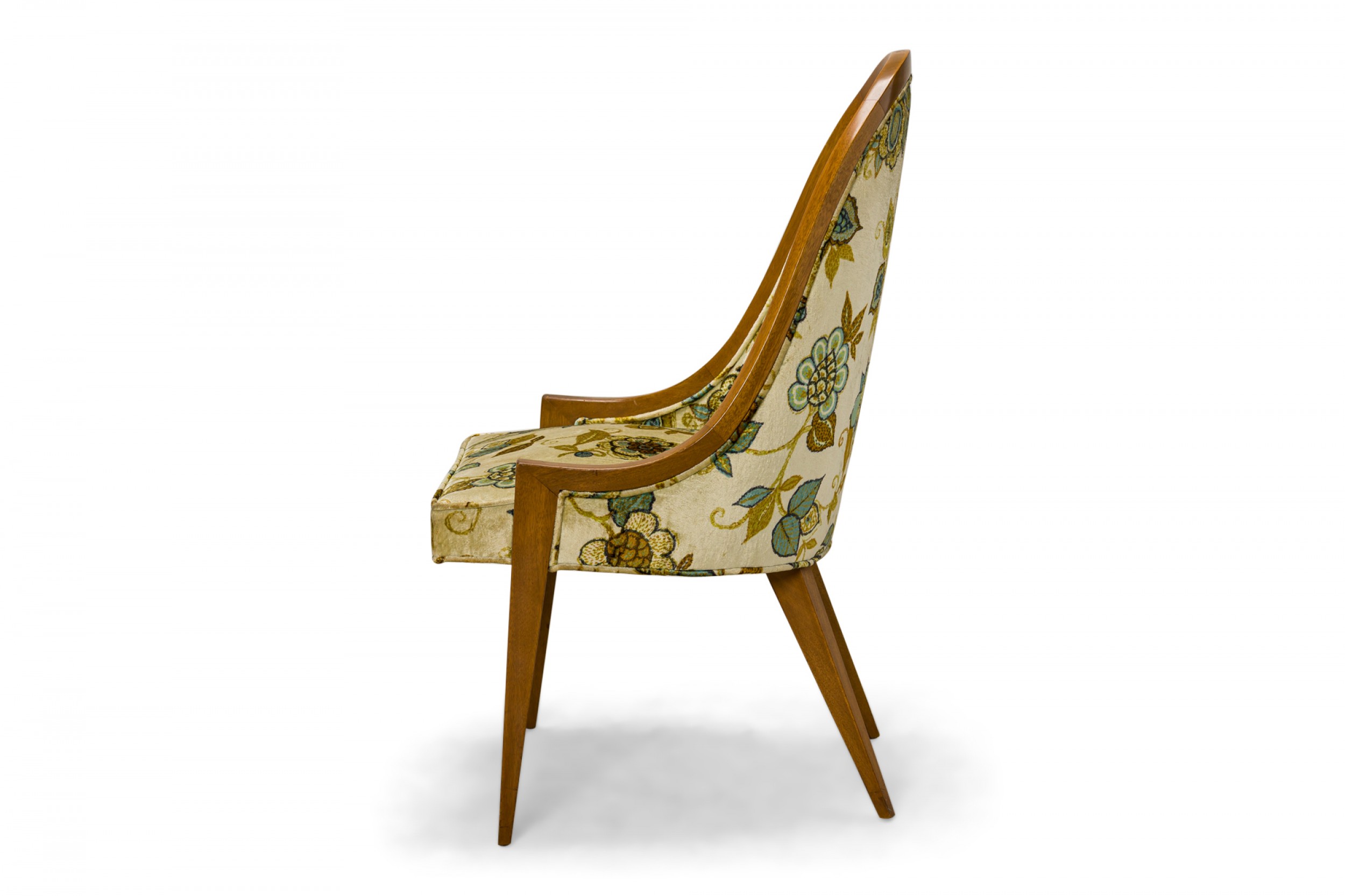 PAIR of American Mid-Century 'Gondola' pull up / side chairs with curved light mahogany frames and beige, brown, green, and blue floral print fabric upholstered seat backs and cushions, resting on four tapered mahogany dowel legs. (HARVEY PROBBER)(PRICED AS PAIR)(Similar pieces: DUF0423-DUF0426).
