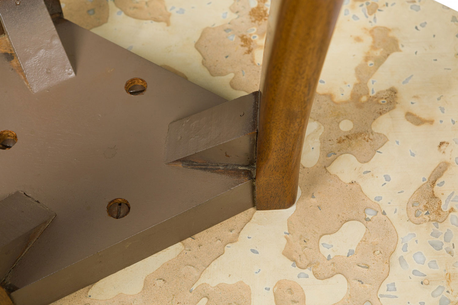 Style: Mid-Century Materials & Techniques: Bronze, marble, wood Category: Tables Condition: Slight difference in finish on wooden legs. Good; Wear consistent with age and use